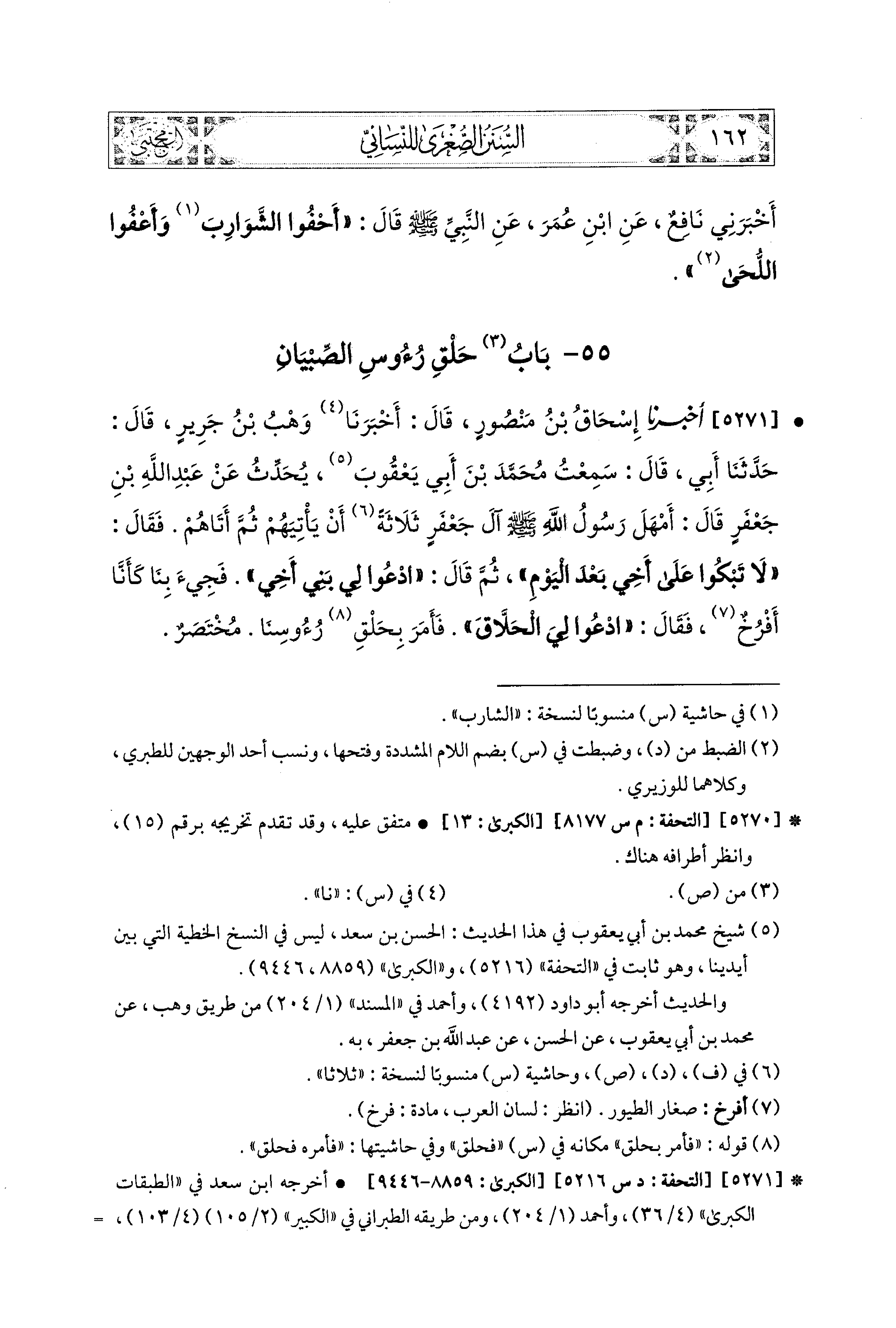 5271- أَخبَرَنا إِسحَاقُ بنُ مَنْصُورٍ، قَالَ: أَخبرنا وَهْبُ بنُ جَرِيرٍ، قال: حَدَّثنا أَبي، قَالَ: سَمِعْتُ مُحَمدَ بْنَ أَبي يَعقُوبَ يُحَدِّثُ، عَنِ الحَسَنِ بْنِ سَعْدٍ (1)، عَن عَبد اللهِ بن جَعْفَرٍ، قَالَ: أَمْهَلَ رَسُولُ اللهِ صَلى الله عَليه وسَلم آلَ جَعْفَرٍ ثَلاَثَةً أَنْ يَأْتِيَهُمْ، ثُمَّ أَتَاهُمْ، فَقَالَ: لاَ تَبْكُوا عَلَى أَخِي بَعْدَ اليَوْمِ، ثُمَّ قَالَ: ادْعُوا لِي بَنِي أَخِي، فَجِيءَ بِنَا كَأَنَّا أَفْرُخٌ، فَقَالَ: ادْعُوا لِي الحَلاَّقَ، فَأَمَرَ بِحَلْقِ رُؤُوسِنَا.