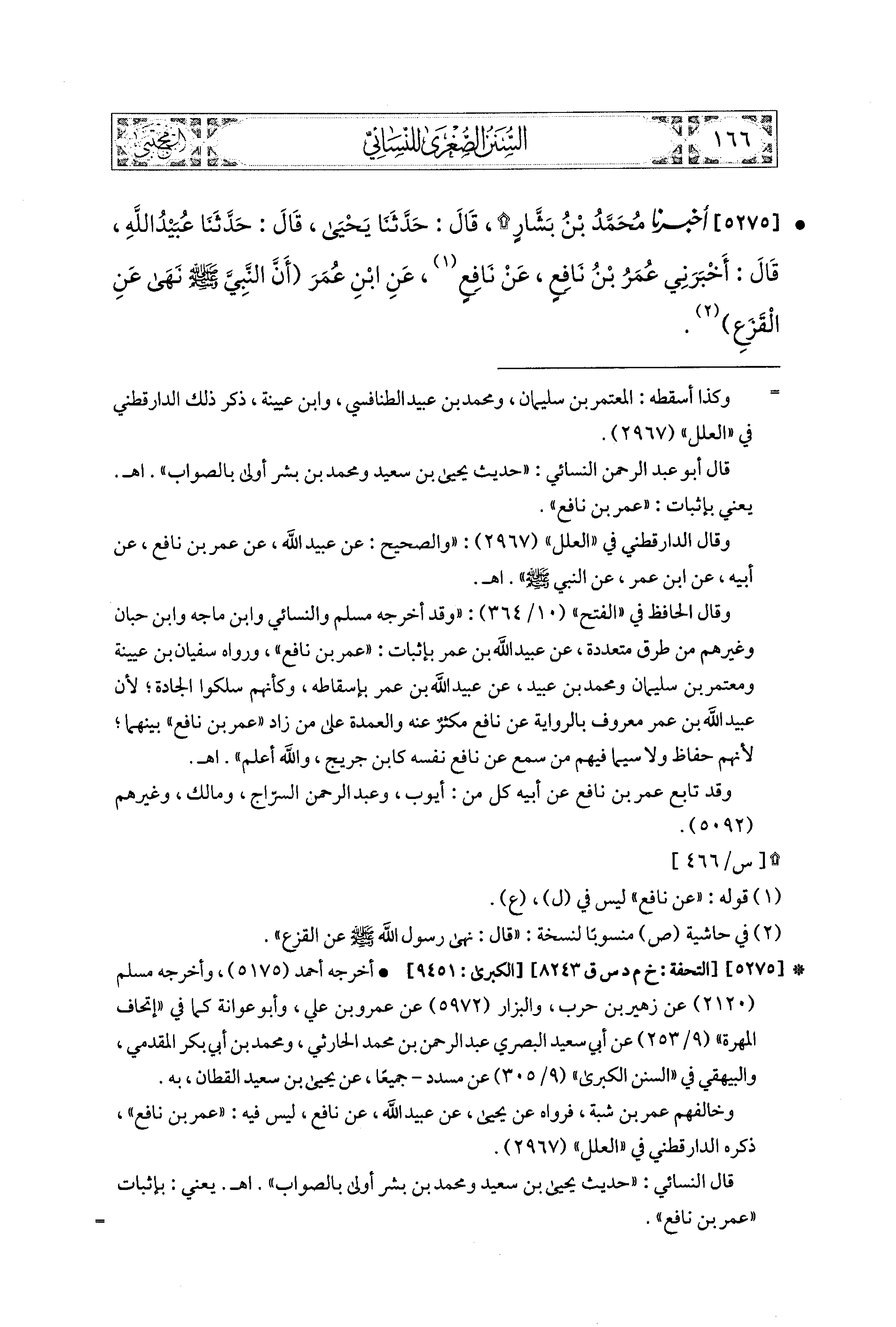 5275- أَخبَرَنا مُحَمد بنُ بَشَّارٍ، قال: حَدَّثنا يَحيَى، قال: حَدَّثنا عُبَيدُ اللهِ، قَالَ: أَخْبَرَنِي عُمَرُ بنُ نَافِعٍ، عَن نَافِعٍ، عَنِ ابنِ عُمَرَ، أَنَّ النَّبيَّ صَلى الله عَليه وسَلم نَهَى عَنِ القَزَعِ.