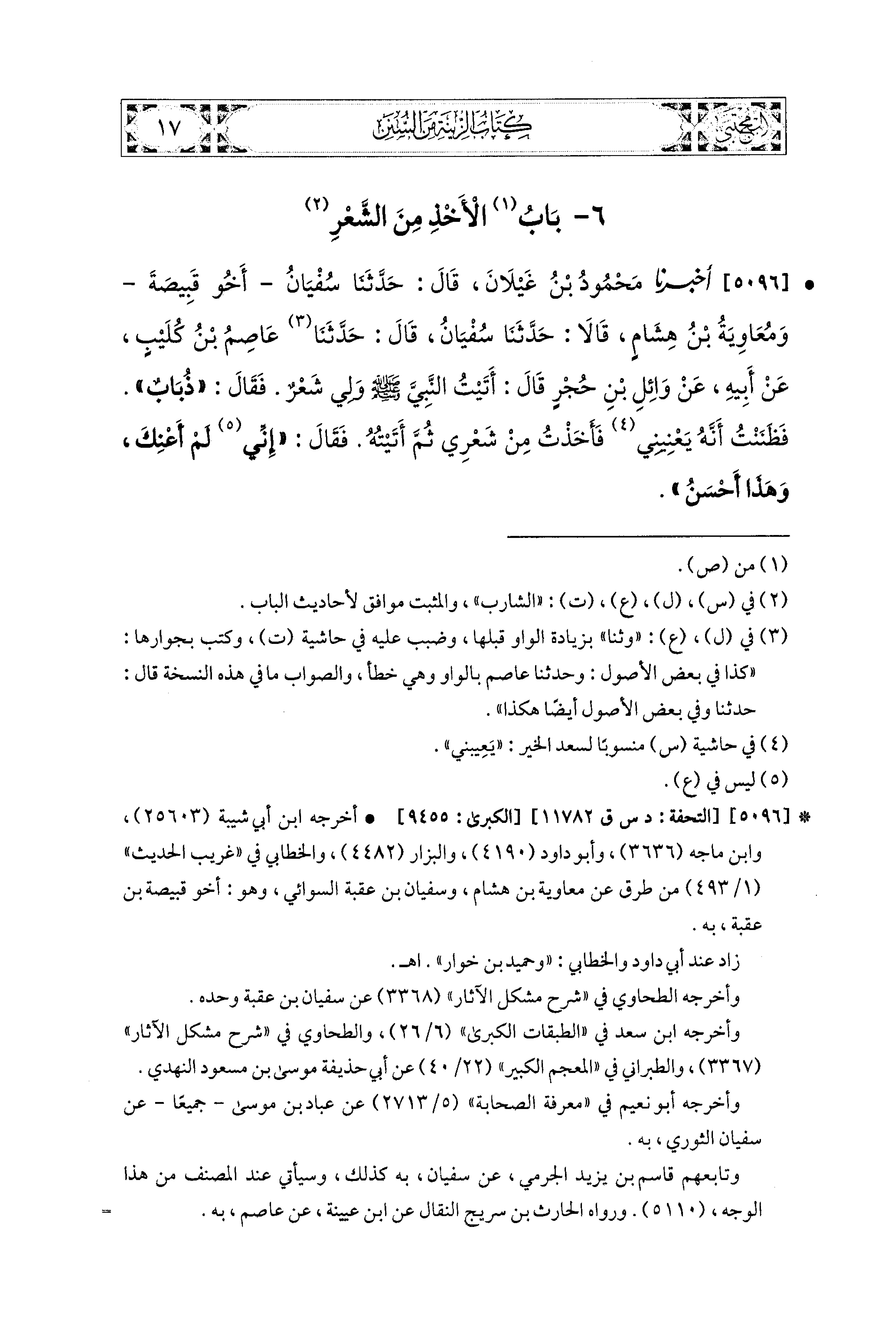 5096- أَخبَرَنا مَحْمُودُ بنُ غَيْلاَنَ، قال: حَدَّثنا سُفيَانُ، أَخُو قَبِيصَةَ، وَمُعَاوِيَةُ بنُ هِشَامٍ، قَالاَ: حَدَّثنا سُفيان، قال: حَدَّثنا عَاصِمُ بنُ كُلَيْبٍ، عَن أَبيهِ، عَن وَائِلِ بْنِ حُجْرٍ قَالَ: أَتَيْتُ النَّبيَّ صَلى الله عَليه وسَلم وَلِي شَعْرٌ، فَقَالَ ذُبَابٌ: فَظَنَنْتُ أَنَّهُ يَعْنِينِي، فَأَخَذْتُ مِنْ شَعْرِي، ثُمَّ أَتَيْتُهُ، فَقَالَ: إِنِّي لَمْ أَعْنِكَ، وَهَذَا أَحْسَنُ.