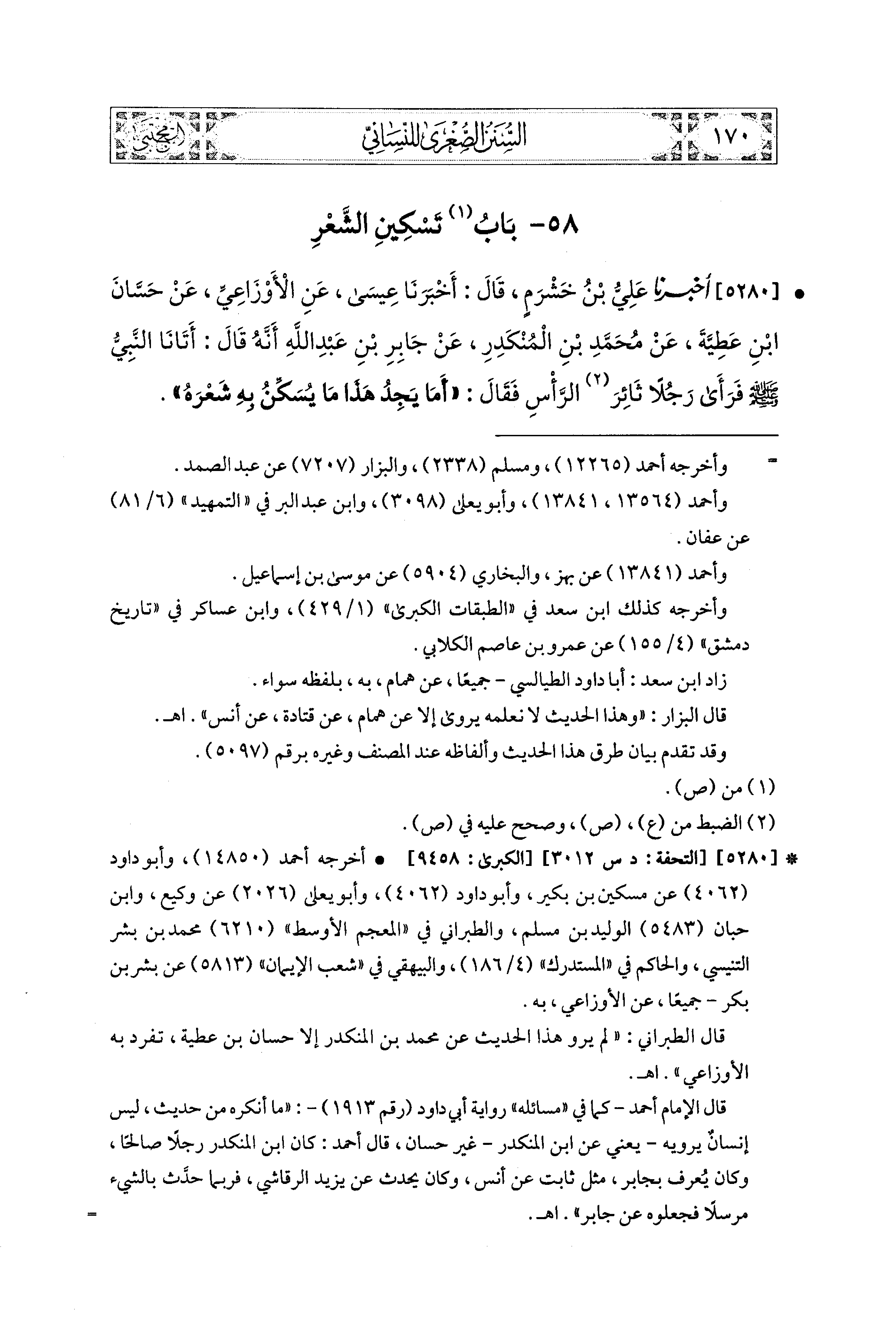 5280- أَخبَرَنا عَلِيُّ بنُ خَشْرَمٍ، قَالَ: أَخبرَنا عِيسَى، عَنِ الأَوْزَاعِيِّ، عَن حَسَّانَ بْنِ عَطِيَّةَ، عَن مُحَمدِ بْنِ المُنْكَدِرِ، عَن جَابِرِ بْنِ عَبدِ اللهِ، أَنَّهُ قَالَ: أَتَانَا النَّبيُّ صَلى الله عَليه وسَلم فَرَأَى رَجُلاً ثَائِرَ الرَّأْسِ، فَقَالَ: أَمَا يَجِدُ هَذَا مَا يُسَكِّنُ بِهِ شَعْرَهُ.