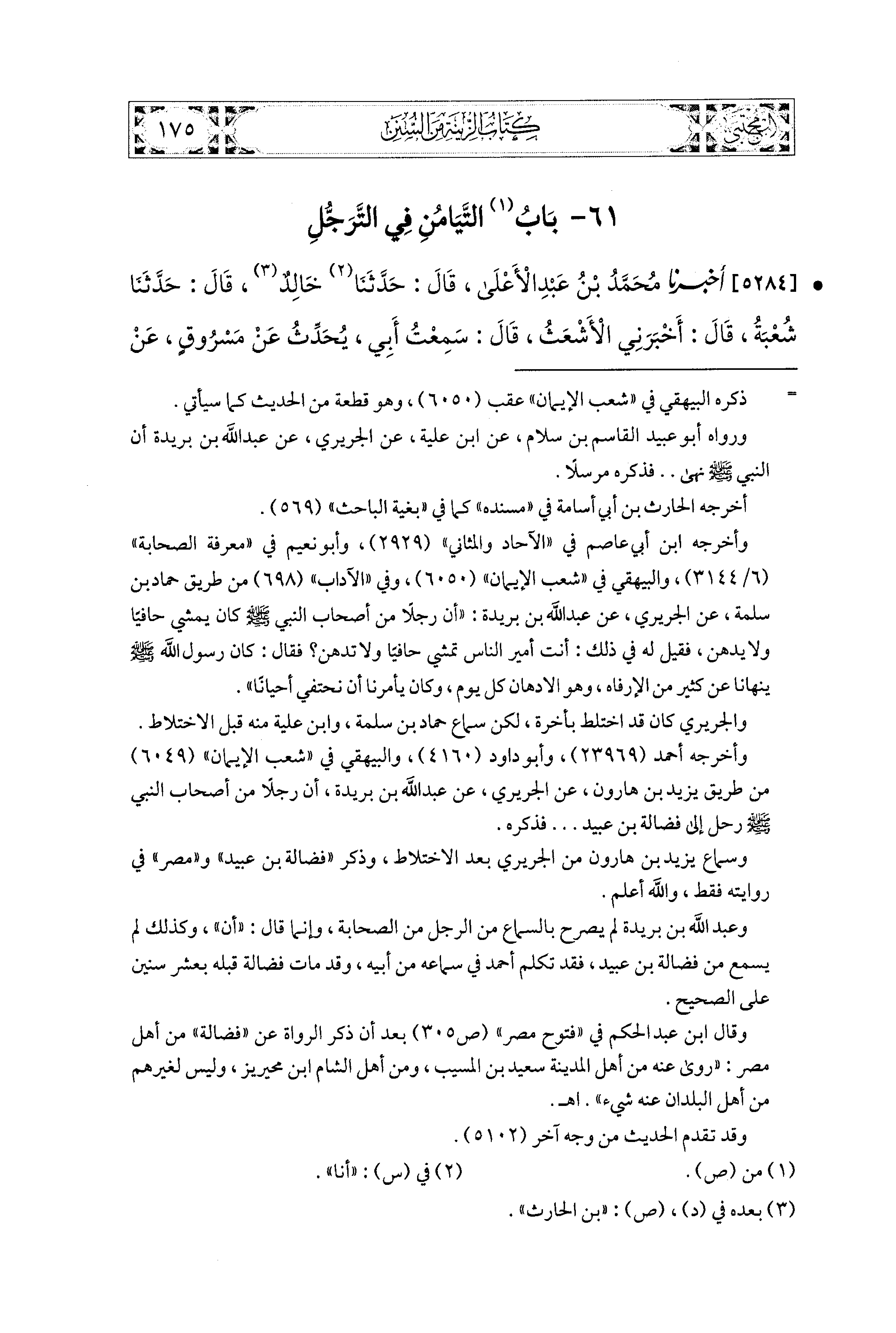 5284- أَخبَرَنا مُحَمد بن عَبدِ الأَعلَى، قال: حَدَّثنا خَالِدٌ، قال: حَدَّثنا شُعبَةُ، قَالَ: أَخْبَرَنِي الأَشْعَثُ، قَالَ: سَمِعْتُ أَبي يُحَدِّثُ، عَن مَسْرُوقٍ، عَن عَائِشَةَ، أَنَّ وَذَكَرَ رَسُولَ اللهِ صَلى الله عَليه وسَلم كَانَ يُحِبُّ التَّيَامُنَ مَا اسْتَطَاعَ فِي طُهُورِهِ، وَنَعْلِهِ، وَتَرَجُّلِهِ.