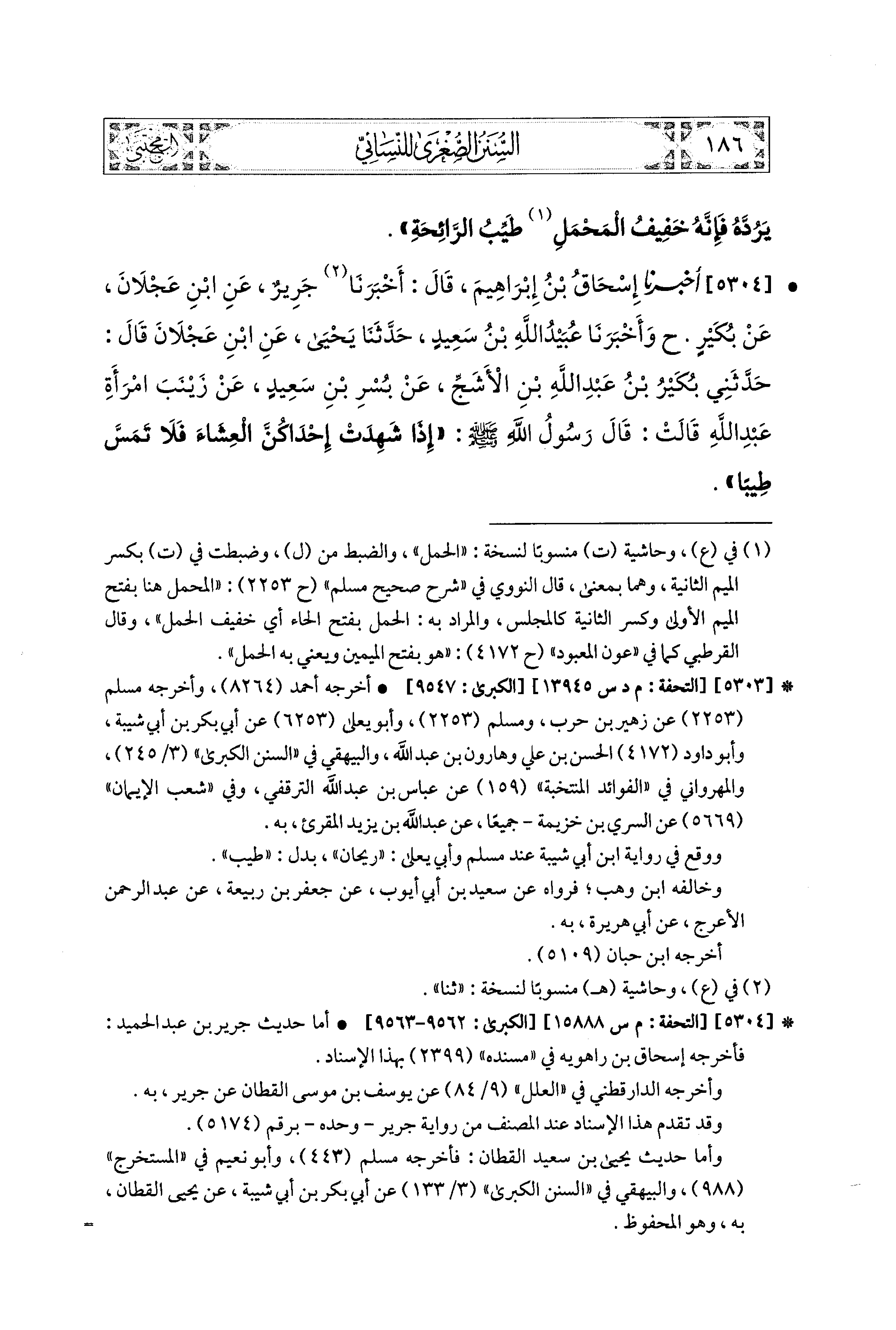 5304- أَخبَرَنا إِسحَاقُ بنُ إِبراهِيمَ، قَالَ: أَخبرنا جَرِيرٌ، عَنِ ابنِ عَجْلاَنَ، عَن بُكَيْرٍ (ح) وَأَخبرنا عُبَيدُ اللهِ بنُ سَعيدٍ، حَدَّثنا يَحيَى، عَنِ ابنِ عَجْلاَنَ، قَالَ: حَدَّثني بُكَيْرُ بنُ عَبدِ اللهِ بْنِ الأَشَجِّ، عَن بُسْرِ بْنِ سَعيدٍ، عَن زَيْنَبَ، امْرَأَةِ عَبدِ اللهِ قَالَتْ: قَالَ رَسُولُ اللهِ صَلى الله عَليه وسَلم: إِذَا شَهِدَتْ إِحْدَاكُنَّ العِشَاءَ فَلاَ تَمَسَّ طِيبًا.