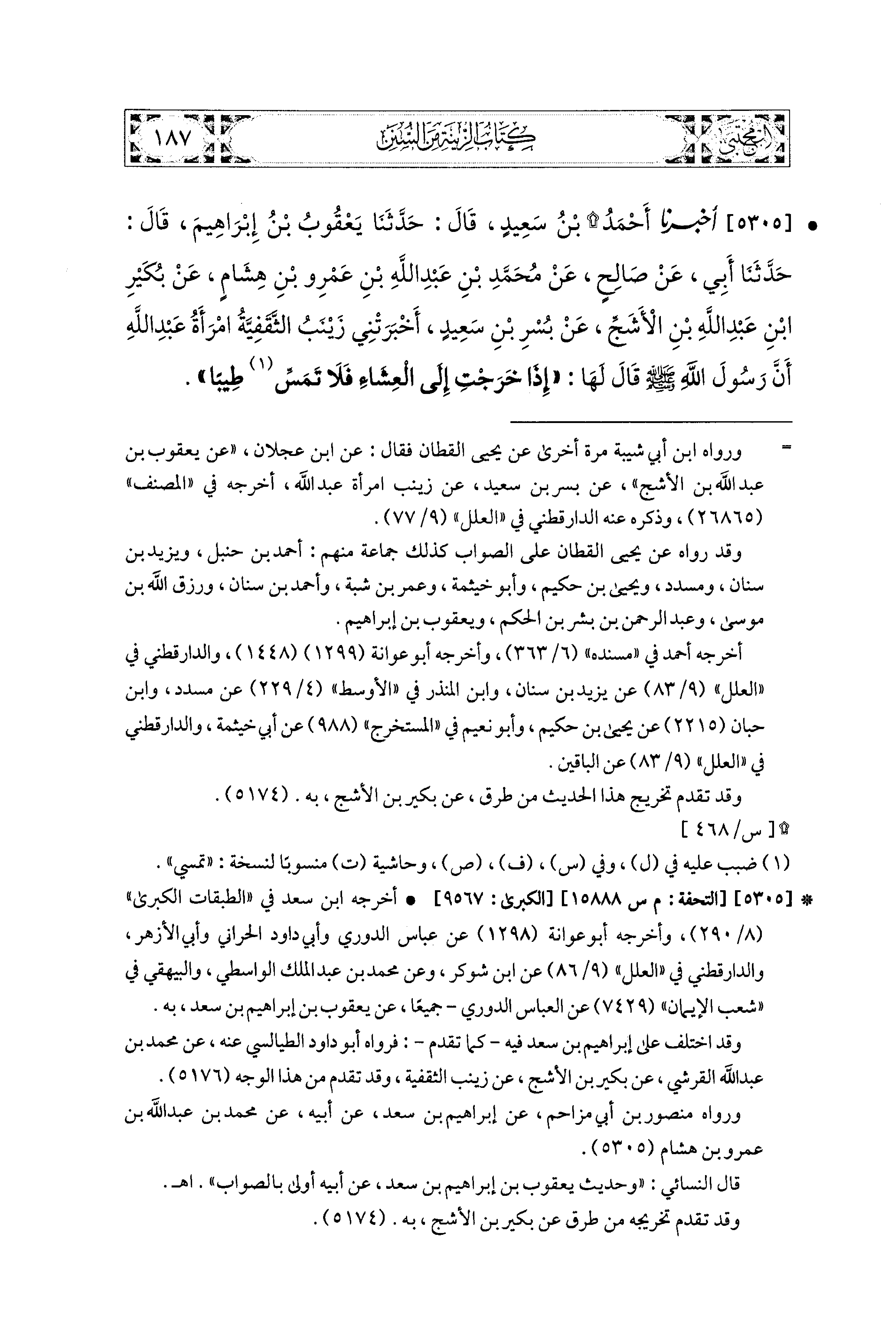 5305- أَخبَرَنا أَحْمَدُ بنُ سَعيدٍ، قال: حَدَّثنا يَعقُوبُ بنُ إِبراهِيمَ، قال: حَدَّثنا أَبي، عَن صَالِحٍ، عَن مُحَمدِ بْنِ عَبدِ اللهِ بْنِ عَمْرِو بْنِ هِشَامٍ، عَن بُكَيْرِ بْنِ عَبدِ اللهِ بْنِ الأَشَجِّ، عَن بُسْرِ بْنِ سَعيدٍ، أَخْبَرَتْنِي زَيْنَبُ الثَّقَفِيَّةُ، امْرَأَةُ عَبدِ اللهِ، أَنَّ رَسُولَ اللهِ صَلى الله عَليه وسَلم قَالَ لَهَا: إِذَا خَرَجْتِ إِلَى العِشَاءِ، فَلاَ تَمَسِّ طِيبًا.