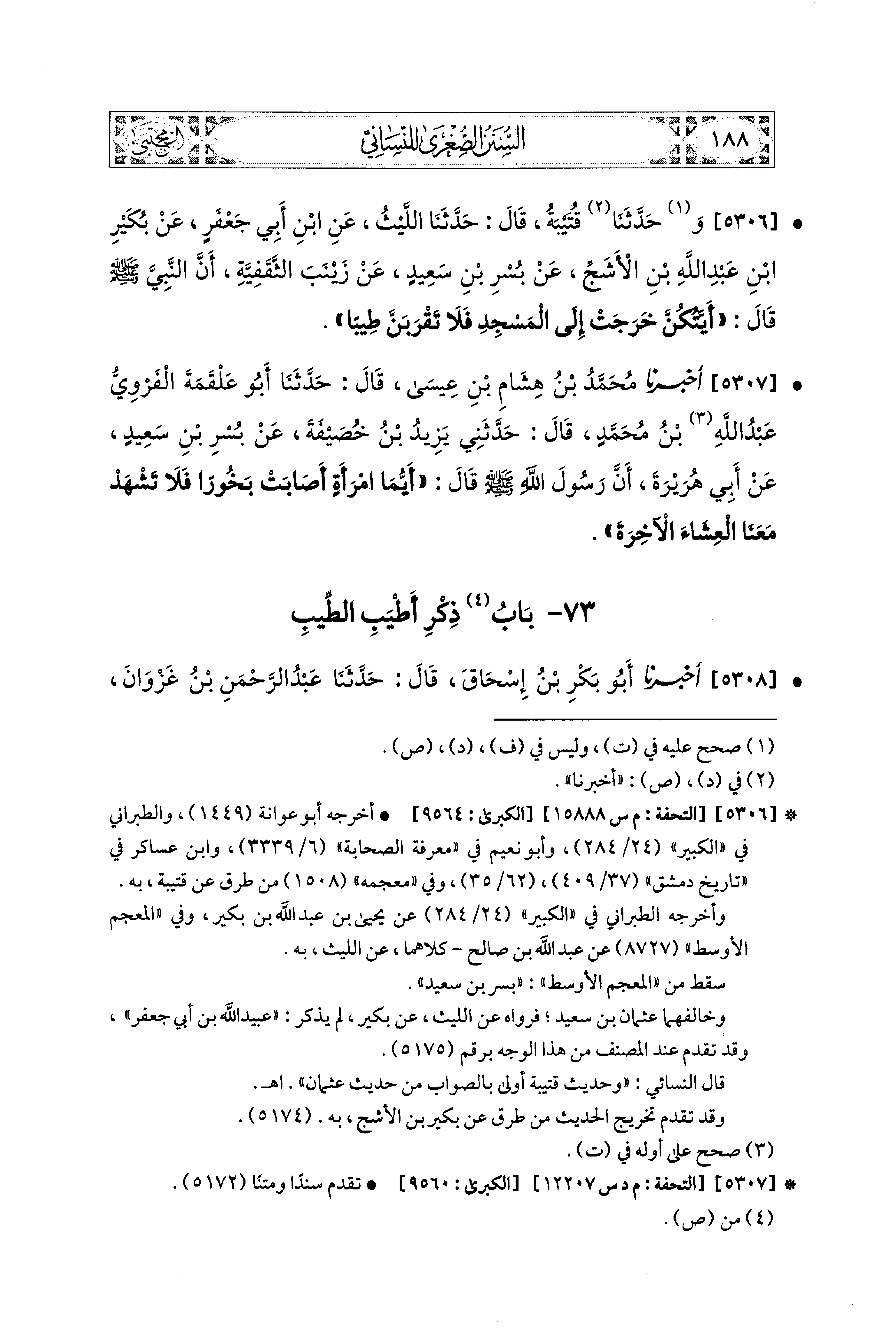 5307- أَخبَرَنا مُحَمد بنُ هِشَامِ بْنِ عِيسَى، قال: حَدَّثنا أَبو عَلْقَمَةَ الفَرْوِيُّ عَبدُ اللهِ بنُ مُحَمدٍ، قَالَ: حَدَّثني يَزِيدُ بنُ خُصَيْفَةَ، عَن بُسْرِ بْنِ سَعيدٍ، عَن أَبي هُرَيْرَةَ، أَنَّ رَسُولَ اللهِ صَلى الله عَليه وسَلم قَالَ: أَيُّمَا امْرَأَةٍ أَصَابَتْ بُخُورًا، فَلاَ تَشْهَدْ مَعَنَا العِشَاءَ الآخِرَةَ.