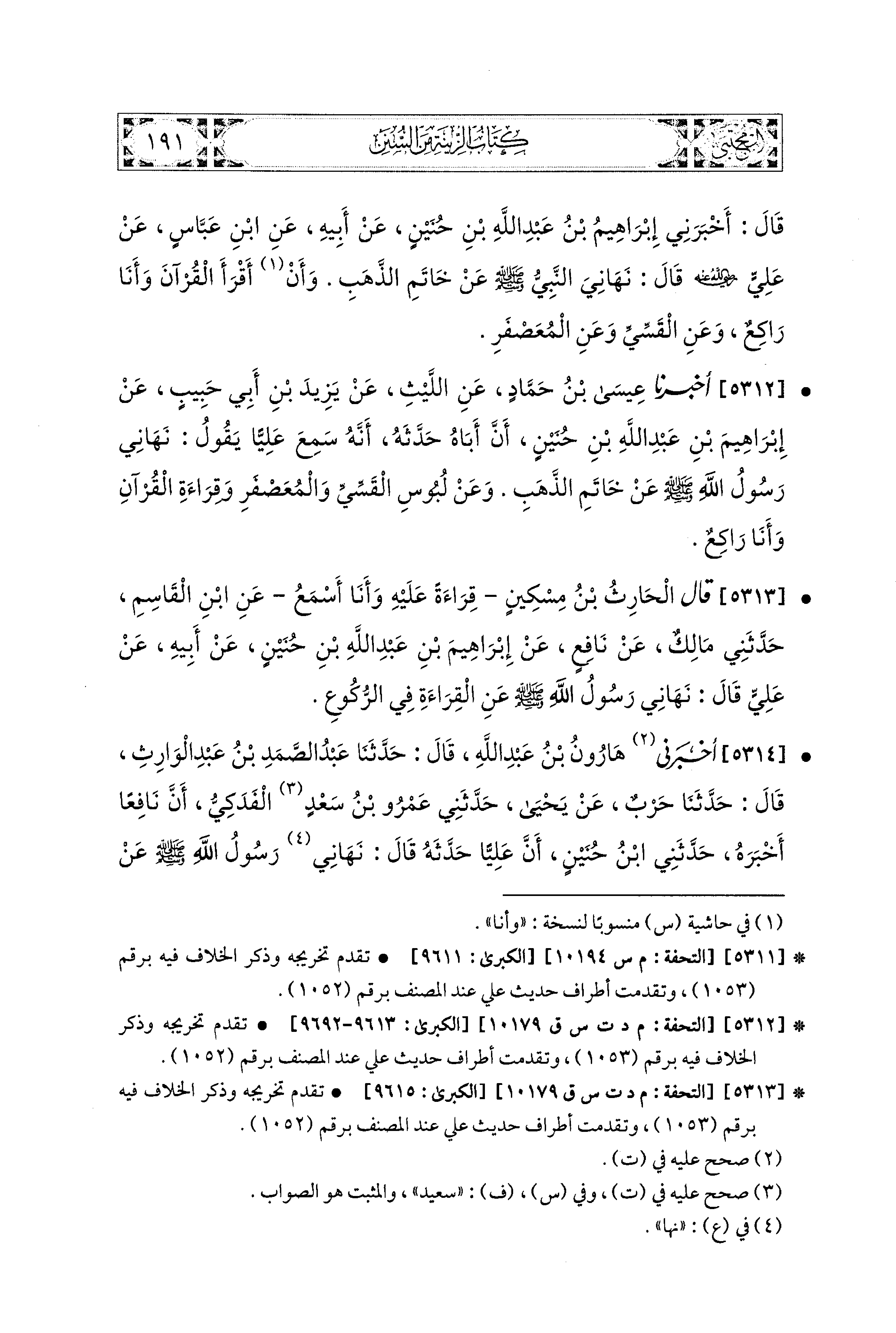 5312- أَخبَرَنا عِيسَى بنُ حَمَّادٍ، عَنِ اللَّيْثِ، عَن يَزِيدَ بْنِ أَبي حَبِيبٍ، عَن إِبراهِيمَ بْنِ عَبدِ اللهِ بْنِ حُنَيْنٍ، أَنَّ أَبَاهُ حَدَّثَهُ أَنَّهُ، سَمِعَ عَلِيًّا، يَقُولُ: نَهَانِي رَسُولُ اللهِ صَلى الله عَليه وسَلم عَن خَاتَمِ الذَّهَبِ، وَعَن لُبُوسِ القَسِّيِّ، وَالمُعَصْفَرِ، وَقِرَاءَةِ القُرْآنِ وَأَنَا رَاكِعٌ.