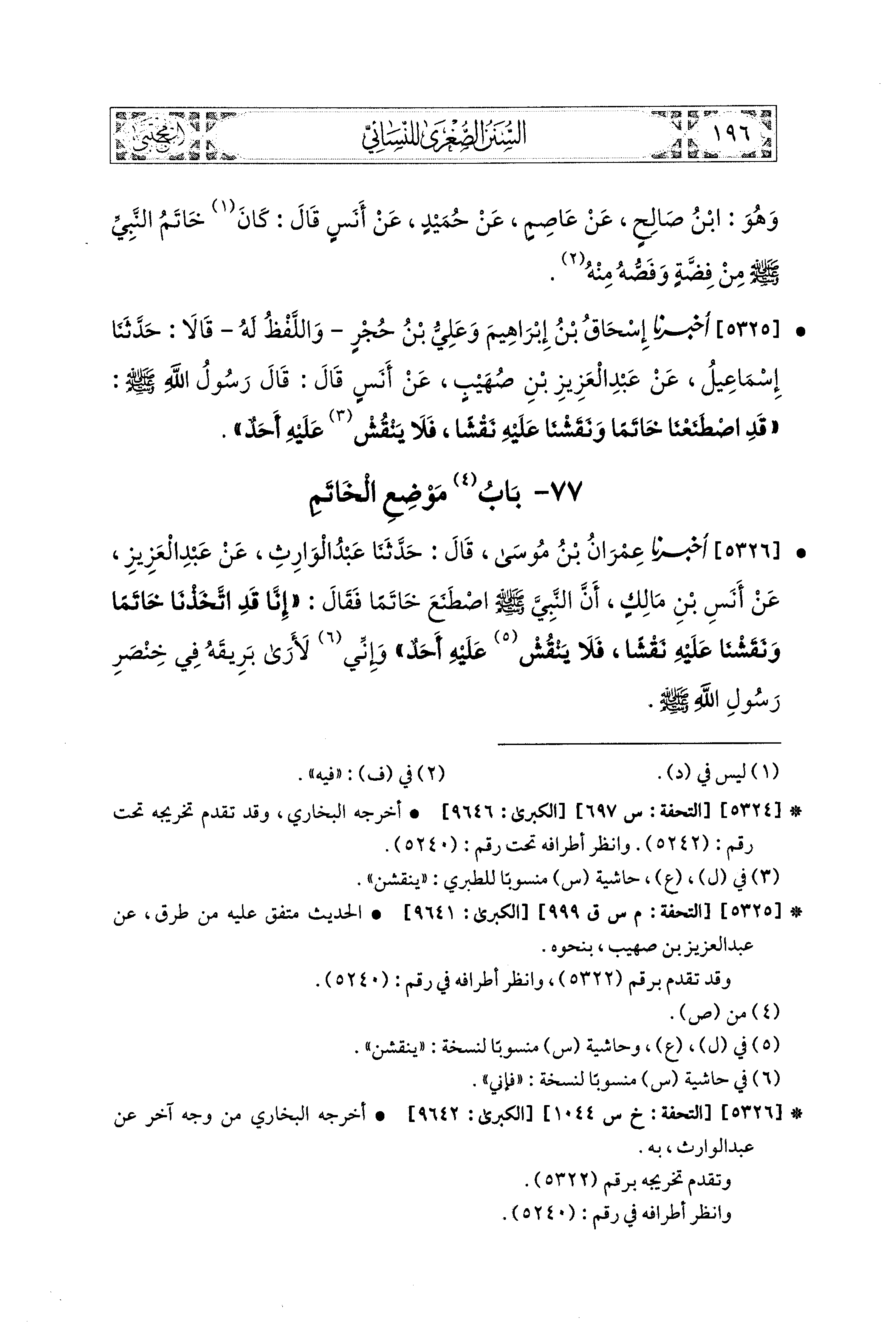 5326- أَخبَرَنا عِمْرَانُ بنُ مُوسَى، قال: حَدَّثنا عَبدُ الوَارِثِ، عَن عَبدِ العَزِيزِ، عَن أَنَسِ بْنِ مَالِكٍ، أَنَّ النَّبيَّ صَلى الله عَليه وسَلم اصْطَنَعَ خَاتَمًا، فَقَالَ: إِنَّا قَدِ اتَّخَذْنَا خَاتَمًا، وَنَقَشْنَا عَلَيهِ نَقْشًا، فَلاَ يَنْقُشْ عَلَيهِ أَحَدٌ، وَإِنِّي لأَرَى بَرِيقَهُ فِي خِنْصَرِ رَسُولِ اللهِ صَلى الله عَليه وسَلم.