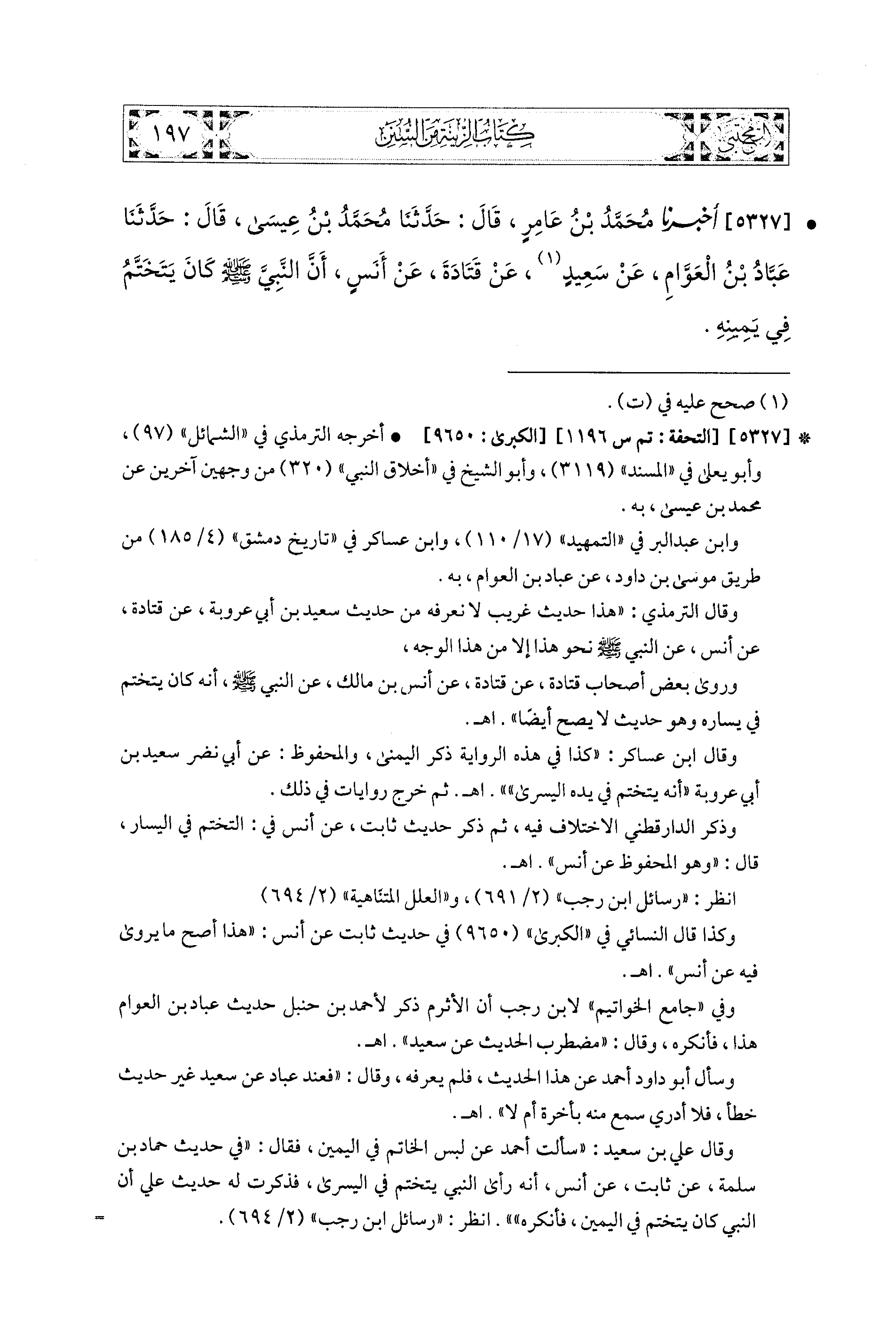 5327- أَخبَرَنا مُحَمد بنُ عَامِرٍ، قال: حَدَّثنا مُحَمدُ بنُ عِيسَى، قال: حَدَّثنا عَبَّادُ بنُ العَوَّامِ، عَن سَعيدٍ، عَن قَتَادَةَ، عَن أَنَسٍ، أَنَّ النَّبيَّ صَلى الله عَليه وسَلم كَانَ يَتَخَتَّمُ فِي يَمِينِهِ.