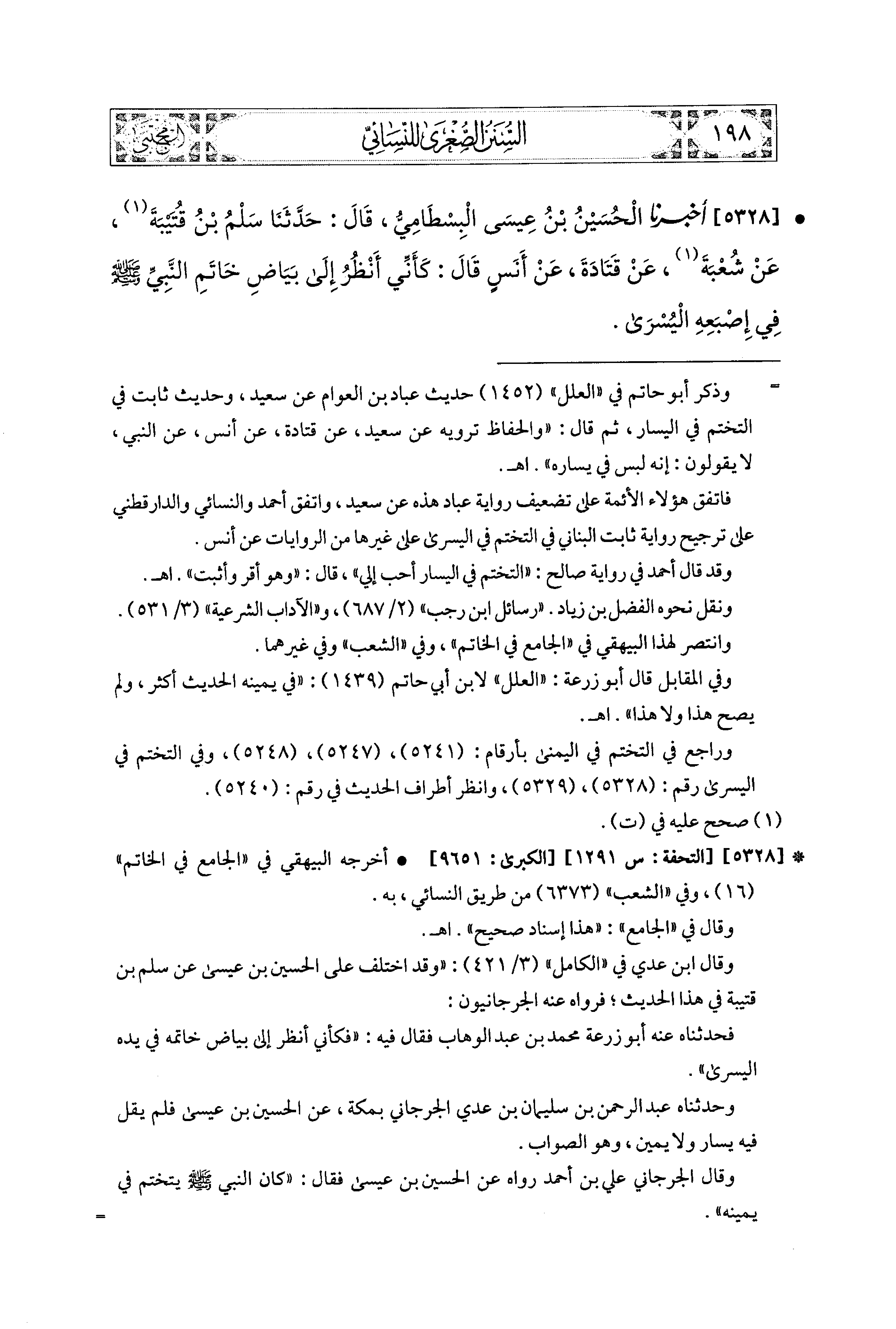 5328- أَخبَرَنا الحُسَيْنُ بنُ عِيسَى البِسْطَامِيُّ، قال: حَدَّثنا سَلْمُ بنُ قُتَيبَةَ، عَن شُعبَةَ، عَن قَتَادَةَ، عَن أَنَسٍ قَالَ: كَأَنِّي أَنْظُرُ إِلَى بَيَاضِ خَاتَمِ النَّبيِّ صَلى الله عَليه وسَلم فِي إِصْبَعِهِ اليُسْرَى.