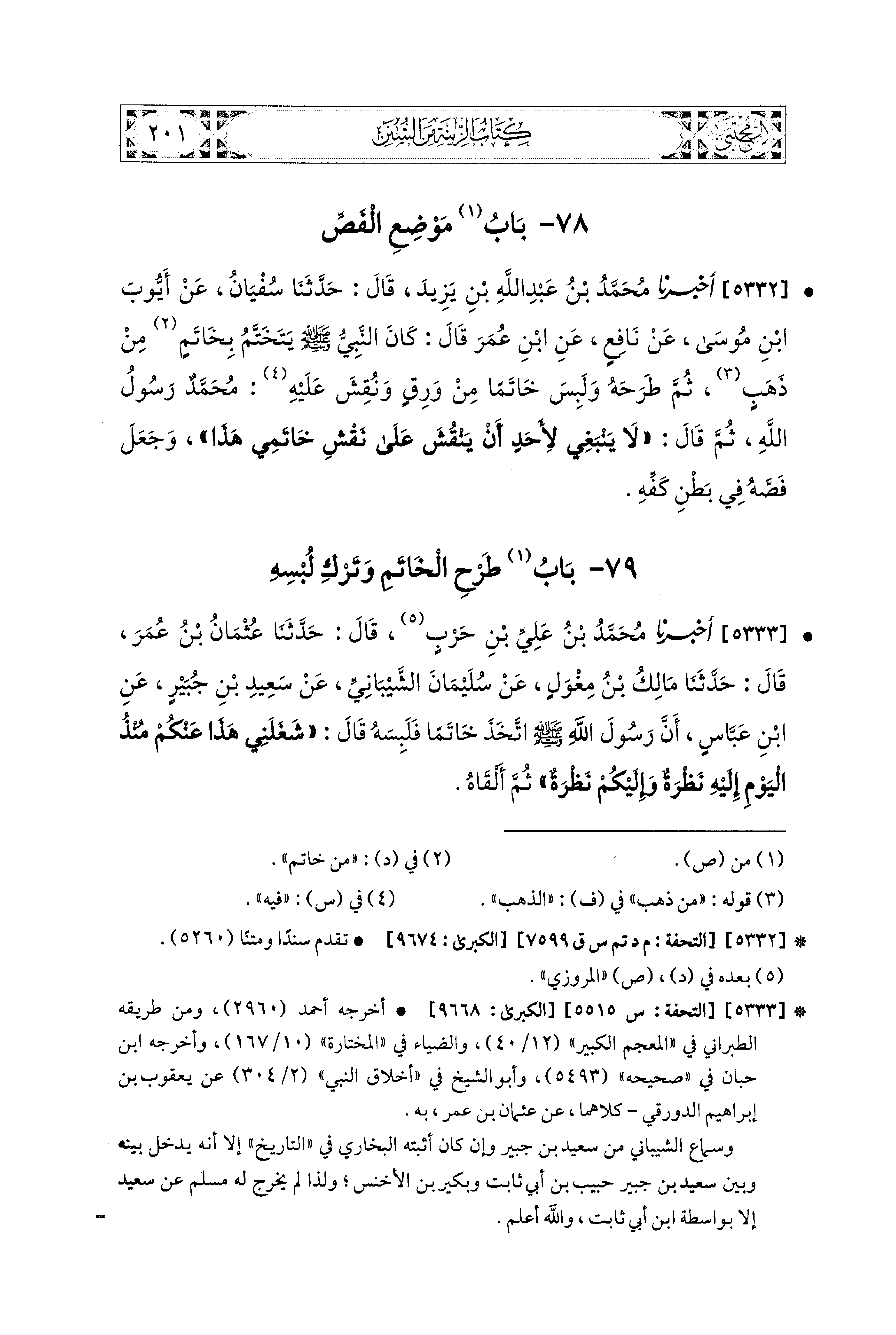 5333- أَخبَرَنا مُحَمد بنُ عَلِيِّ بْنِ حَرْبٍ، قال: حَدَّثنا عُثْمَانُ بنُ عُمَرَ، قال: حَدَّثنا مَالِكُ بنُ مِغْوَلٍ، عَن سُلَيمَانَ الشَّيْبَانِيِّ، عَن سَعيدِ بْنِ جُبَيْرٍ، عَنِ ابنِ عَبَّاسٍ، أَنَّ رَسُولَ اللهِ صَلى الله عَليه وسَلم اتَّخَذَ خَاتَمًا فَلَبِسَهُ، قَالَ: شَغَلَنِي هَذَا عَنكُمْ مُنْذُ اليَوْمَ، إِلَيْهِ نَظْرَةٌ، وَإِلَيْكُمْ نَظْرَةٌ، ثُمَّ أَلْقَاهُ.