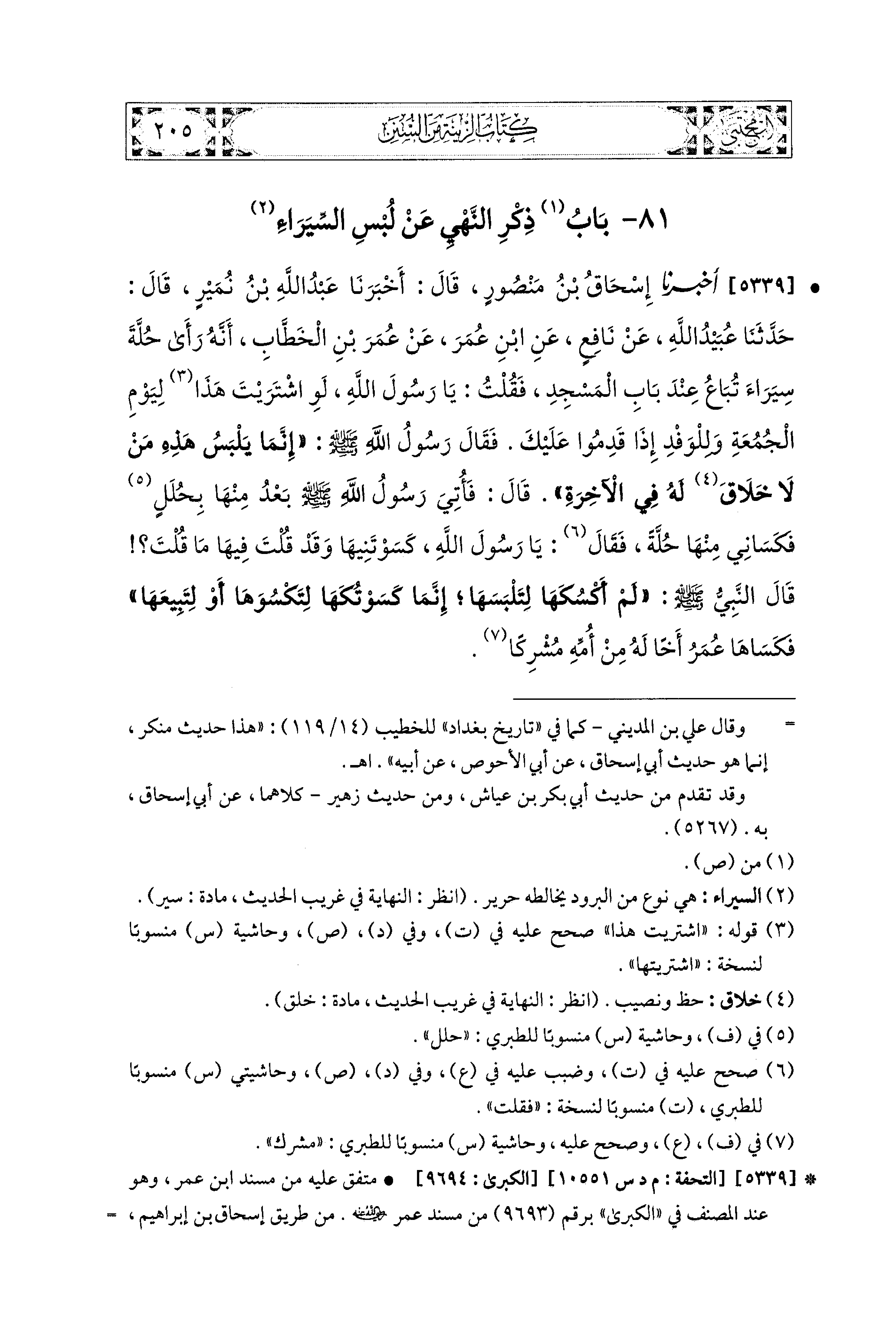5339- أَخبَرَنا إِسحَاقُ بنُ مَنْصُورٍ، قَالَ: أَخبرنا عَبدُ اللهِ بنُ نُمَيْرٍ، قال: حَدَّثنا عُبَيدُ اللهِ، عَن نَافِعٍ، عَنِ ابنِ عُمَرَ، عَن عُمَرَ بْنِ الخَطَّابِ، أَنَّهُ رَأَى حُلَّةَ سِيَرَاءَ تُبَاعُ عِنْدَ بَابِ المَسْجِدِ، فَقُلْتُ: يَا رَسُولَ اللهِ، لَوِ اشْتَرَيْتَ هَذَا لِيَوْمِ الجُمُعَةِ وَلِلْوَفْدِ إِذَا قَدِمُوا عَلَيْكَ، فَقَالَ رَسُولُ اللهِ صَلى الله عَليه وسَلم: إِنَّمَا يَلْبَسُ هَذِهِ مَنْ لاَ خَلاَقَ لَهُ فِي الآخِرَةِ، قَالَ: فَأُتِيَ رَسُولُ اللهِ صَلى الله عَليه وسَلم بَعْدُ مِنْهَا بِحُلَلٍ فَكَسَانِي مِنْهَا حُلَّةً، فَقَالَ: يَا رَسُولَ اللهِ، كَسَوْتَنِيهَا، وَقَدْ قُلْتَ فِيهَا مَا قُلْتَ؟ قَالَ النَّبيُّ صَلى الله عَليه وسَلم: لَمْ أَكْسُكَهَا لِتَلْبَسَهَا، إِنَّمَا كَسَوْتُكَهَا لِتَكْسُوَهَا، أَوْ لِتَبِيعَهَا، فَكَسَاهَا عُمَرُ أَخًا لَهُ مِنْ أُمِّهِ مُشْرِكًا.