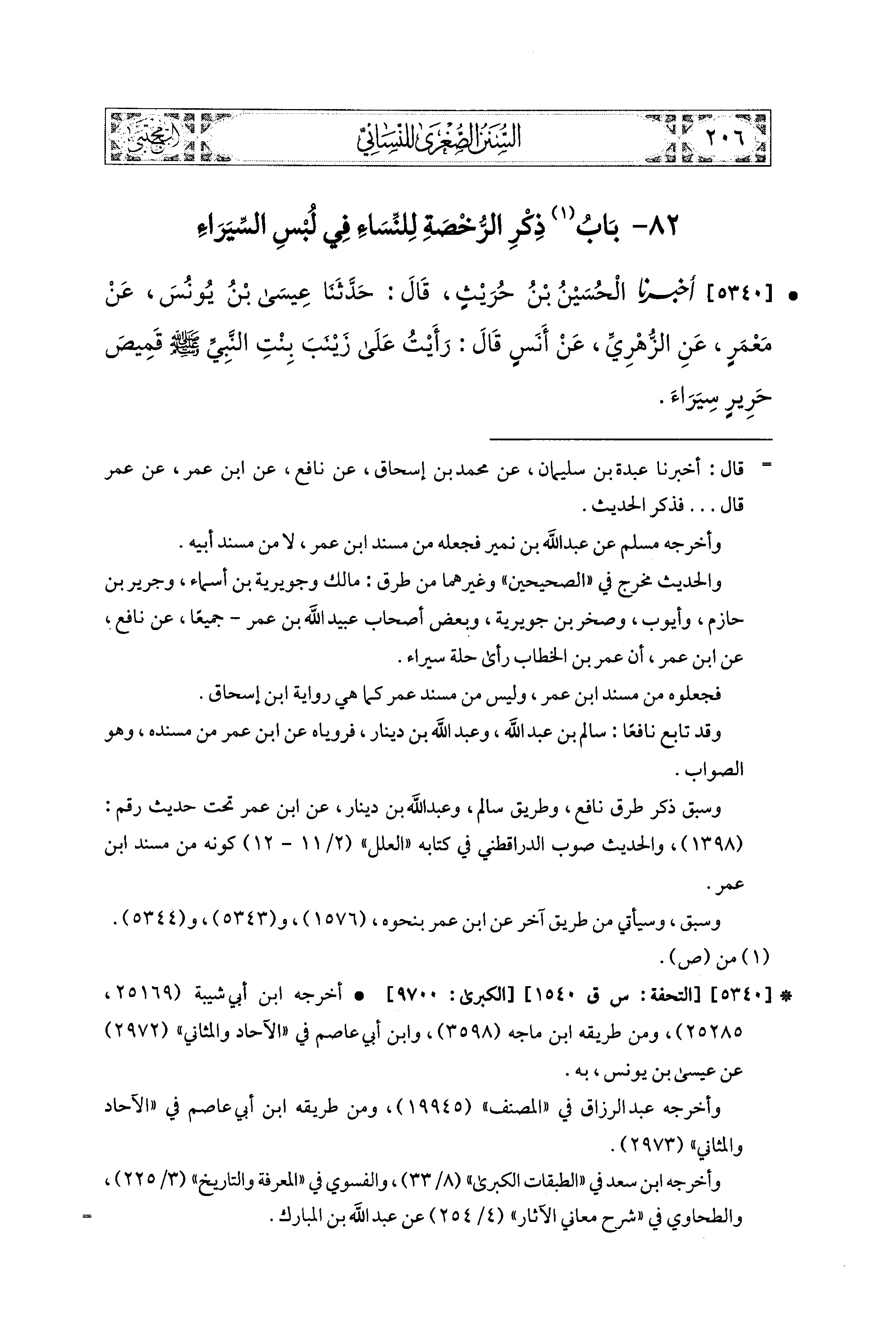 5340- أَخبَرَنا الحُسَيْنُ بنُ حُرَيْثٍ، قال: حَدَّثنا عِيسَى بنُ يُونُسَ، عَن مَعْمَرٍ، عَنِ الزُّهْرِيِّ، عَن أَنَسٍ قَالَ: رَأَيْتُ عَلَى زَيْنَبَ بِنْتِ النَّبيِّ صَلى الله عَليه وسَلم قَمِيصَ حَرِيرٍ سِيَرَاءَ.