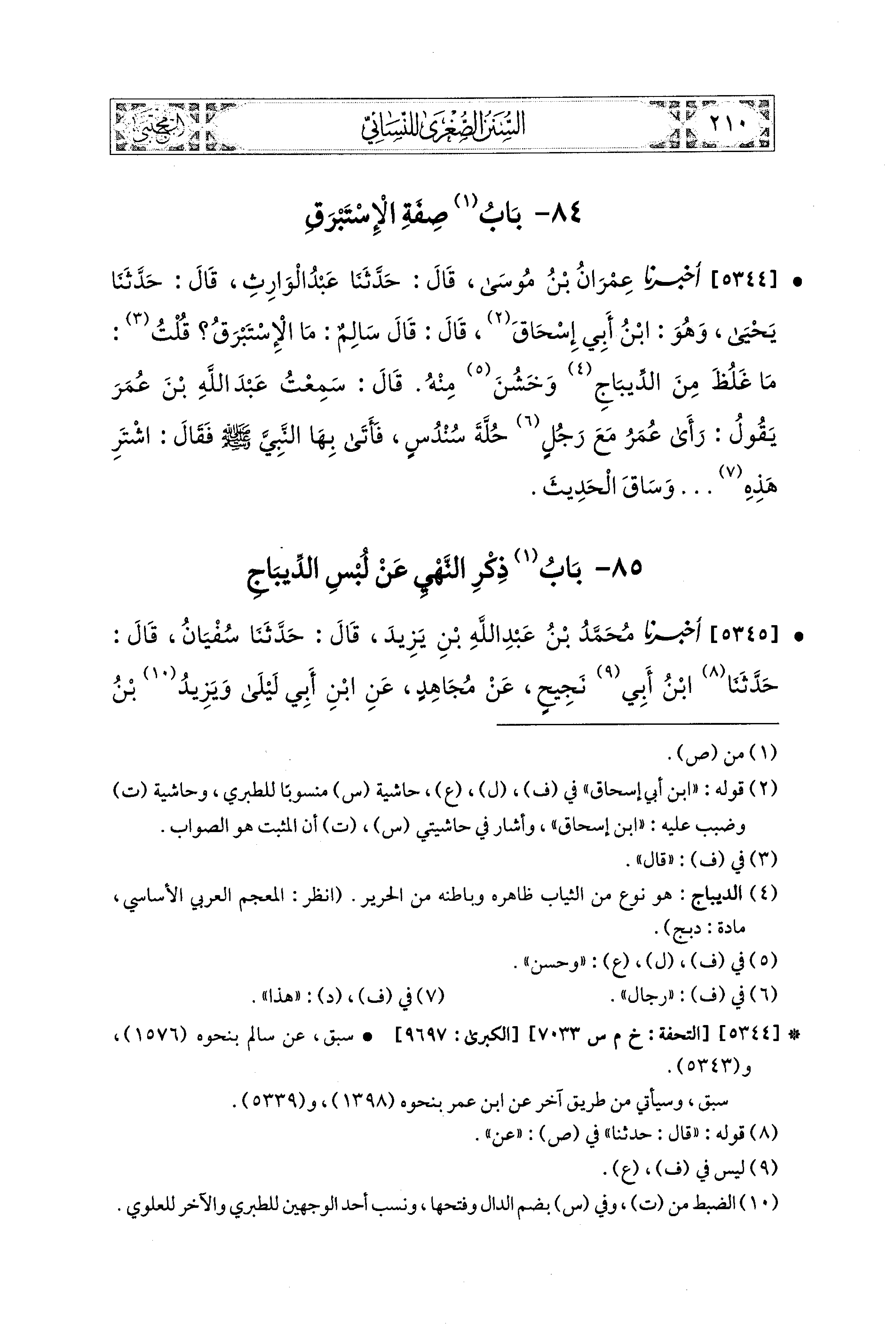 5344- أَخبَرَنا عِمْرَانُ بنُ مُوسَى، قال: حَدَّثنا عَبدُ الوَارِثِ، قال: حَدَّثنا يَحيَى، وَهُوَ ابنُ أَبي إِسحَاقَ قَالَ: قَالَ سَالِمٌ: مَا الإِسْتَبْرَقُ؟ قُلْتُ: مَا غَلُظَ مِنَ الدِّيبَاجِ وَخَشُنَ مِنْهُ، قَالَ: سَمِعْتُ عَبدَ اللهِ بْنَ عُمَرَ يَقُولُ: رَأَى عُمَرُ مَعَ رَجُلٍ حُلَّةَ سُنْدُسٍ، فَأَتَى بِهَا النَّبيَّ صَلى الله عَليه وسَلم فَقَالَ: اشْتَرِ هَذِهِ ...، وَسَاقَ الحَدِيثَ.