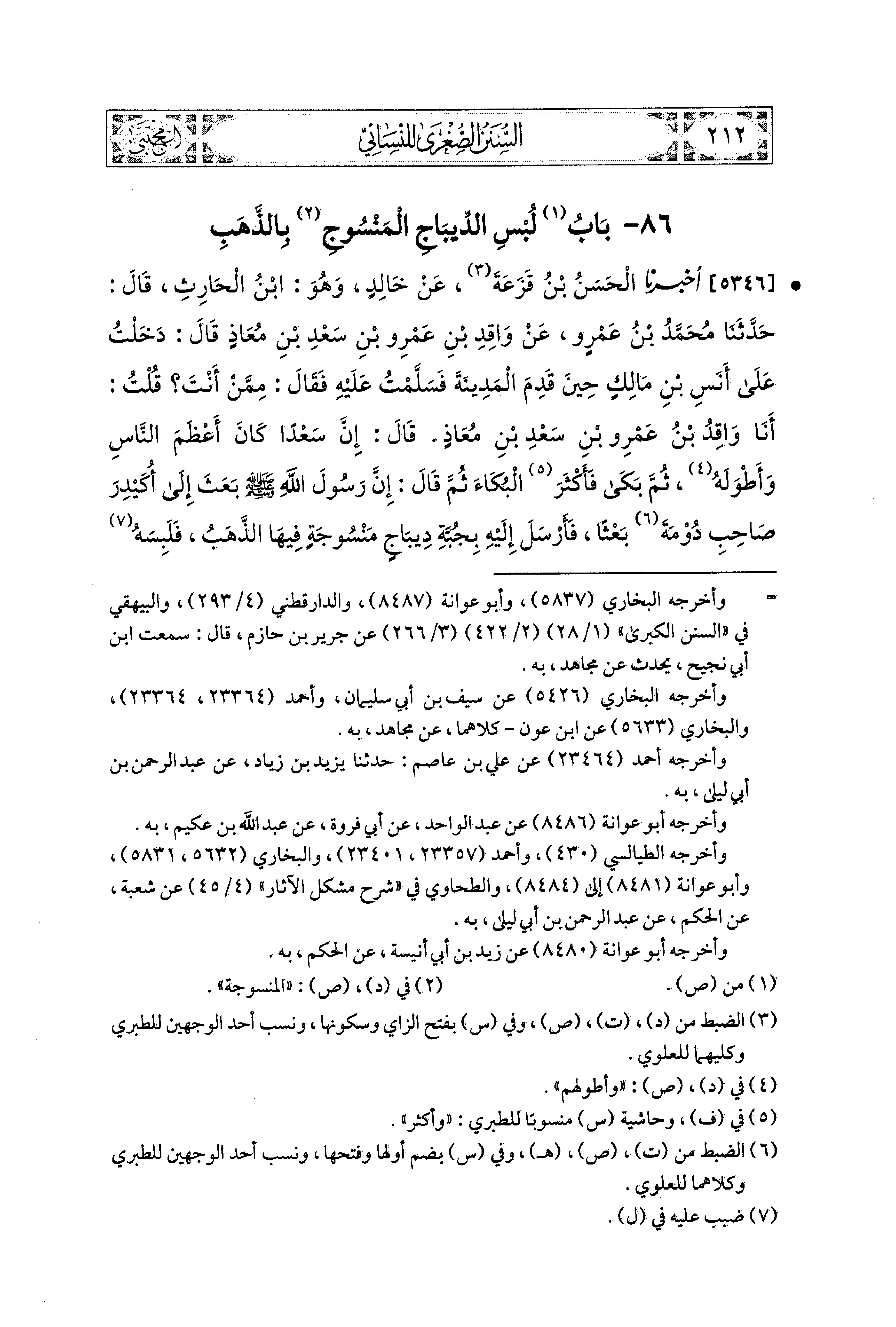 5346- أَخبَرَنا الحَسَنُ بنُ قَزَعَةَ، عَن خَالِدٍ، وَهُوَ ابنُ الحَارِثِ، قال: حَدَّثنا مُحَمدُ بنُ عَمْرٍو، عَن وَاقِدِ بْنِ عَمْرِو بْنِ سَعْدِ بْنِ مُعَاذٍ، قَالَ: دَخَلْتُ عَلَى أَنَسِ بْنِ مَالِكٍ حِينَ قَدِمَ المَدِينَةَ، فَسَلَّمْتُ عَلَيهِ، فَقَالَ: مِمَّنْ أَنْتَ؟ قُلْتُ: أَنَا وَاقِدُ بنُ عَمْرِو بْنِ سَعْدِ بْنِ مُعَاذٍ قَالَ: إِنَّ سَعْدًا كَانَ أَعْظَمَ النَّاسِ وَأَطْوَلَهُ، ثُمَّ بَكَى فَأَكْثَرَ البُكَاءَ، ثُمَّ قَالَ: إِنَّ رَسُولَ اللهِ صَلى الله عَليه وسَلم بَعَثَ إِلَى أُكَيْدِرَ صَاحِبِ دُومَةَ بَعْثًا، فَأَرْسَلَ إِلَيْهِ بِجُبَّةِ دِيبَاجٍ مَنْسُوجَةٍ فِيهَا الذَّهَبُ، فَلَبِسَهُ رَسُولُ اللهِ صَلى الله عَليه وسَلم، ثُمَّ قَامَ عَلَى المِنْبَرِ، وَقَعَدَ فَلَمْ يَتَكَلَّمْ، وَنَزَلَ، فَجَعَلَ النَّاسُ يَلْمِسُونَهَا بِأَيْدِيهِمْ، فَقَالَ: أَتَعْجَبُونَ مِنْ هَذِهِ لَمَنَادِيلُ سَعْدٍ فِي الجَنَّةِ أَحْسَنُ مِمَّا تَرَوْنَ.