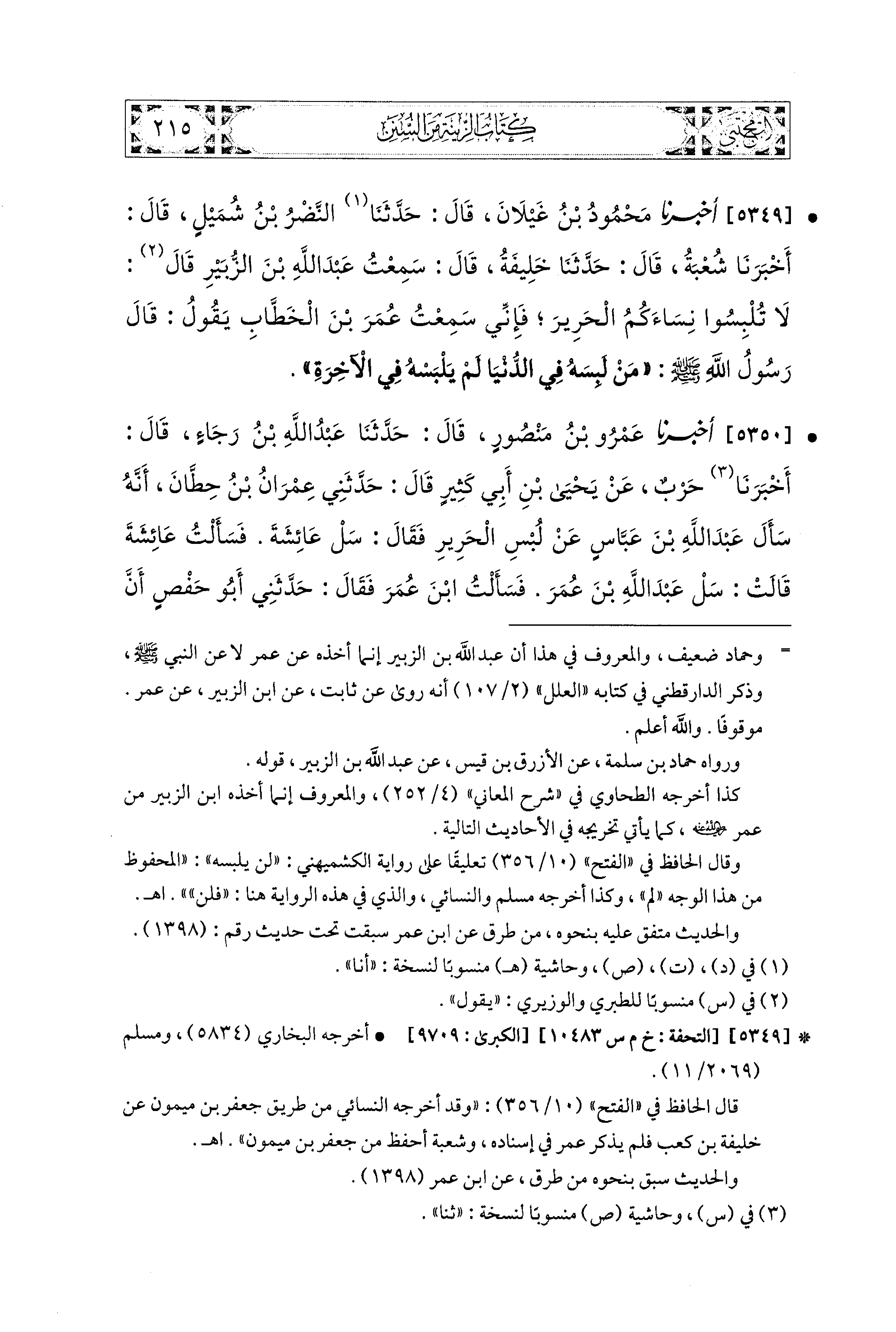5349- أَخبَرَنا مَحْمُودُ بنُ غَيْلاَنَ، قَالَ: أَنبَأَنا النَّضْرُ بنُ شُمَيْلٍ، قَالَ: أَخبرنا شُعبَةُ، قال: حَدَّثنا خَلِيفَةُ، قَالَ: سَمِعْتُ عَبدَ اللهِ بْنَ الزُّبَيْرِ قَالَ: لاَ تُلْبِسُوا نِسَاءَكُمُ الحَرِيرَ، فَإِنِّي سَمِعْتُ عُمَرَ بْنَ الخَطَّابِ يَقُولُ: قَالَ رَسُولُ اللهِ صَلى الله عَليه وسَلم: مَنْ لَبِسَهُ فِي الدُّنْيَا لَمْ يَلْبَسْهُ فِي الآخِرَةِ.
