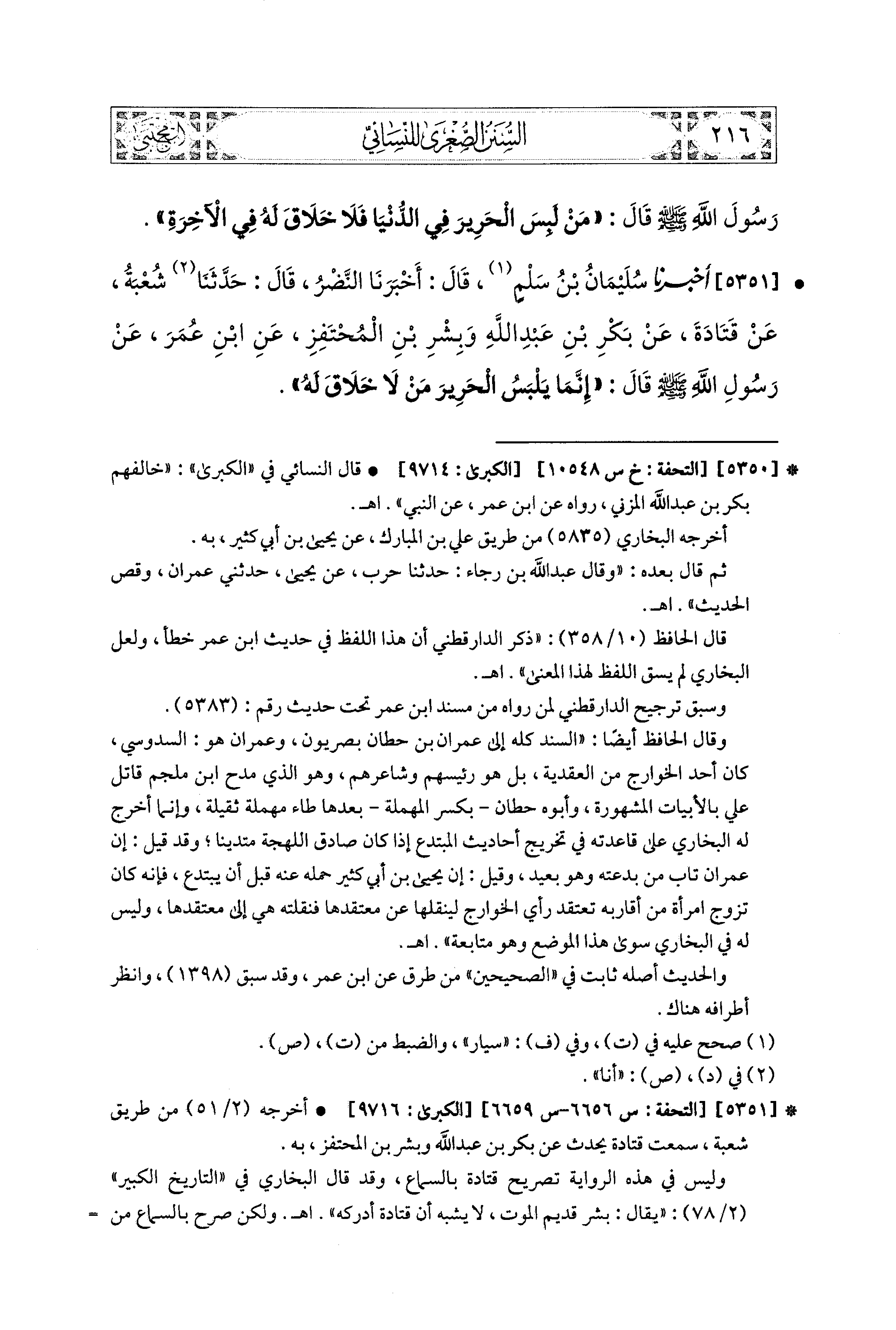 5351- أَخبَرَنا سُلَيمَانُ بنُ سَلْمٍ، قَالَ: أَخبرنا النَّضْرُ، قال: حَدَّثنا شُعبَةُ، عَن قَتَادَةَ، عَن بَكْرِ بْنِ عَبدِ اللهِ، وَبِشْرِ بْنِ المُحْتَفِزِ، عَنِ ابنِ عُمَرَ، عَن رَسُولِ اللهِ صَلى الله عَليه وسَلم قَالَ: إِنَّمَا يَلْبَسُ الحَرِيرَ مَنْ لاَ خَلاَقَ لَهُ.