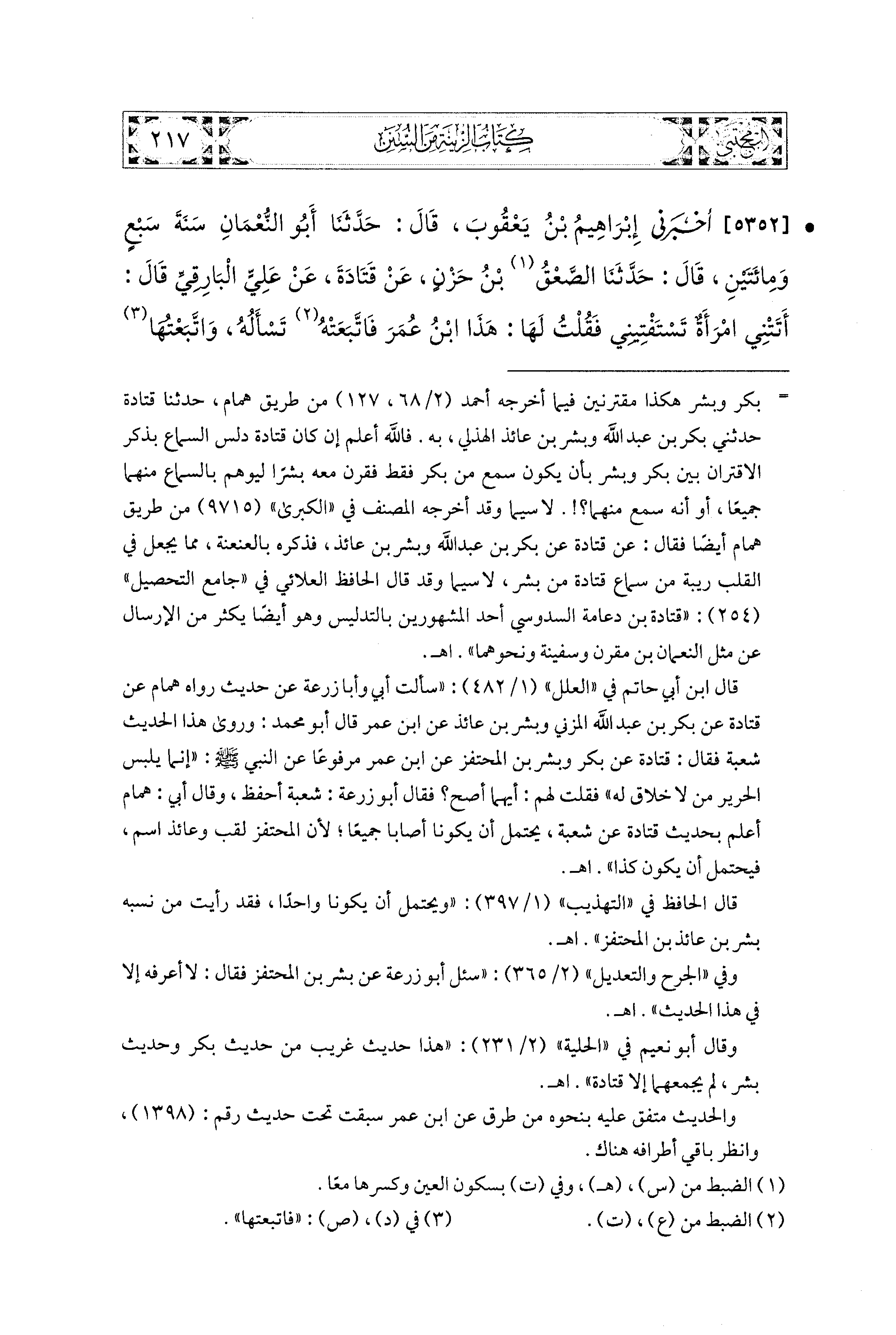 5352- أَخْبَرَنِي إِبراهِيمُ بنُ يَعقُوبَ، قال: حَدَّثنا أَبو النُّعْمَانِ، سَنَةَ سَبْعٍ وَمِئَتَيْنِ، قال: حَدَّثنا الصَّعْقُ بنُ حَزْنٍ، عَن قَتَادَةَ، عَن عَلِيٍّ البَارِقِيِّ، قَالَ: أَتَتْنِي امْرَأَةٌ تَسْتَفْتِينِي فَقُلْتُ لَهَا: هَذَا ابنُ عُمَرَ فَاتَّبَعَتْهُ تَسْأَلُهُ، وَاتَّبَعْتُهَا أَسْمَعُ مَا يَقُولُ: قَالَتْ: أَفْتِنِي فِي الحَرِيرِ؟ قَالَ: نَهَى عَنهُ رَسُولُ اللهِ صَلى الله عَليه وسَلم.