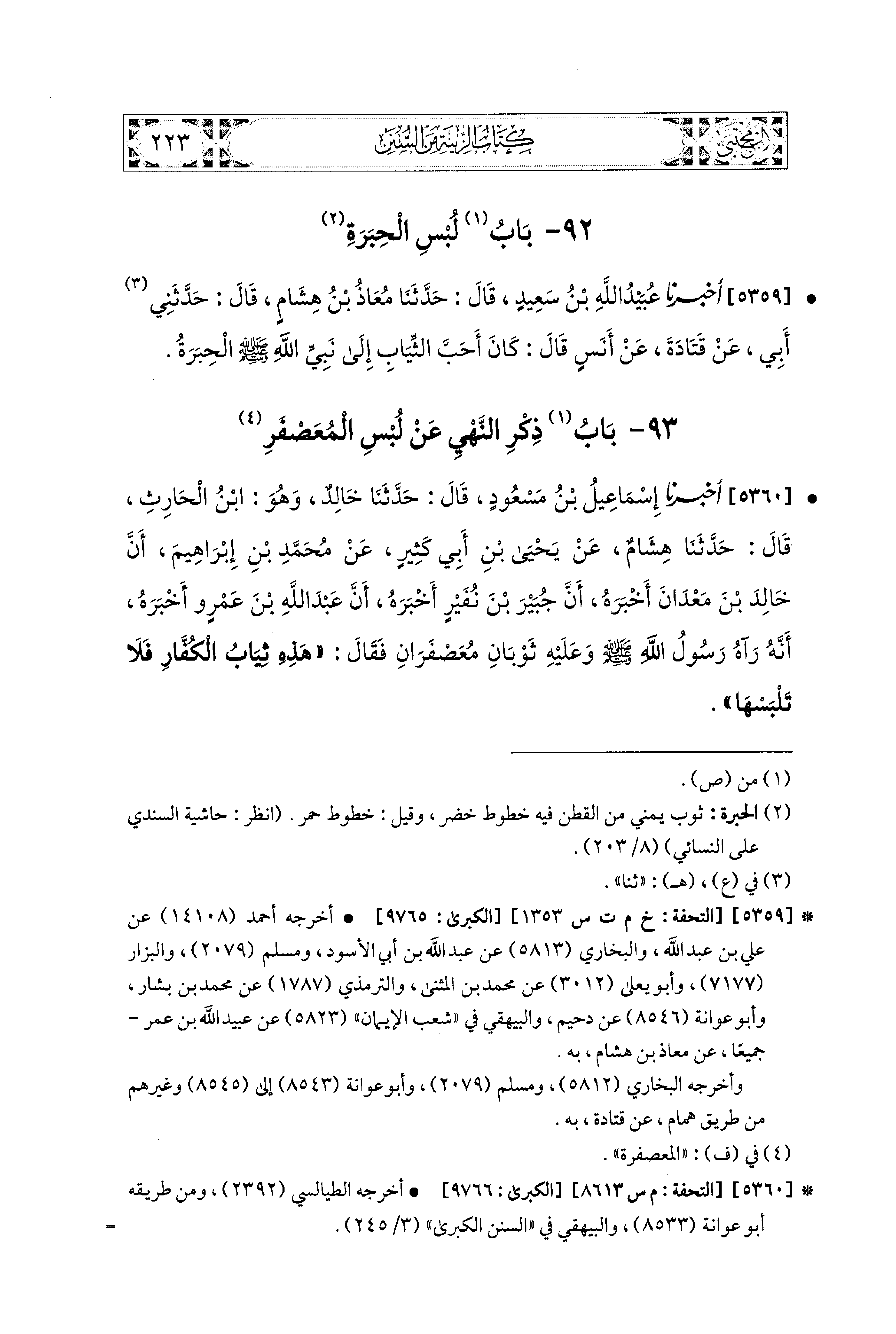5359- أَخبَرَنا عُبَيدُ اللهِ بنُ سَعيدٍ، قال: حَدَّثنا مُعَاذُ بنُ هِشَامٍ، قَالَ: حَدَّثني أَبي، عَن قَتَادَةَ، عَن أَنَسٍ قَالَ: كَانَ أَحَبُّ الثِّيَابِ إِلَى نَبِيِّ اللهِ صَلى الله عَليه وسَلم الحِبَرَةَ.