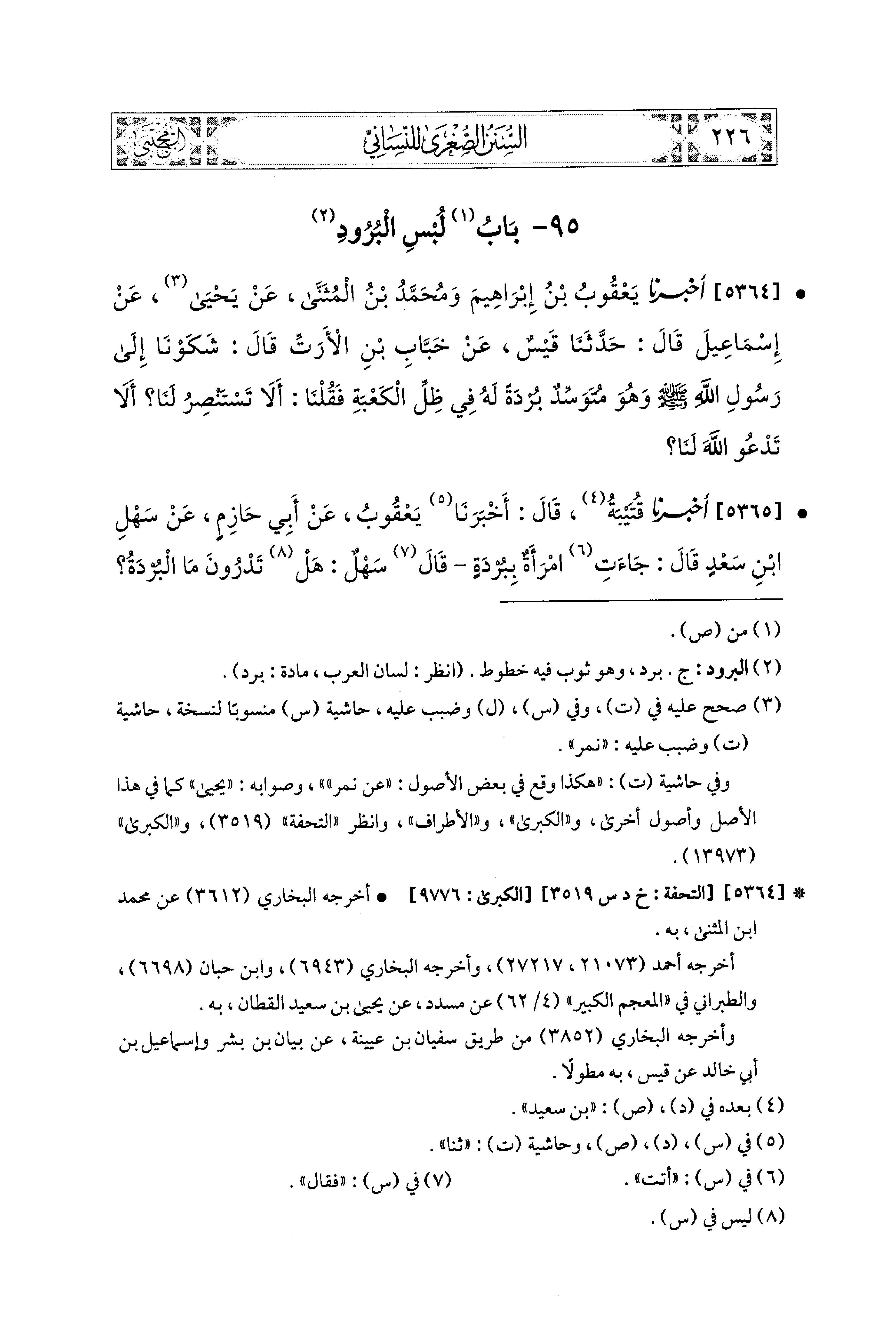 5365- أَخبَرَنا قُتَيبَةُ، قَالَ: أَخبرنا يَعقُوبُ، عَن أَبي حَازِمٍ، عَن سَهْلِ بْنِ سَعْدٍ، قَالَ: جَاءَتِ امْرَأَةٌ بِبُرْدَةٍ، قَالَ سَهْلٌ: هَلْ تَدْرُونَ مَا البُرْدَةُ؟ قَالُوا: نَعَمْ، هَذِهِ الشَّمْلَةُ مَنْسُوجٌ فِي حَاشِيَتِهَا، فَقَالَتْ: يَا رَسُولَ اللهِ، إِنِّي نَسَجْتُ هَذِهِ بِيَدِي أَكْسُوكَهَا، فَأَخَذَهَا رَسُولُ اللهِ صَلى الله عَليه وسَلم مُحْتَاجًا إِلَيْهَا، فَخَرَجَ إِلَيْنَا، وَإِنَّهُ لإِزَارُهُ.