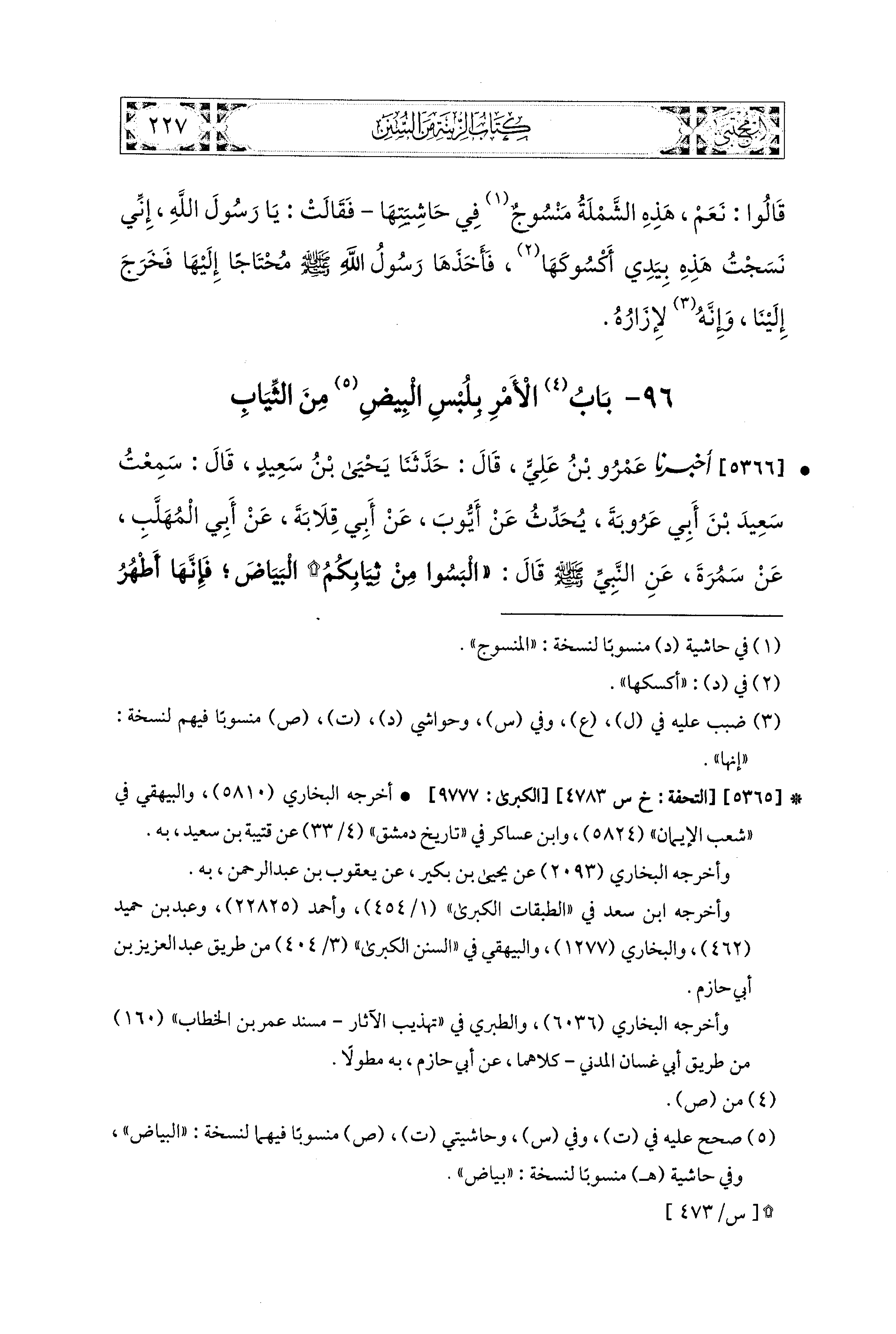 5366- أَخبَرَنا عَمْرُو بنُ عَلِيٍّ، قال: حَدَّثنا يَحيَى بنُ سَعيدٍ، قَالَ: سَمِعْتُ سَعيدَ بْنَ أَبي عَرُوبَةَ يُحَدِّثُ، عَن أَيُّوبَ، عَن أَبي قِلاَبَةَ، عَن أَبي المُهَلَّبِ، عَن سَمُرَةَ، عَنِ النَّبيِّ صَلى الله عَليه وسَلم قَالَ: البَسُوا مِنْ ثِيَابِكُمُ البَيَاضَ، فَإِنَّهَا أَطْهَرُ وَأَطْيَبُ، وَكَفِّنُوا فِيهَا مَوْتَاكُمْ.