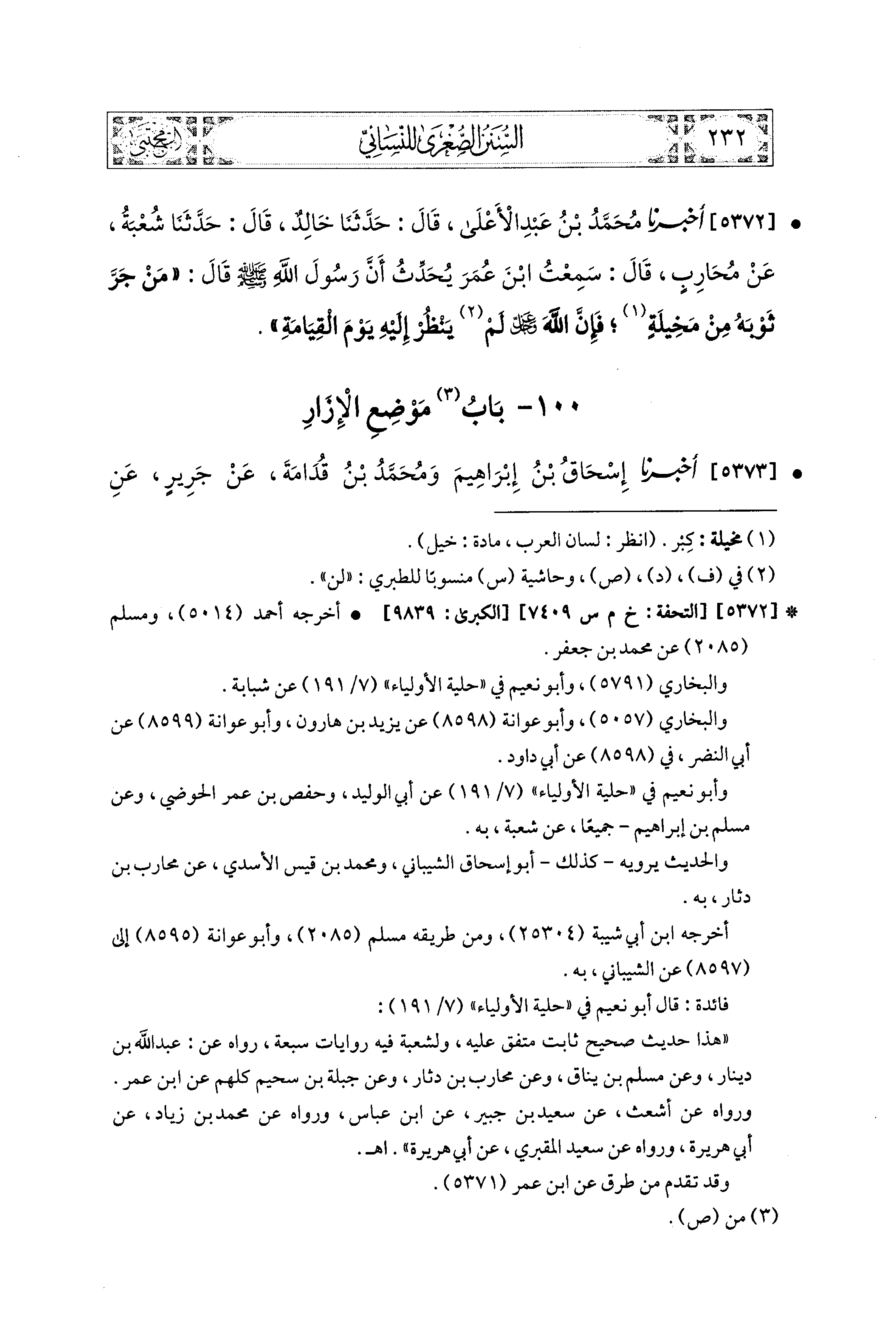 5372- أَخبَرَنا مُحَمد بن عَبدِ الأَعلَى، قال: حَدَّثنا خَالِدٌ، قال: حَدَّثنا شُعبَةُ، عَن مُحَارِبٍ، قَالَ: سَمِعْتُ ابنَ عُمَرَ يُحَدِّثُ، أَنَّ رَسُولَ اللهِ صَلى الله عَليه وسَلم قَالَ: مَنْ جَرَّ ثَوْبَهُ مِنْ مَخِيلَةٍ، فَإِنَّ اللهَ عَزَّ وَجَلَّ لَمْ يَنْظُرْ إِلَيْهِ يَوْمَ القِيَامَةِ.