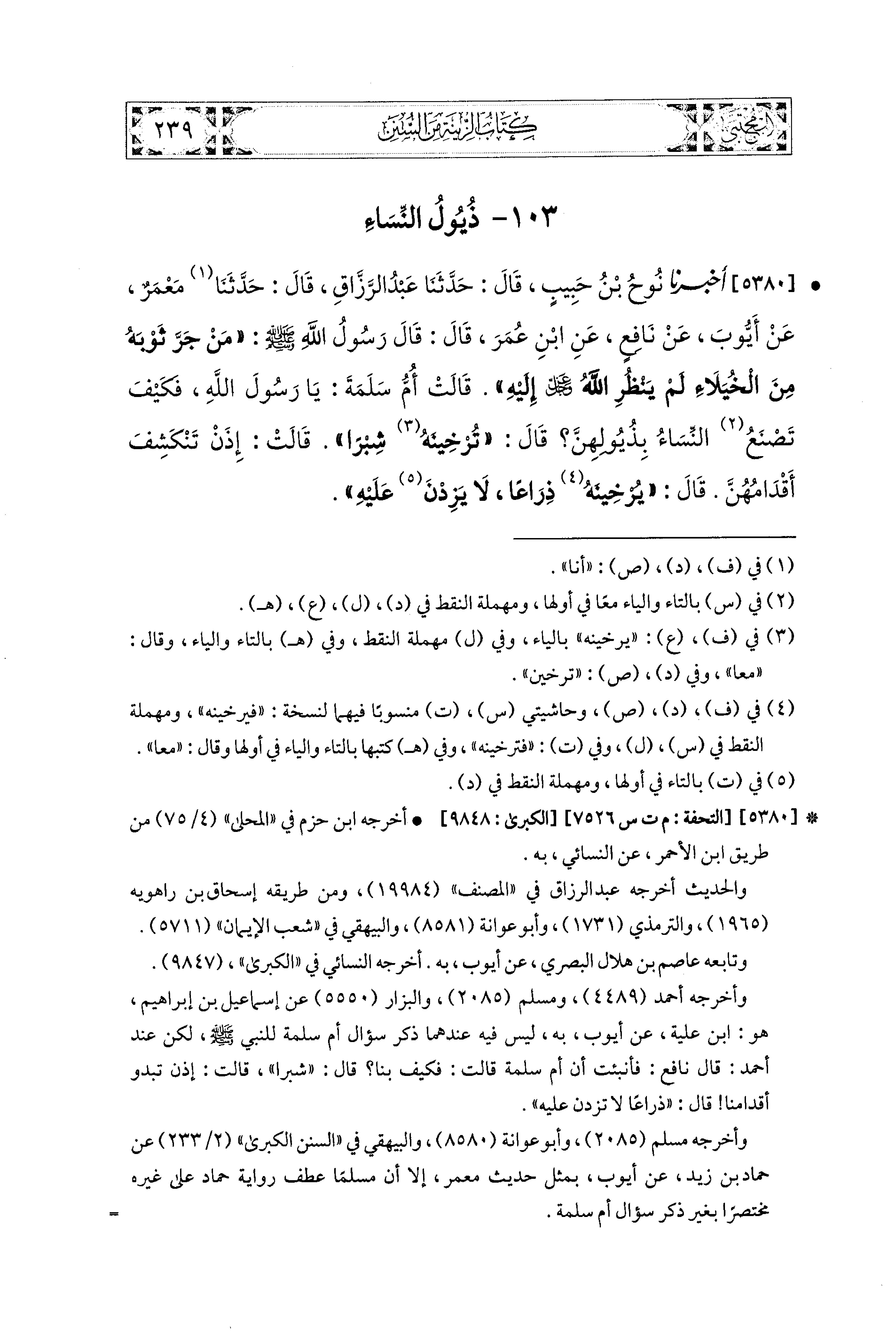 5380- أَخبَرَنا نُوحُ بنُ حَبِيبٍ، قال: حَدَّثنا عَبدُ الرَّزَّاقِ، قال: حَدَّثنا مَعْمَرٌ، عَن أَيُّوبَ، عَن نَافِعٍ، عَنِ ابنِ عُمَرَ قَالَ: قَالَ رَسُولُ اللهِ صَلى الله عَليه وسَلم: مَنْ جَرَّ ثَوْبَهُ مِنَ الخُيَلاَءِ لَمْ يَنْظُرِ اللهُ عز وجل إِلَيْهِ، قَالَتْ أُمُّ سَلَمَةَ: يَا رَسُولَ اللهِ، فَكَيْفَ تَصْنَعُ النِّسَاءُ بِذُيُولِهِنَّ؟ قَالَ: تُرْخِينَهُ شِبْرًا، قَالَتْ: إِذًا تَنْكَشِفَ أَقْدَامُهُنَّ؟ قَالَ: تُرْخِينَهُ ذِرَاعًا، لاَ يَزِدْنَ عَلَيهِ.