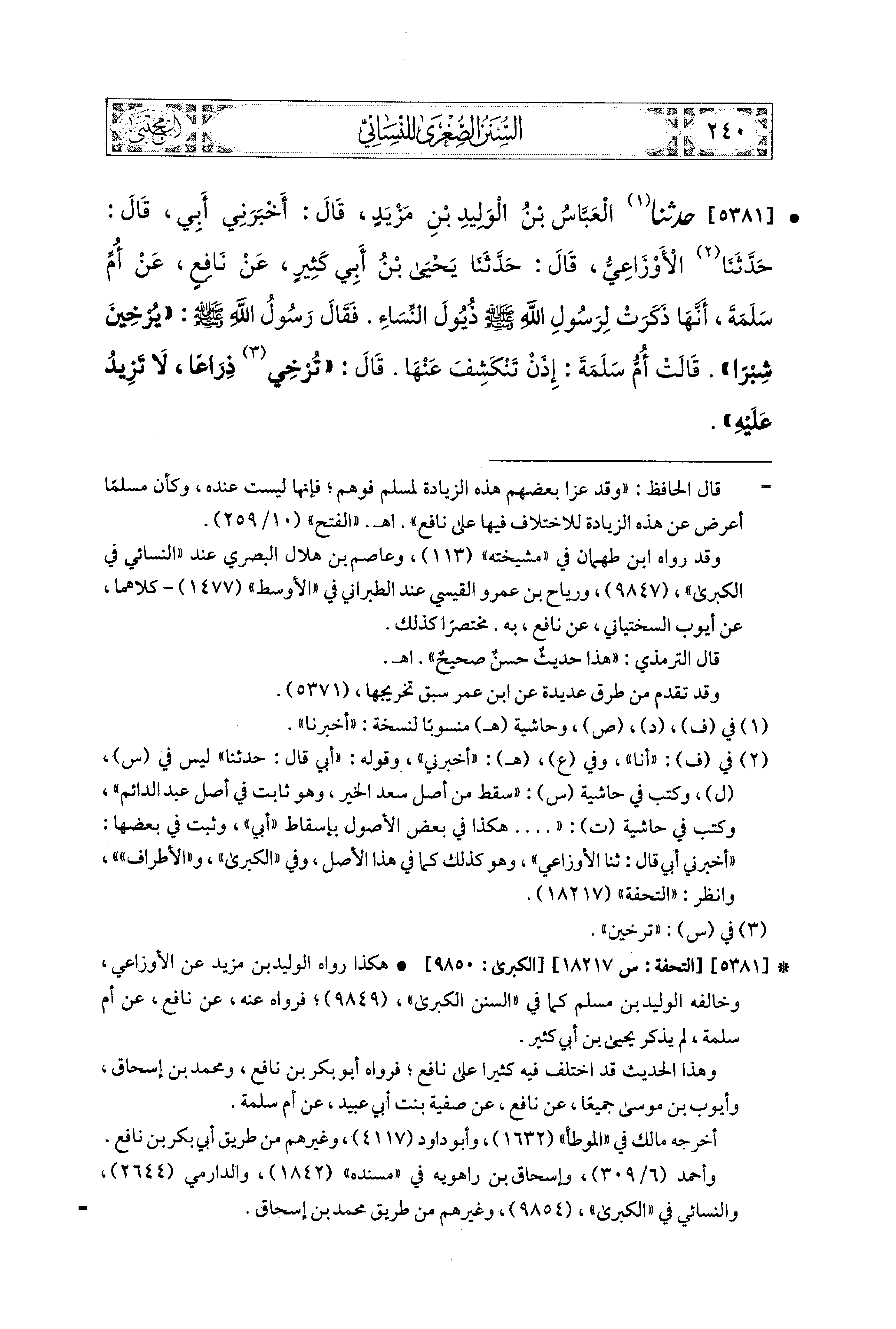 5381- حَدَّثَنَا العَبَّاسُ بنُ الوَلِيدِ بْنِ مَزْيَدٍ، قَالَ: أَخْبَرَنِي أَبي، قال: حَدَّثنا الأَوْزَاعِيُّ، قال: حَدَّثنا يَحيَى بنُ أَبي كَثِيرٍ، عَن نَافِعٍ، عَن أُمِّ سَلَمَةَ، أَنَّهَا ذَكَرَتْ لِرَسُولِ اللهِ صَلى الله عَليه وسَلم ذُيُولَ النِّسَاءِ، فَقَالَ رَسُولُ اللهِ صَلى الله عَليه وسَلم: يُرْخِينَ شِبْرًا، قَالَتْ أُمُّ سَلَمَةَ: إِذًا تَنْكَشِفَ عَنهَا، قَالَ: تُرْخِي ذِرَاعًا، لاَ تَزِيدُ عَلَيهِ.