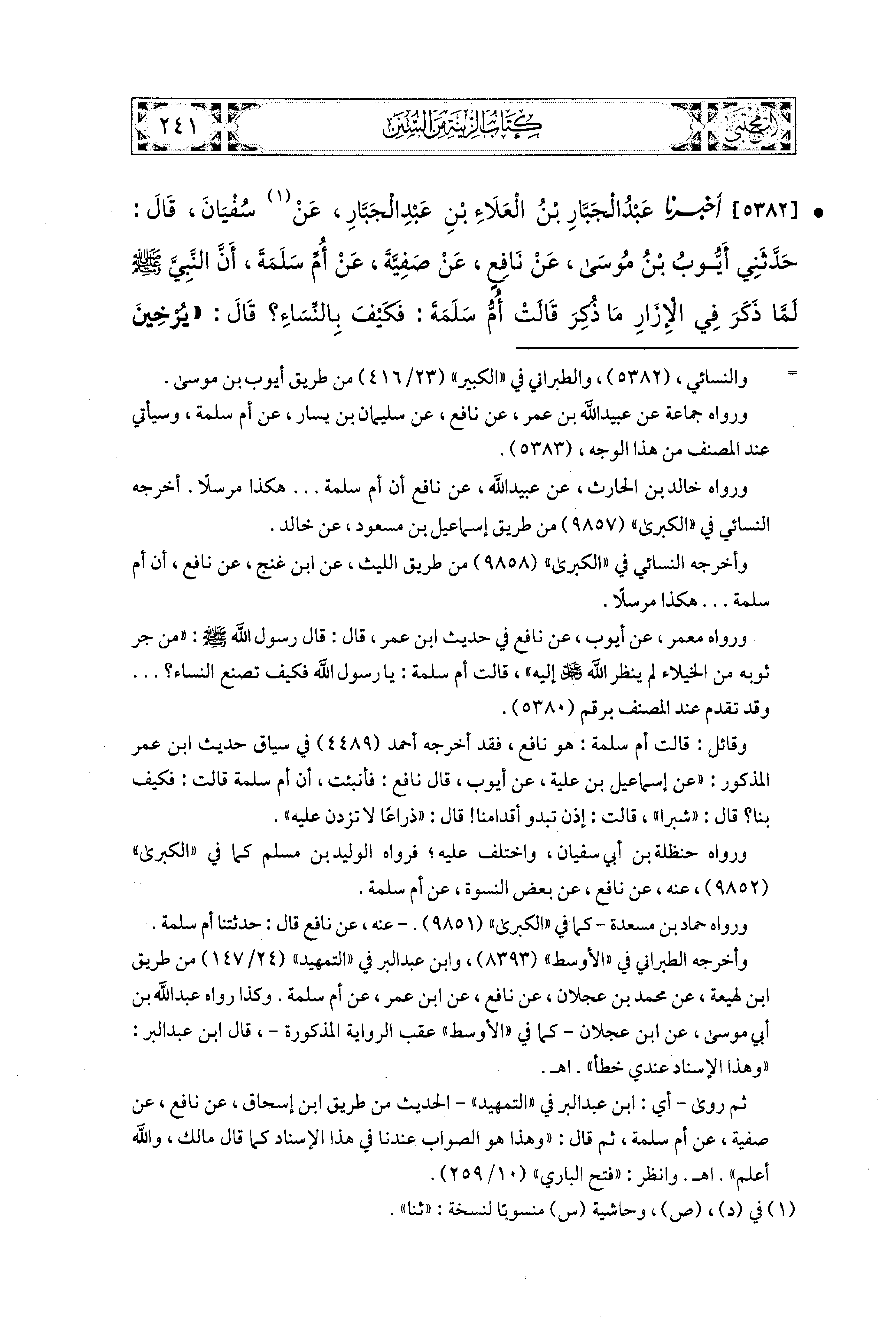 5382- أَخبَرَنا عَبدُ الجَبَّارِ بنُ العَلاَءِ بْنِ عَبدِ الجَبَّارِ، عَن سُفيَانَ، قَالَ: حَدَّثني أَيُّوبُ بنُ مُوسَى، عَن نَافِعٍ، عَن صَفِيَّةَ، عَن أُمِّ سَلَمَةَ، أَنَّ النَّبيَّ صَلى الله عَليه وسَلم لَمَّا ذُكِرَ فِي الإِزَارِ مَا ذُكِرَ، قَالَتْ أُمُّ سَلَمَةَ: فَكَيْفَ بِالنِّسَاءِ؟ قَالَ: يُرْخِينَ شِبْرًا، قَالَتْ: إِذًا تَبْدُوَ أَقْدَامُهُنَّ، قَالَ: فَذِرَاعًا، لاَ يَزِدْنَ عَلَيهِ.