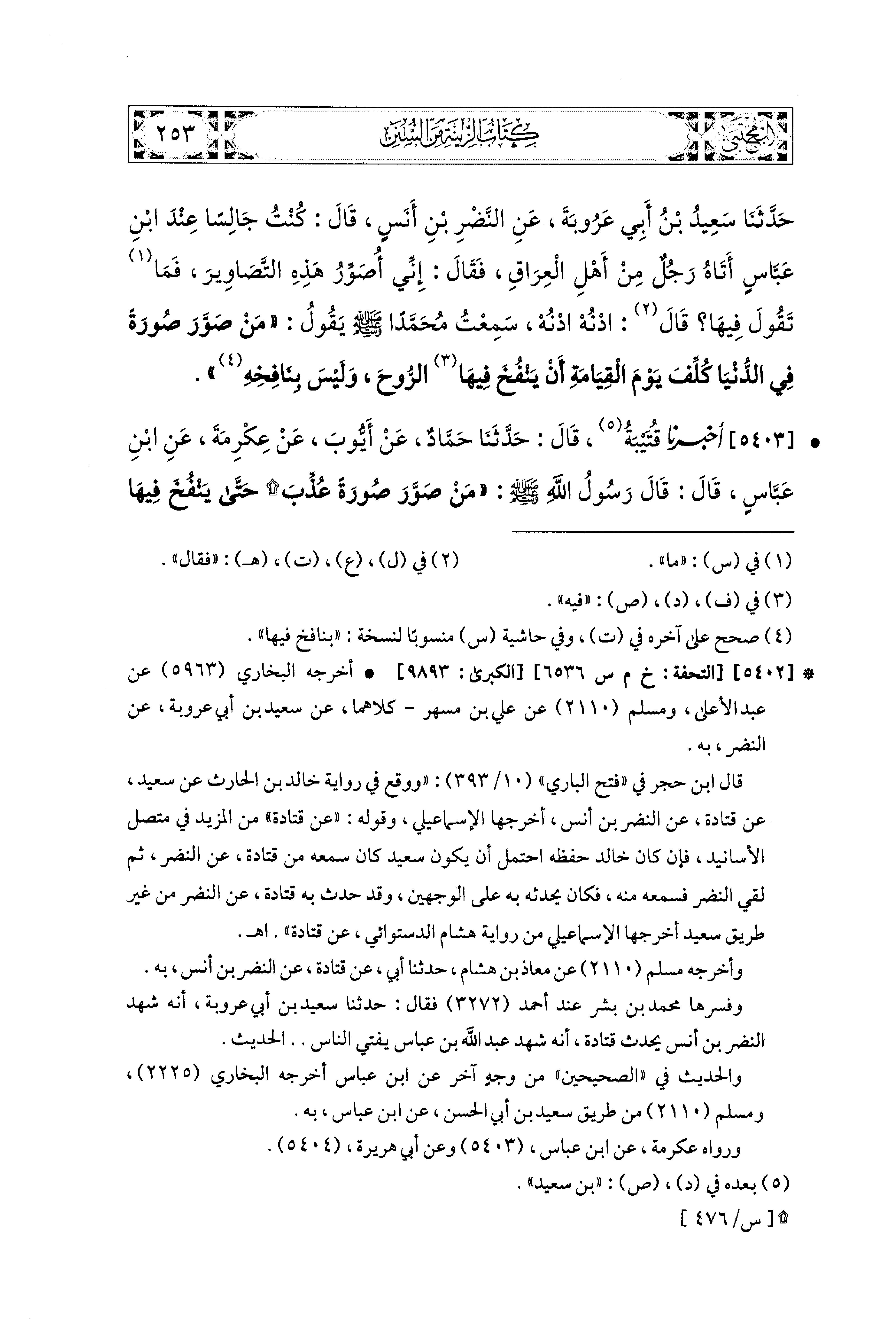 5403- أَخبَرَنا قُتَيبَةُ، قال: حَدَّثنا حَمَّادٌ، عَن أَيُّوبَ، عَن عِكْرِمَةَ، عَنِ ابنِ عَبَّاسٍ، قَالَ: قَالَ رَسُولُ اللهِ صَلى الله عَليه وسَلم: مَنْ صَوَّرَ صُورَةً عُذِّبَ حَتَّى يَنْفُخَ فِيهَا الرُّوحَ، وَلَيْسَ بِنَافِخٍ فِيهَا.