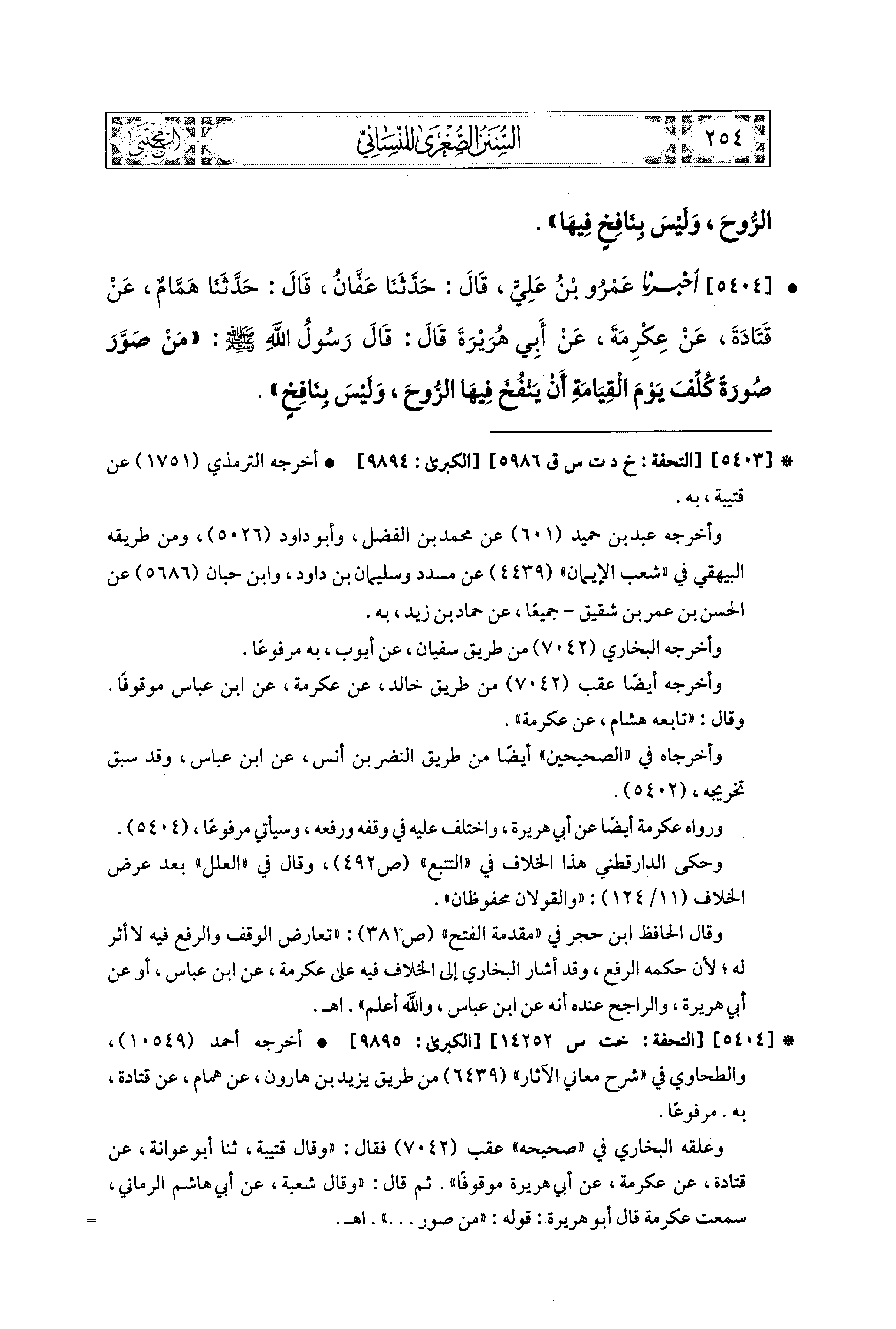 5404- أَخبَرَنا عَمْرُو بنُ عَلِيٍّ، قال: حَدَّثنا عَفَّانُ، قال: حَدَّثنا هَمَّامٌ، عَن قَتَادَةَ، عَن عِكْرِمَةَ، عَن أَبي هُرَيْرَةَ قَالَ: قَالَ رَسُولُ اللهِ صَلى الله عَليه وسَلم: مَنْ صَوَّرَ صُورَةً كُلِّفَ يَوْمَ القِيَامَةِ أَنْ يَنْفُخَ فِيهَا الرُّوحَ، وَلَيْسَ بِنَافِخٍ.