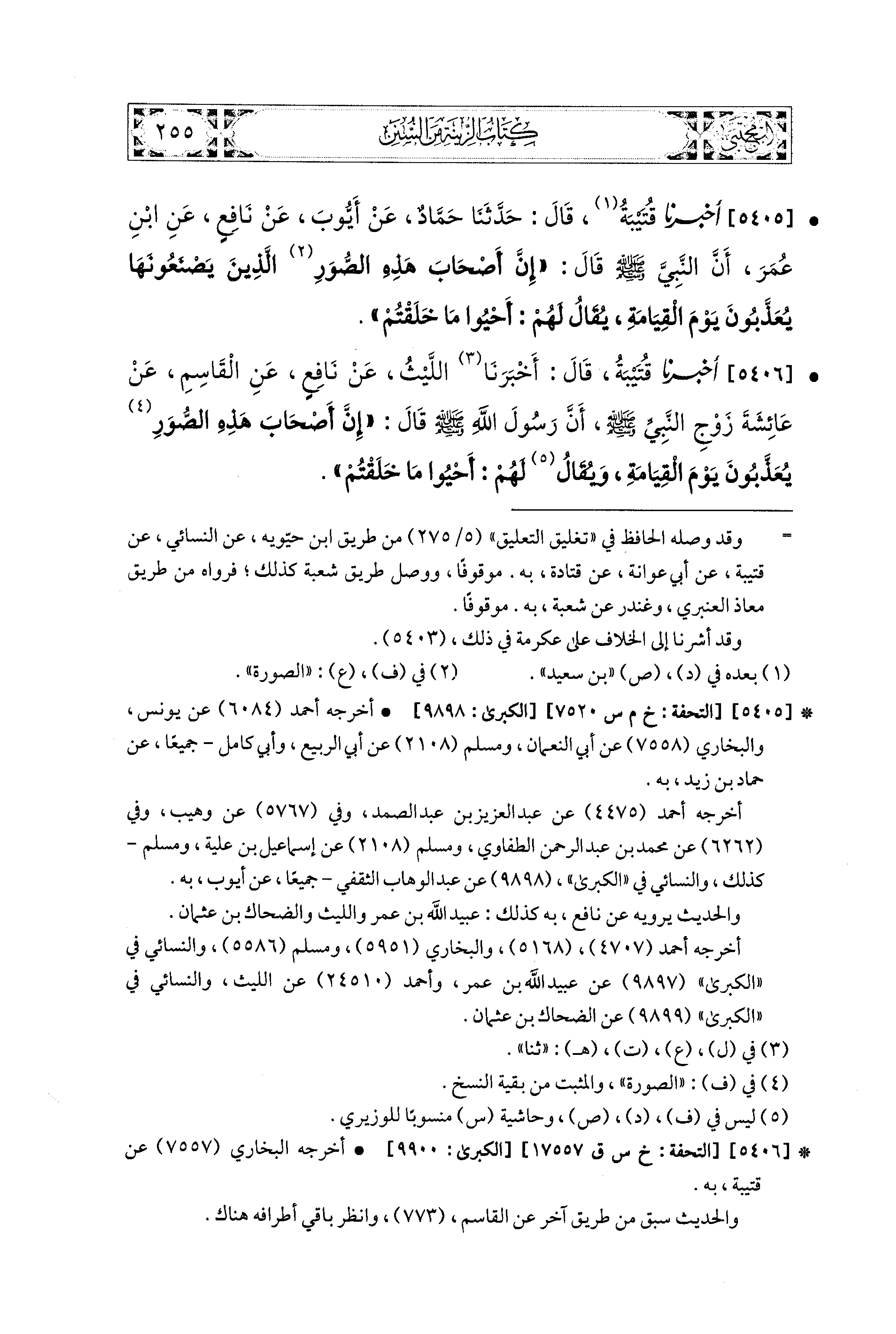 5405- أَخبَرَنا قُتَيبَةُ، قال: حَدَّثنا حَمَّادٌ، عَن أَيُّوبَ، عَن نَافِعٍ، عَنِ ابنِ عُمَرَ، أَنَّ النَّبيَّ صَلى الله عَليه وسَلم قَالَ: إِنَّ أَصْحَابَ هَذِهِ الصُّوَرِ الَّذِينَ يَصْنَعُونَهَا يُعَذَّبُونَ يَوْمَ القِيَامَةِ، يُقَالُ لَهُمْ: أَحْيُوا مَا خَلَقْتُمْ.