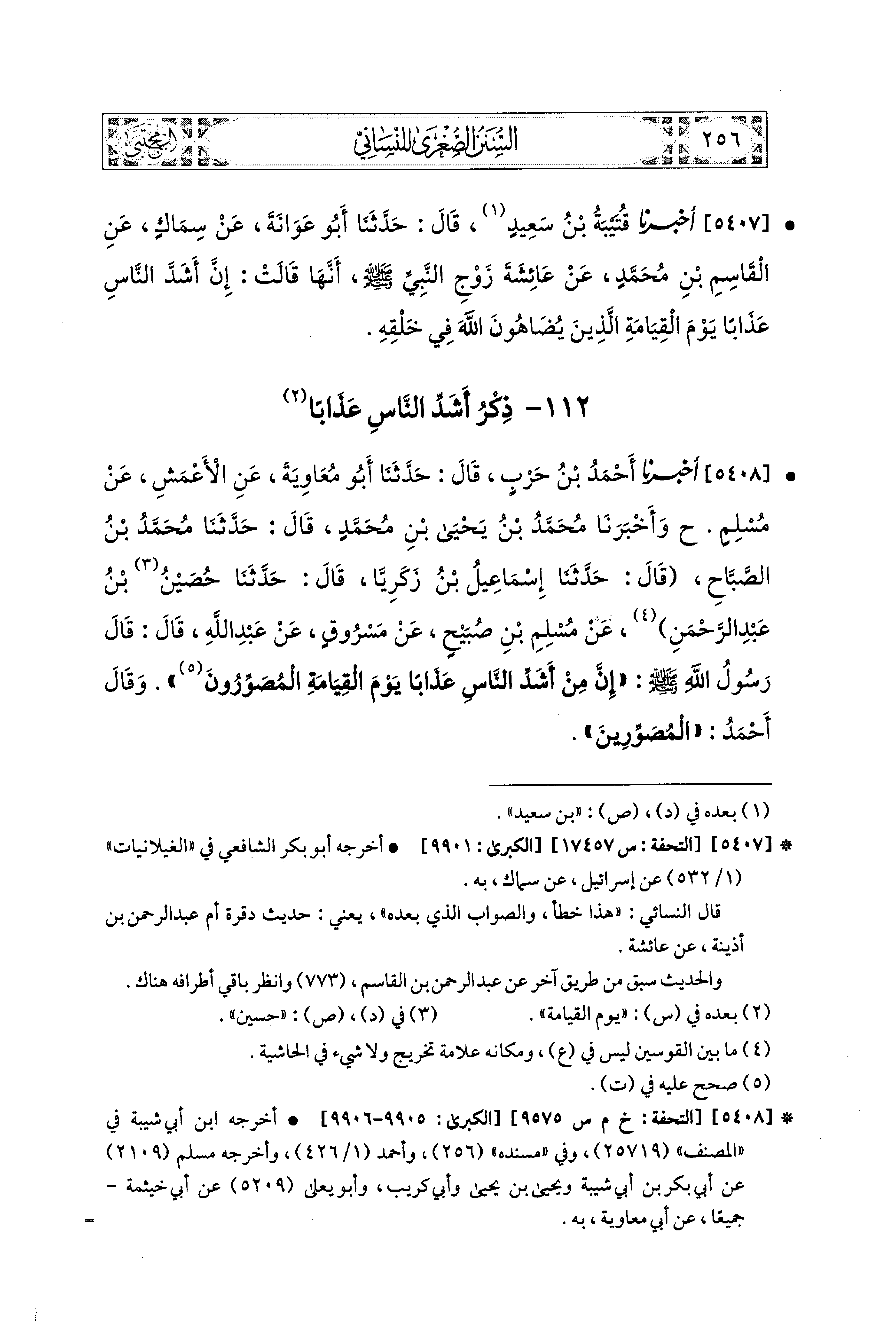 5407- أَخبَرَنا قُتَيبَةُ، قال: حَدَّثنا أَبو عَوَانَةَ، عَن سِمَاكٍ، عَنِ القَاسِمِ بْنِ مُحَمدٍ، عَن عَائِشَةَ، زَوْجِ النَّبيِّ صَلى الله عَليه وسَلم أَنَّهَا قَالَتْ: إِنَّ أَشَدَّ النَّاسِ عَذَابًا يَوْمَ القِيَامَةِ الَّذِينَ يُضَاهُونَ اللهَ فِي خَلْقِهِ.