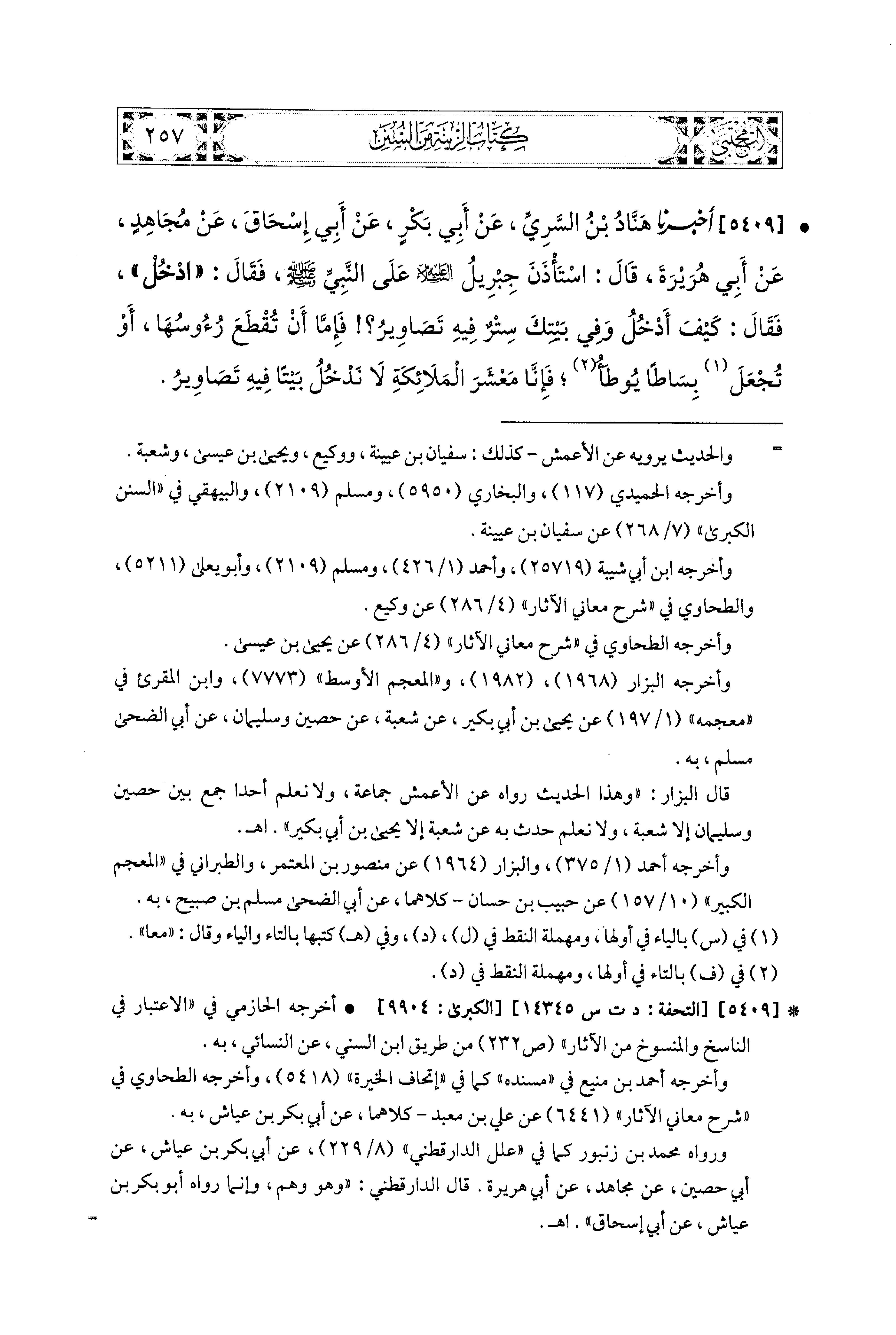 5409- أَخبَرَنا هَنَّادُ بنُ السَّرِيِّ، عَن أَبي بَكْرٍ، عَن أَبي إِسحَاقَ، عَن مُجَاهِدٍ، عَن أَبي هُرَيْرَةَ قَالَ: اسْتَأْذَنَ جِبْرِيلُ عَلَيهِ السَّلاَمُ عَلَى النَّبيِّ صَلى الله عَليه وسَلم، فَقَالَ: ادْخُلْ فَقَالَ: كَيْفَ أَدْخُلُ وَفِي بَيْتِكَ سِتْرٌ فِيهِ تَصَاوِيرُ، فَإِمَّا أَنْ تُقْطَعَ رُؤُوسُهَا، أَوْ تُجْعَلَ بِسَاطًا يُوطَأُ فَإِنَّا مَعْشَرَ المَلاَئِكَةِ لاَ نَدْخُلُ بَيْتًا فِيهِ تَصَاوِيرُ.