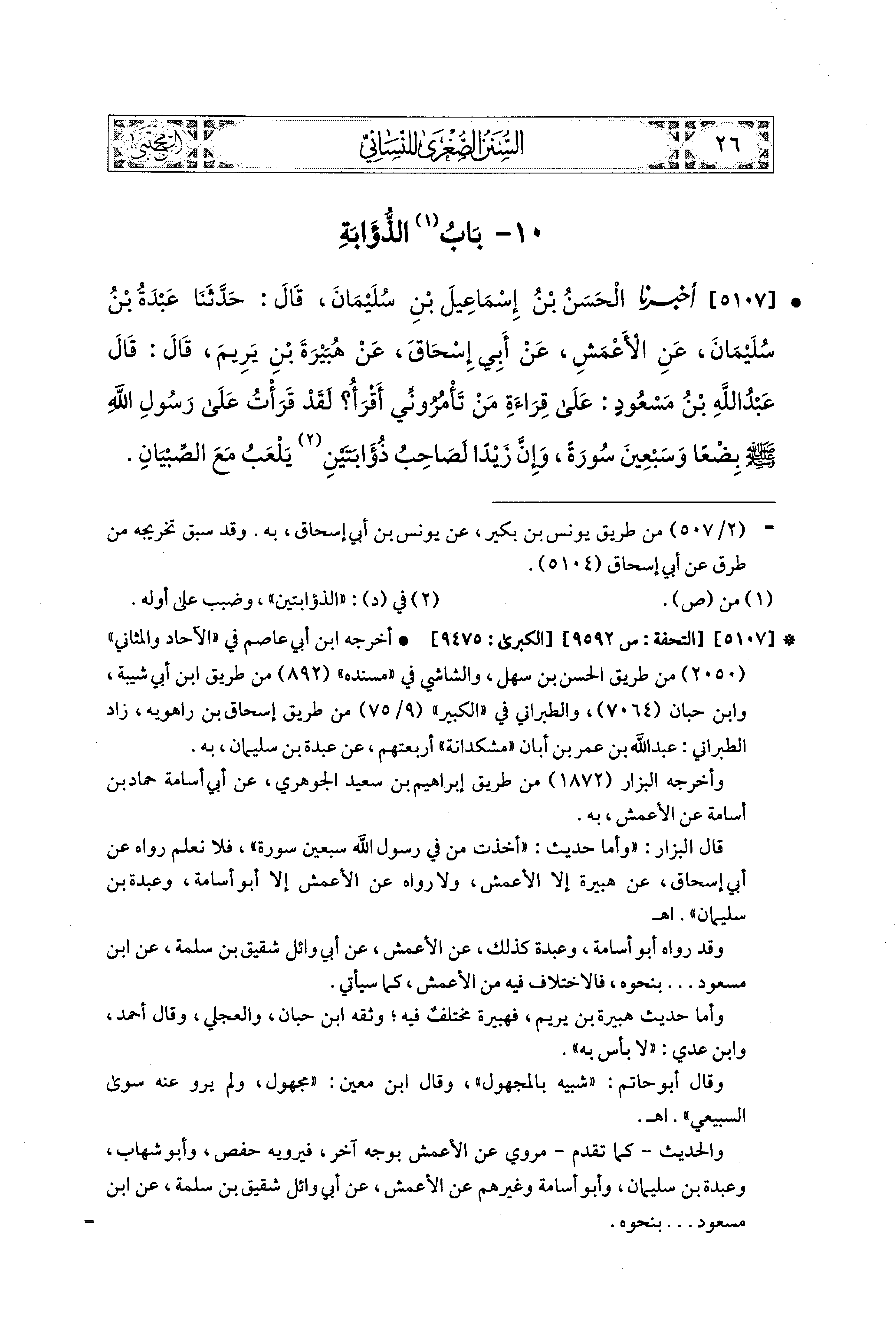 5107- أَخبَرَنا الحَسَنُ بنُ إِسماعِيلَ بْنِ سُلَيمَانَ، قال: حَدَّثنا عَبدَةُ بنُ سُلَيمَانَ، عَنِ الأَعْمَشِ، عَن أَبي إِسحَاقَ، عَن هُبَيْرَةَ بْنِ يَرِيمَ، قَالَ: قَالَ عَبدُ اللهِ بنُ مَسْعُودٍ: عَلَى قِرَاءَةِ مَنْ تَأْمُرُونِّي أَقْرَأُ، لَقَدْ قَرَأْتُ عَلَى رَسُولِ اللهِ صَلى الله عَليه وسَلم بِضْعًا وَسَبْعِينَ سُورَةً، وَإِنَّ زَيْدًا لَصَاحِبُ ذُؤَابَتَيْنِ يَلْعَبُ مَعَ الصِّبْيَانِ.