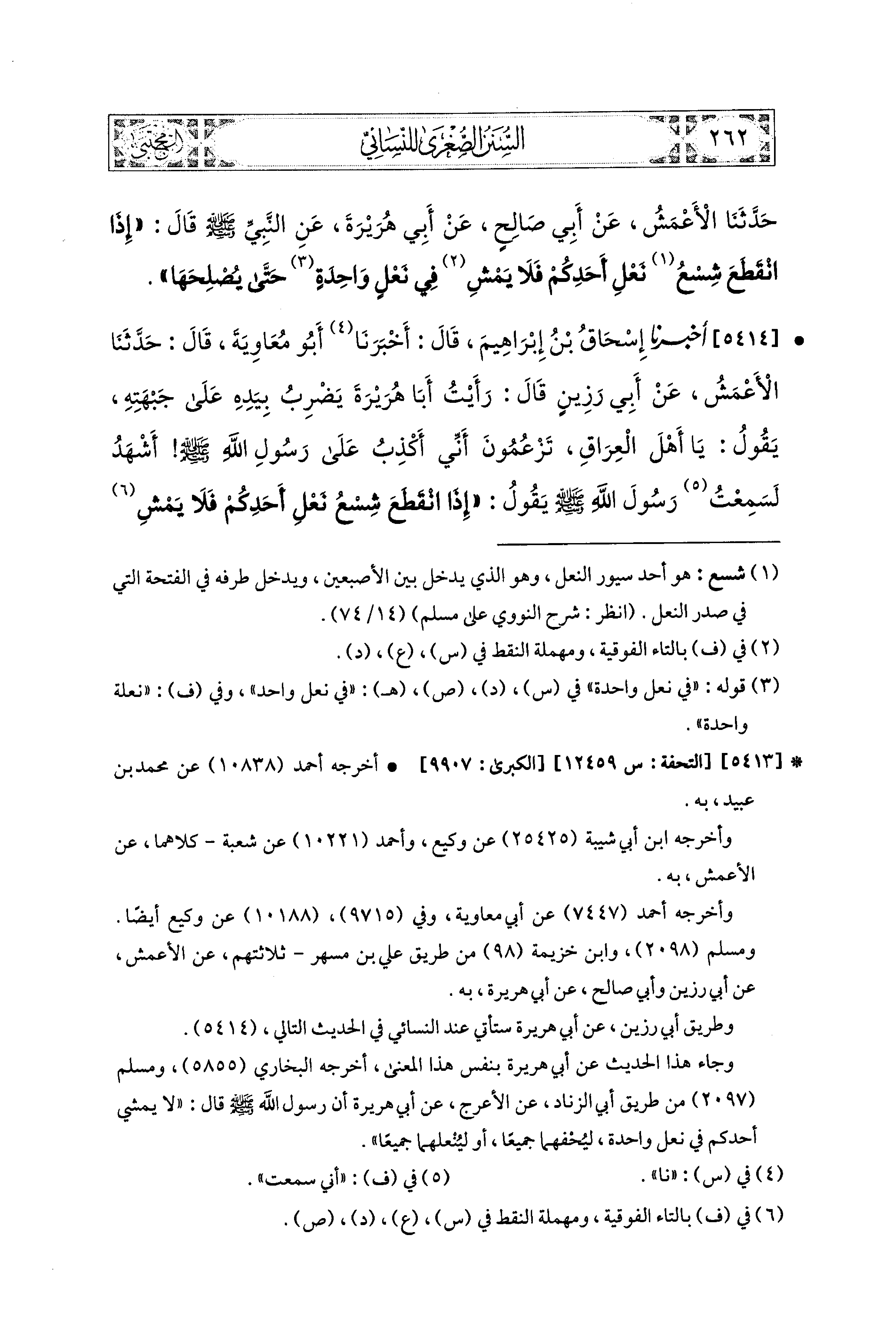 5414- أَخبَرَنا إِسحَاقُ بنُ إِبراهِيمَ، قَالَ: أَخبَرَنا أَبو مُعَاوِيَةَ، قال: حَدَّثنا الأَعْمَشُ، عَن أَبي رَزِينٍ، قَالَ: رَأَيْتُ أَبَا هُرَيْرَةَ يَضْرِبُ بِيَدِهِ عَلَى جَبْهَتِهِ يَقُولُ: يَا أَهْلَ العِرَاقِ تَزْعُمُونَ أَنِّي أَكْذِبُ عَلَى رَسُولِ اللهِ صَلى الله عَليه وسَلم، أَشْهَدُ لَسَمِعْتُ رَسُولَ اللهِ صَلى الله عَليه وسَلم يَقُولُ: إِذَا انْقَطَعَ شِسْعُ نَعْلِ أَحَدِكُمْ، فَلاَ يَمْشِ فِي الأُخْرَى حَتَّى يُصْلِحَهَا.