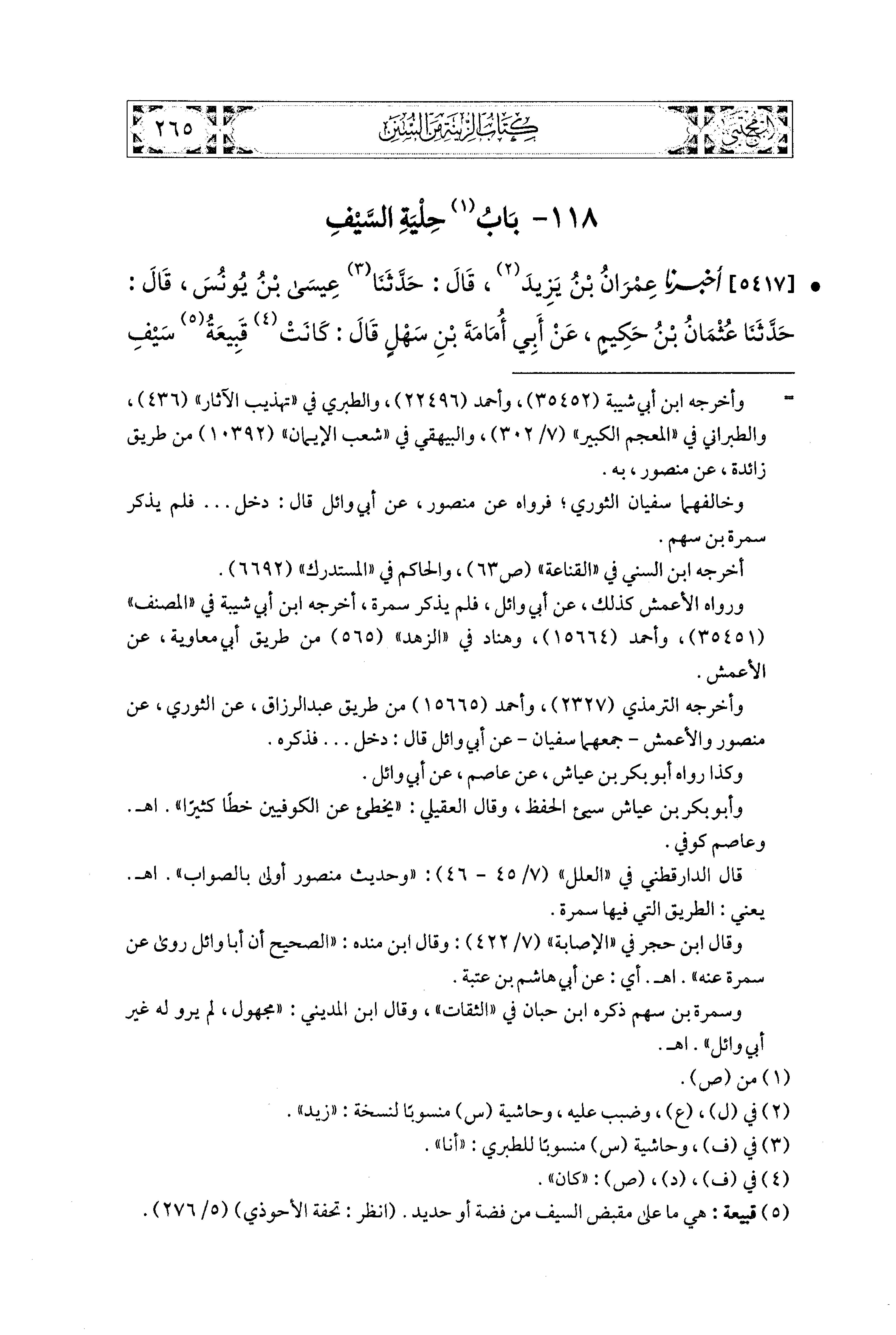 5417- أَخبَرَنا عِمْرَانُ بنُ يَزِيدَ، قال: حَدَّثنا عِيسَى بنُ يُونُسَ، قال: حَدَّثنا عُثْمَانُ بنُ حَكِيمٍ، عَن أَبي أُمَامَةَ بْنِ سَهْلٍ، قَالَ: كَانَتْ قَبِيعَةُ سَيْفِ رَسُولِ اللهِ صَلى الله عَليه وسَلم مِنْ فِضَّةٍ.