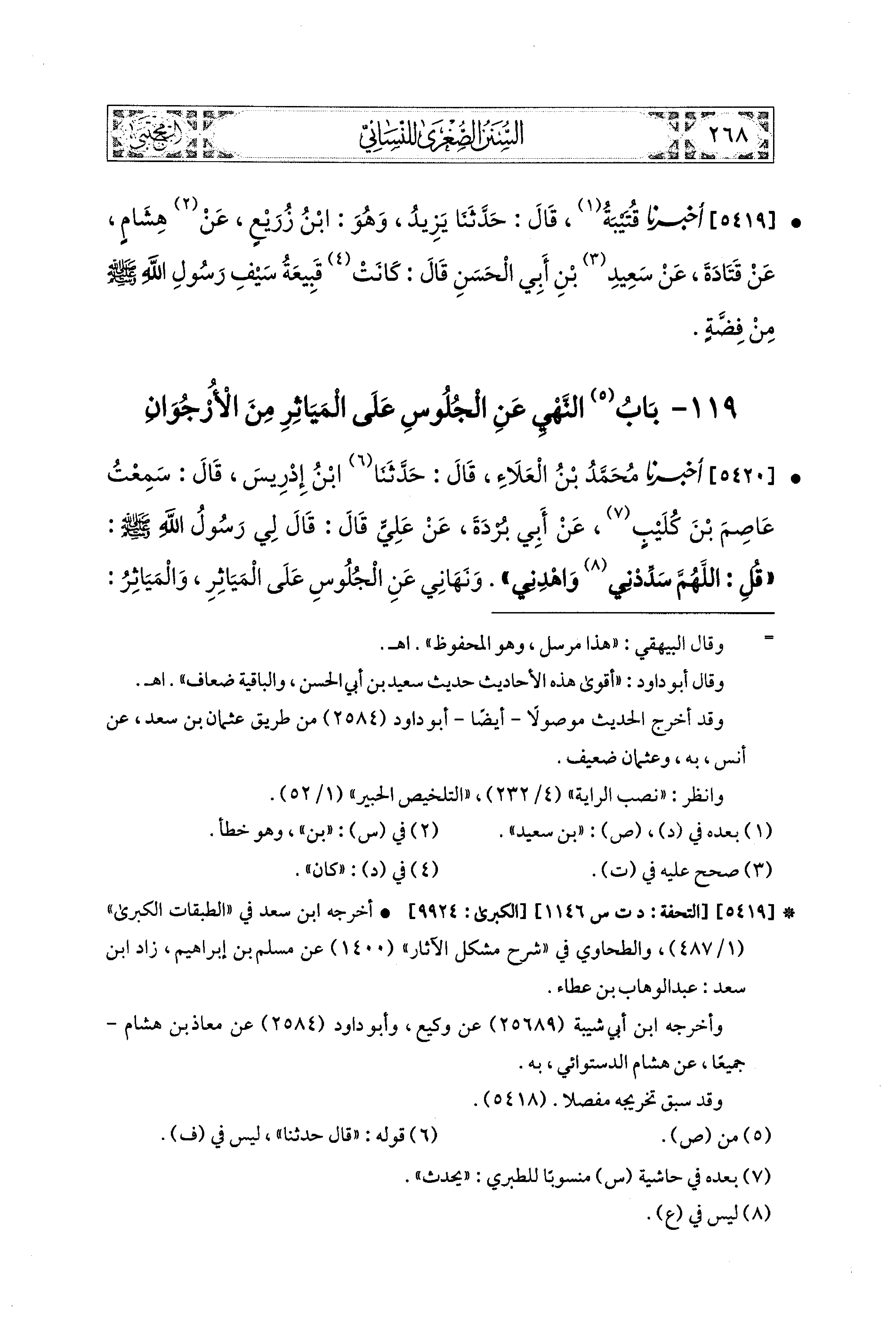 5420- أَخبَرَنا مُحَمد بنُ العَلاَءِ، قال: حَدَّثنا ابنُ إِدْرِيسَ، قَالَ: سَمِعْتُ عَاصِمَ بْنَ كُلَيْبٍ، عَن أَبي بُرْدَةَ، عَن عَلِيٍّ قَالَ: قَالَ لِي رَسُولُ اللهِ صَلى الله عَليه وسَلم: قُلِ اللهُمَّ سَدِّدْنِي وَاهْدِنِي، وَنَهَانِي عَنِ الجُلُوسِ عَلَى المَيَاثِرِ، وَالمَيَاثِرُ قَسِّيٌّ كَانَتْ تَصْنَعُهُ النِّسَاءُ لِبُعُولَتِهِنَّ عَلَى الرَّحْلِ كَالقَطَائِفِ مِنَ الأُرْجُوَانِ.