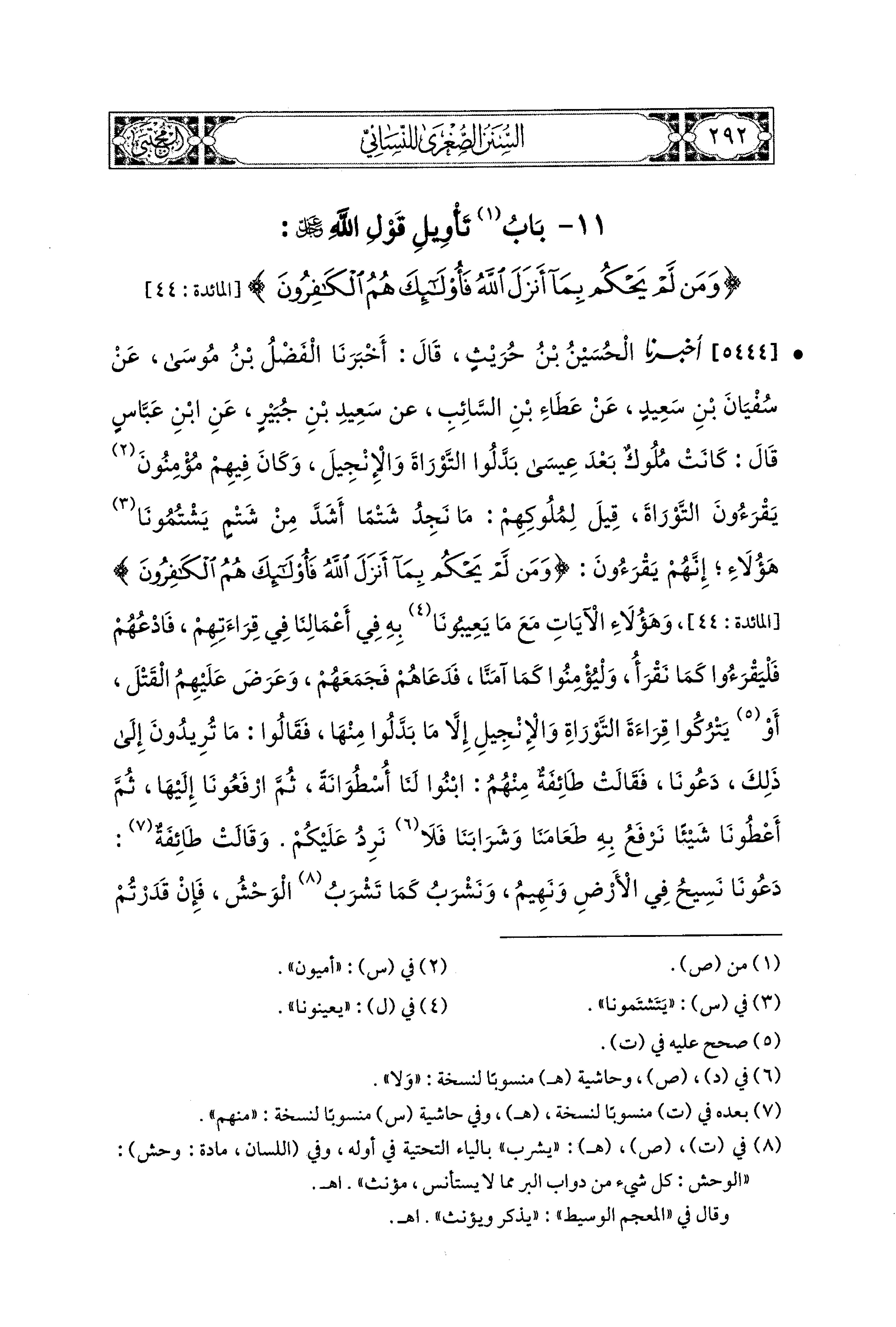 5444- أَخبَرَنا الحُسَيْنُ بنُ حُرَيْثٍ، قَالَ: أَخبرنا الفَضْلُ بنُ مُوسَى، عَن سُفيَانَ بْنِ سَعيدٍ، عَن عَطَاءِ بْنِ السَّائِبِ، عَن سَعيدِ بْنِ جُبَيْرٍ، عَنِ ابنِ عَبَّاسٍ، قَالَ: كَانَتْ مُلُوكٌ بَعْدَ عِيسَى بَدَّلُوا التَّوْرَاةَ وَالإِنْجِيلَ، وَكَانَ فِيهِمْ مُؤْمِنُونَ يَقْرَؤُونَ التَّوْرَاةَ, قِيلَ لِمُلُوكِهِمْ: مَا نَجِدُ شَتْمًا أَشَدَّ مِنْ شَتْمٍ يَشْتِمُونَا هَؤُلاَءِ، إِنَّهُمْ يَقْرَؤُونَ: {وَمَنْ لَمْ يَحْكُمْ بِمَا أَنْزَلَ اللهُ فَأُولَئِكَ هُمُ الكَافِرُونَ}، وَهَؤُلاَءِ الآيَاتُ مَعَ مَا يَعِيبُونَّا بِهِ فِي أَعْمَالِنَا فِي قِرَاءَتِهِمْ، فَادْعُهُمْ فَلْيَقْرَؤُوا كَمَا نَقْرَأُ، وَلْيُؤْمِنُوا كَمَا آمَنَّا، فَدَعَاهُمْ، فَجَمَعَهُمْ، وَعَرَضَ عَلَيهِمُ القَتْلَ، أَوْ يَتْرُكُوا قِرَاءَةَ التَّوْرَاةِ وَالإِنْجِيلِ، إِلاَّ مَا بَدَّلُوا مِنْهَا، فَقَالُوا: مَا تُرِيدُونَ إِلَى ذَلِكَ، دَعُونَا، فَقَالَتْ طَائِفَةٌ مِنْهُمْ: ابنُوا لَنَا أُسْطُوَانَةً ثُمَّ ارْفَعُونَا إِلَيْهَا، ثُمَّ اعْطُونَا شَيْئًا نَرْفَعُ بِهِ طَعَامَنَا وَشَرَابَنَا، فَلاَ نَرِدُ عَلَيْكُمْ، وَقَالَتْ طَائِفَةٌ: دَعُونَا نَسِيحُ فِي الأَرْضِ، وَنَهِيمُ وَنَشْرَبُ كَمَا تَشْرَبُ الوَحْشُ، فَإِنْ قَدَرْتُمْ عَلَيْنَا فِي أَرْضِكُمْ فَاقْتُلُونَا,