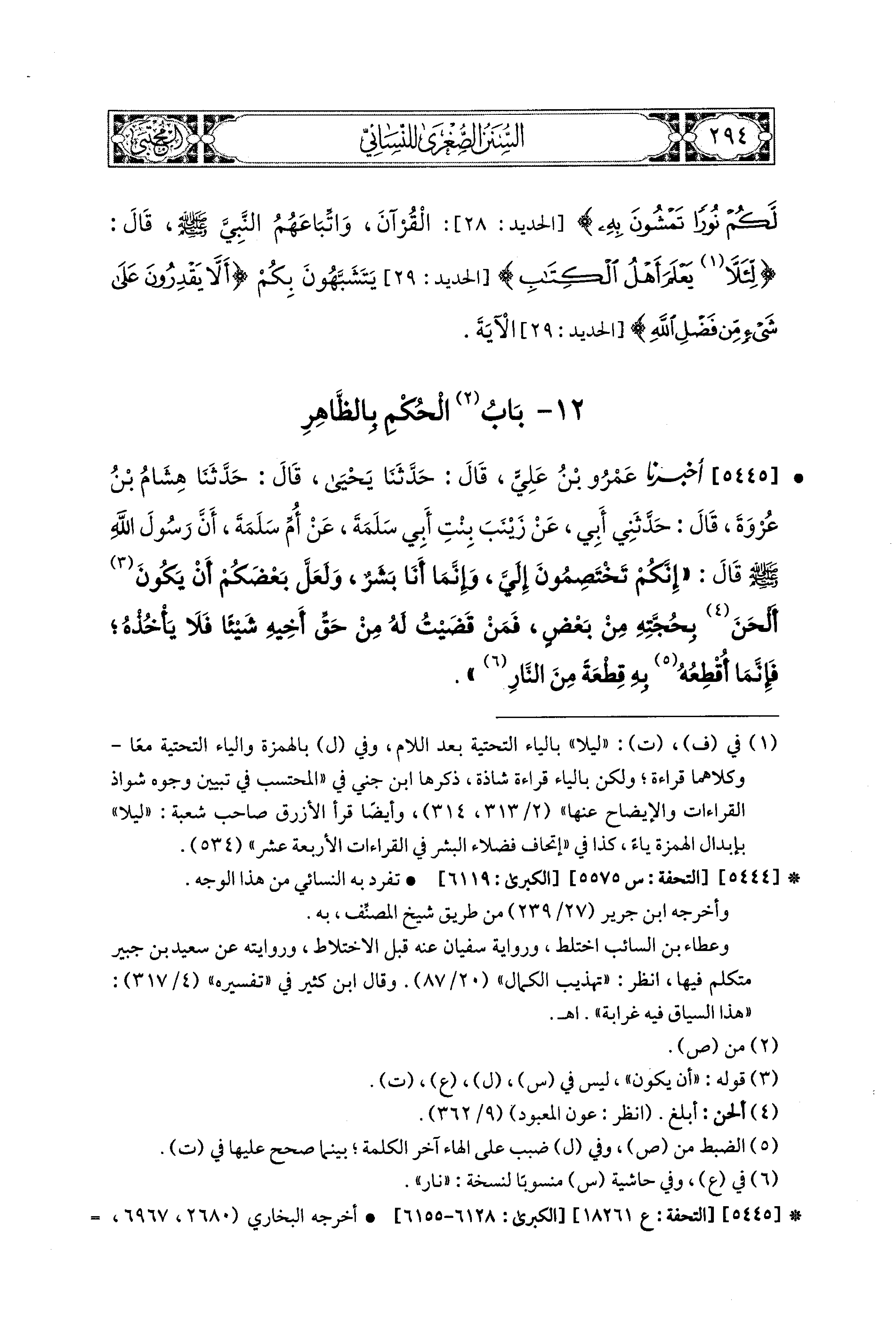 5445- أَخبَرَنا عَمْرُو بنُ عَلِيٍّ، قال: حَدَّثنا يَحيَى، قال: حَدَّثنا هِشَامُ بنُ عُرْوَةَ، قَالَ: حَدَّثني أَبي، عَن زَيْنَبَ بِنْتِ أَبي سَلَمَةَ، عَن أُمِّ سَلَمَةَ، أَنَّ رَسُولَ اللهِ صَلى الله عَليه وسَلم قَالَ: إِنَّكُمْ تَخْتَصِمُونَ إِلَيَّ، وَإِنَّمَا أَنَا بَشَرٌ، وَلَعَلَّ بَعْضَكُمْ أن يكون أَلْحَنُ بِحُجَّتِهِ مِنْ بَعْضٍ، فَمَنْ قَضَيْتُ لَهُ مِنْ حَقِّ أَخِيهِ شَيْئًا، فَلاَ يَأْخُذْهُ، فَإِنَّمَا أَقْطَعُهُ بِهِ قِطْعَةً مِنَ النَّارِ.