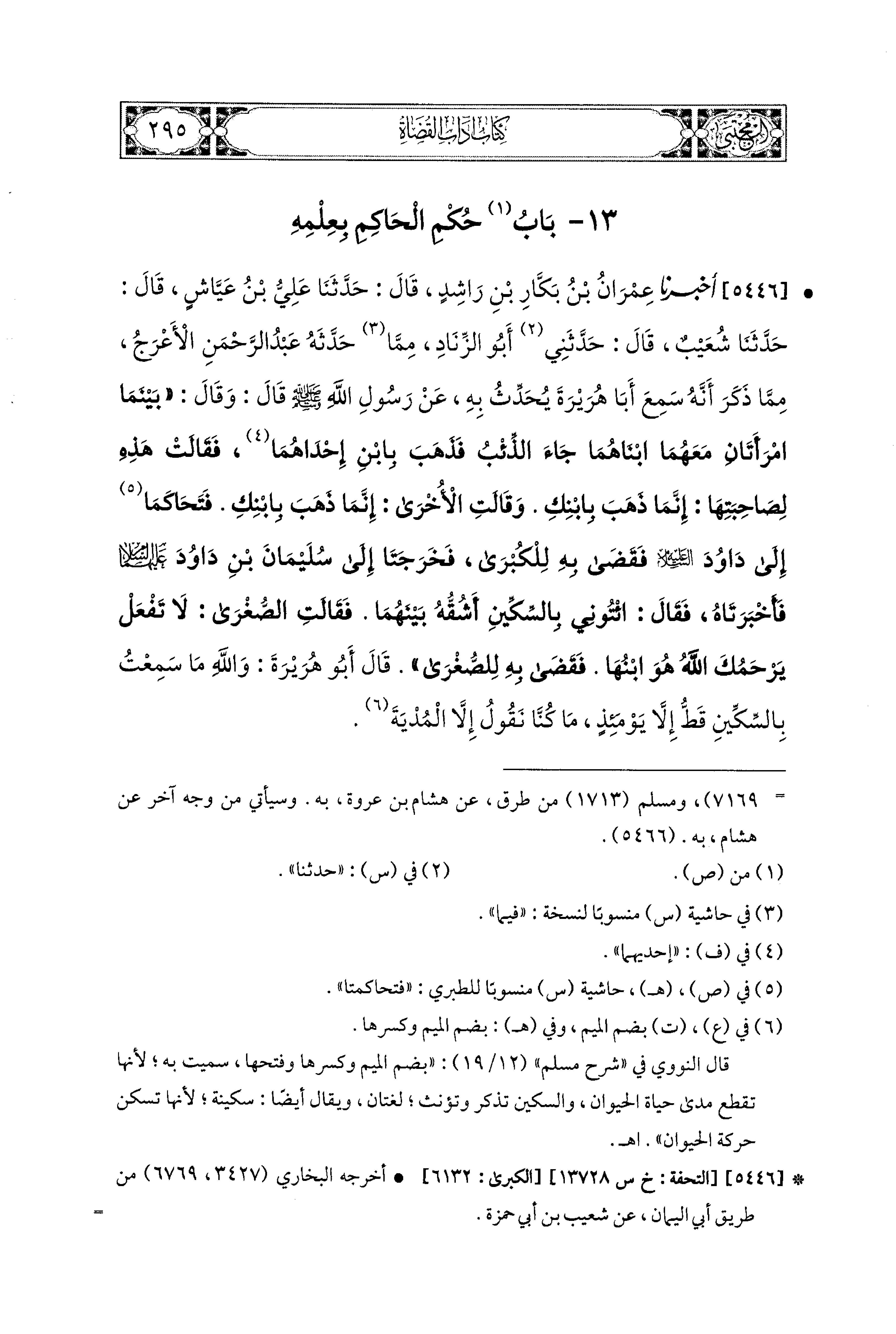 5446- أَخبَرَنا عِمْرَانُ بنُ بَكَّارِ بْنِ رَاشِدٍ، قال: حَدَّثنا عَلِيُّ بنُ عَيَّاشٍ، قال: حَدَّثنا شُعَيبٌ، قَالَ: حَدَّثني أَبو الزِّنَادِ، مِمَّا حَدَّثَهُ عَبدُ الرَّحْمَنِ الأَعْرَجُ، مِمَّا ذَكَرَ أَنَّهُ سَمِعَ أَبَا هُرَيْرَةَ يُحَدِّثُ بِهِ، عَن رَسُولِ اللهِ صَلى الله عَليه وسَلم قَالَ: وَقَالَ: بَيْنَمَا امْرَأَتَانِ مَعَهُمَا ابنَاهُمَا، جَاءَ الذِّئْبُ فَذَهَبَ بِابنِ إِحْدَاهُمَا، فَقَالَتْ هَذِهِ لِصَاحِبَتِهَا: إِنَّمَا ذَهَبَ بِابنِكِ، وَقَالَتِ الأُخْرَى: إِنَّمَا ذَهَبَ بِابنِكِ، فَتَحَاكَمَتَا(1) إِلَى دَاوُدَ عَلَيهِ السَّلاَمُ، فَقَضَى بِهِ لِلْكُبْرَى، فَخَرَجَتَا إِلَى سُلَيمَانَ بْنِ دَاوُدَ عليهما السلام، فَأَخْبَرَتَاهُ، فَقَالَ: ائْتُونِي بِالسِّكِّينِ أَشُقُّهُ بَيْنَهُمَا، فَقَالَتِ الصُّغْرَى: لاَ تَفْعَلْ يَرْحَمُكَ اللهُ، هُوَ ابنُهَا، فَقَضَى بِهِ لِلصُّغْرَى، قَالَ أَبو هُرَيْرَةَ: وَاللَّهِ مَا سَمِعْتُ بِالسِّكِّينِ قَطُّ إِلاَّ يَوْمَئِذٍ، مَا كُنَّا نَقُولُ إِلاَّ المُدْيَةَ.