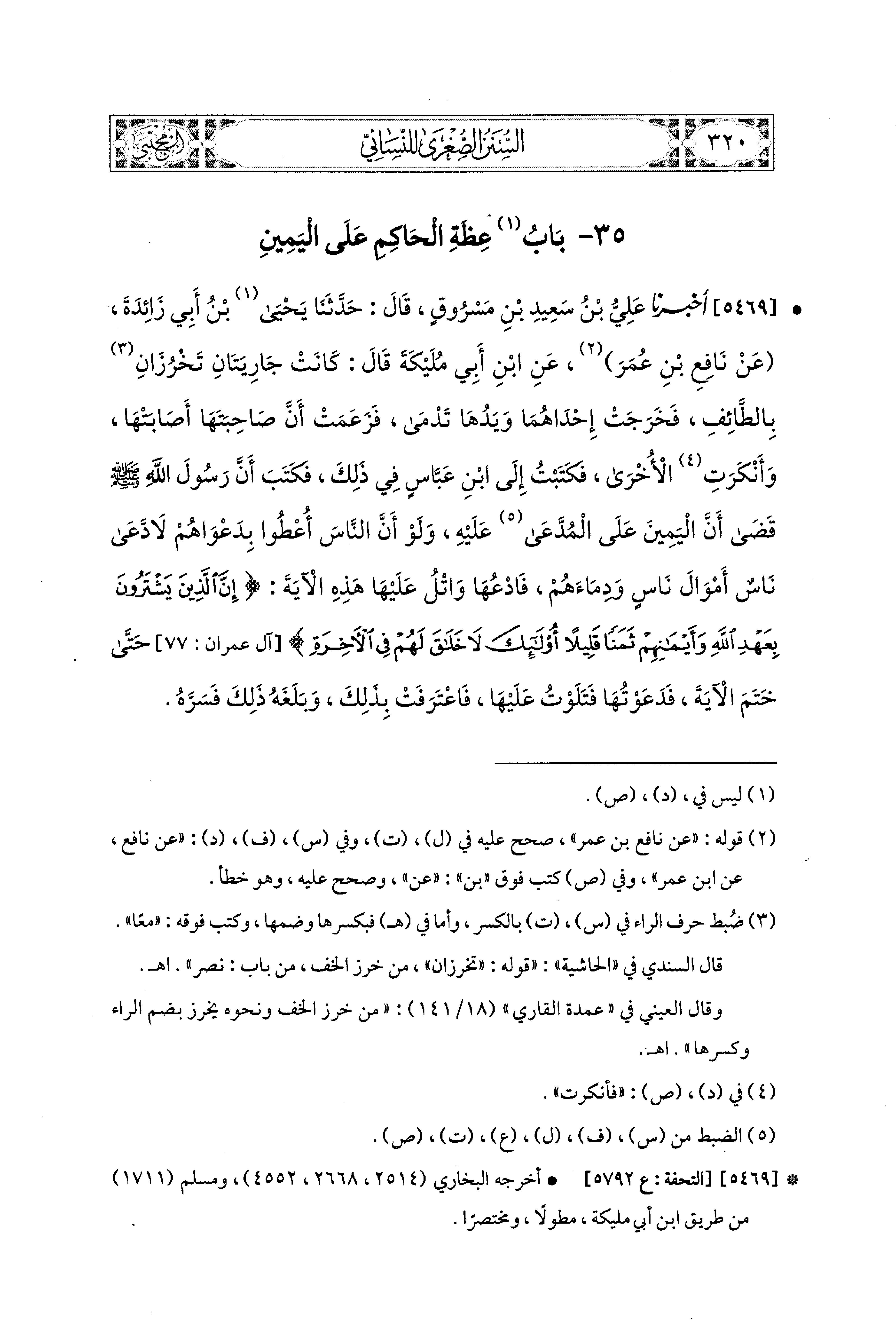 5469- أَخبَرَنا عَلِيُّ بنُ سَعيدِ بْنِ مَسْرُوقٍ، قال: حَدَّثنا يَحيَى بنُ أَبي زَائِدَةَ، عَن نَافِعِ بْنِ عُمَرَ، عَنِ ابنِ أَبي مُلَيْكَةَ، قَالَ: كَانَتْ جَارِيَتَانِ تَخْرُزَانِ بِالطَّائِفِ، فَخَرَجَتْ إِحْدَاهُمَا وَيَدُهَا تَدْمَى، فَزَعَمَتْ أَنَّ صَاحِبَتَهَا أَصَابَتْهَا، وَأَنْكَرَتِ الأُخْرَى، فَكَتَبْتُ إِلَى ابنِ عَبَّاسٍ فِي ذَلِكَ، فَكَتَبَ أَنَّ رَسُولَ اللهِ صَلى الله عَليه وسَلم قَضَى أَنَّ اليَمِينَ عَلَى المُدَّعَى عَلَيهِ، وَلَوْ أَنَّ النَّاسَ أُعْطُوا بِدَعْوَاهُمْ لاَدَّعَى نَاسٌ أَمْوَالَ نَاسٍ وَدِمَاءَهُمْ، فَادْعُهَا وَاتْلُ عَلَيهَا هَذِهِ الآيَةَ: {إِنَّ الَّذِينَ يَشْتَرُونَ بِعَهْدِ اللهِ وَأَيْمَانِهِمْ ثَمَنًا قَلِيلاً أُولَئِكَ لاَ خَلاَقَ لَهُمْ فِي الآخِرَةِ} حَتَّى خَتَمَ الآيَةَ، فَدَعَوْتُهَا فَتَلَوْتُ عَلَيهَا فَاعْتَرَفَتْ بِذَلِكَ، وَبَلَغَهُ ذَلِكَ فَسَرَّهُ.