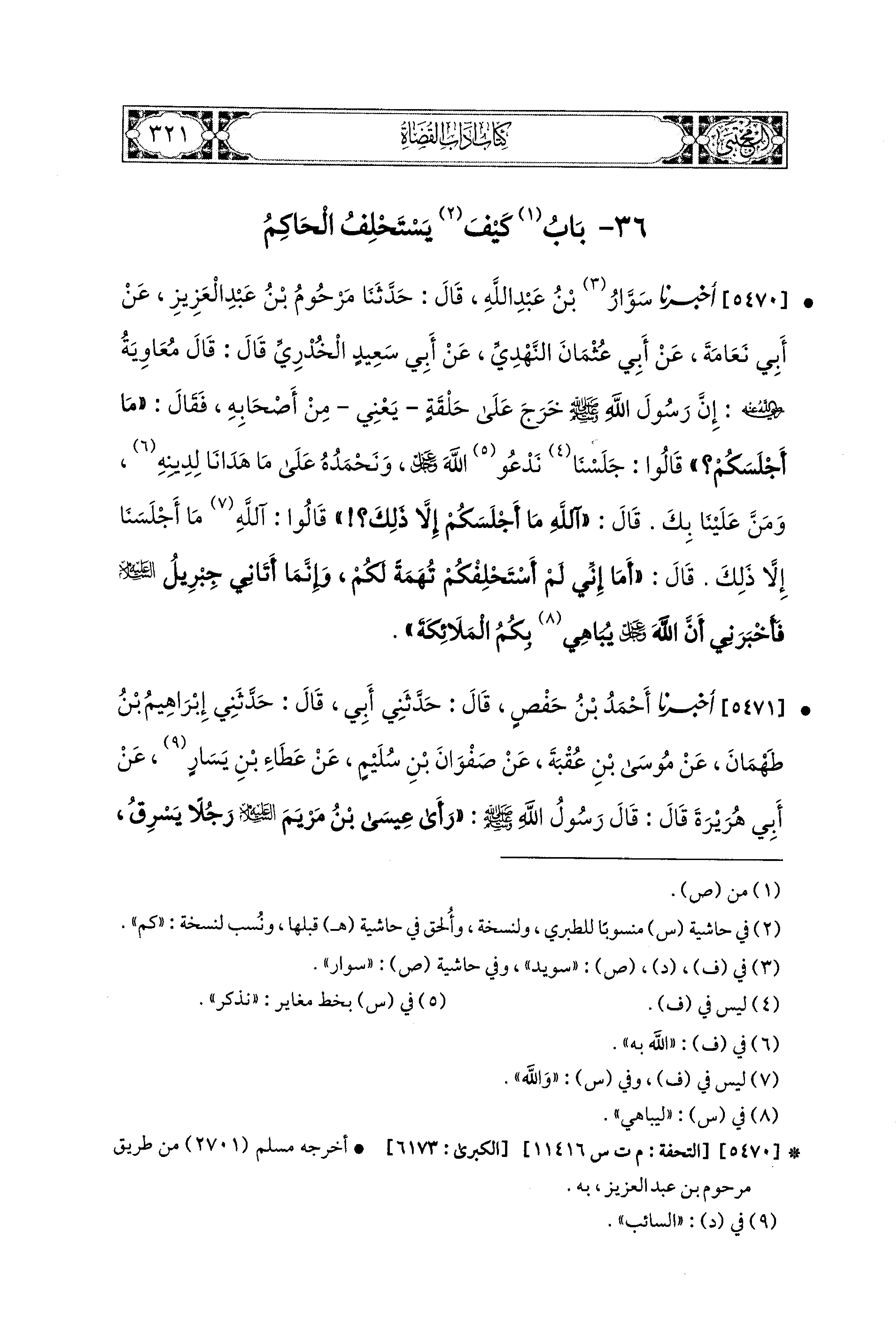 5470- أَخبَرَنا سَوُّارُ بنُ عَبدِ اللهِ، قال: حَدَّثنا مَرْحُومُ بنُ عَبدِ العَزِيزِ، عَن أَبي نَعَامَةَ، عَن أَبي عُثْمَانَ النَّهْدِيِّ، عَن أَبي سَعيدٍ الخُدْرِيِّ قَالَ: قَالَ مُعَاوِيَةُ رَضِيَ اللهُ عَنهُ: إِنَّ رَسُولَ اللهِ صَلى الله عَليه وسَلم خَرَجَ عَلَى حَلْقَةٍ يَعْنِي مِنْ أَصْحَابِهِ، فَقَالَ: مَا أَجْلَسَكُمْ؟ قَالُوا: جَلَسْنَا نَدْعُو اللهَ عز وجل وَنَحْمَدُهُ عَلَى مَا هَدَانَا لِدِينِهِ، وَمَنَّ عَلَيْنَا بِكَ، قَالَ: آللَّهُ مَا أَجْلَسَكُمْ إِلاَّ ذَلِكَ؟ قَالُوا: آللَّهُ مَا أَجْلَسَنَا إِلاَّ ذَلِكَ، قَالَ: أَمَا إِنِّي لَمْ أَسْتَحْلِفْكُمْ تُهَمَةً لَكُمْ، وَإِنَّمَا أَتَانِي جِبْرِيلُ عَلَيهِ السَّلاَمُ فَأَخْبَرَنِي أَنَّ اللهَ عَزَّ وَجَلَّ يُبَاهِي بِكُمُ المَلاَئِكَةَ.