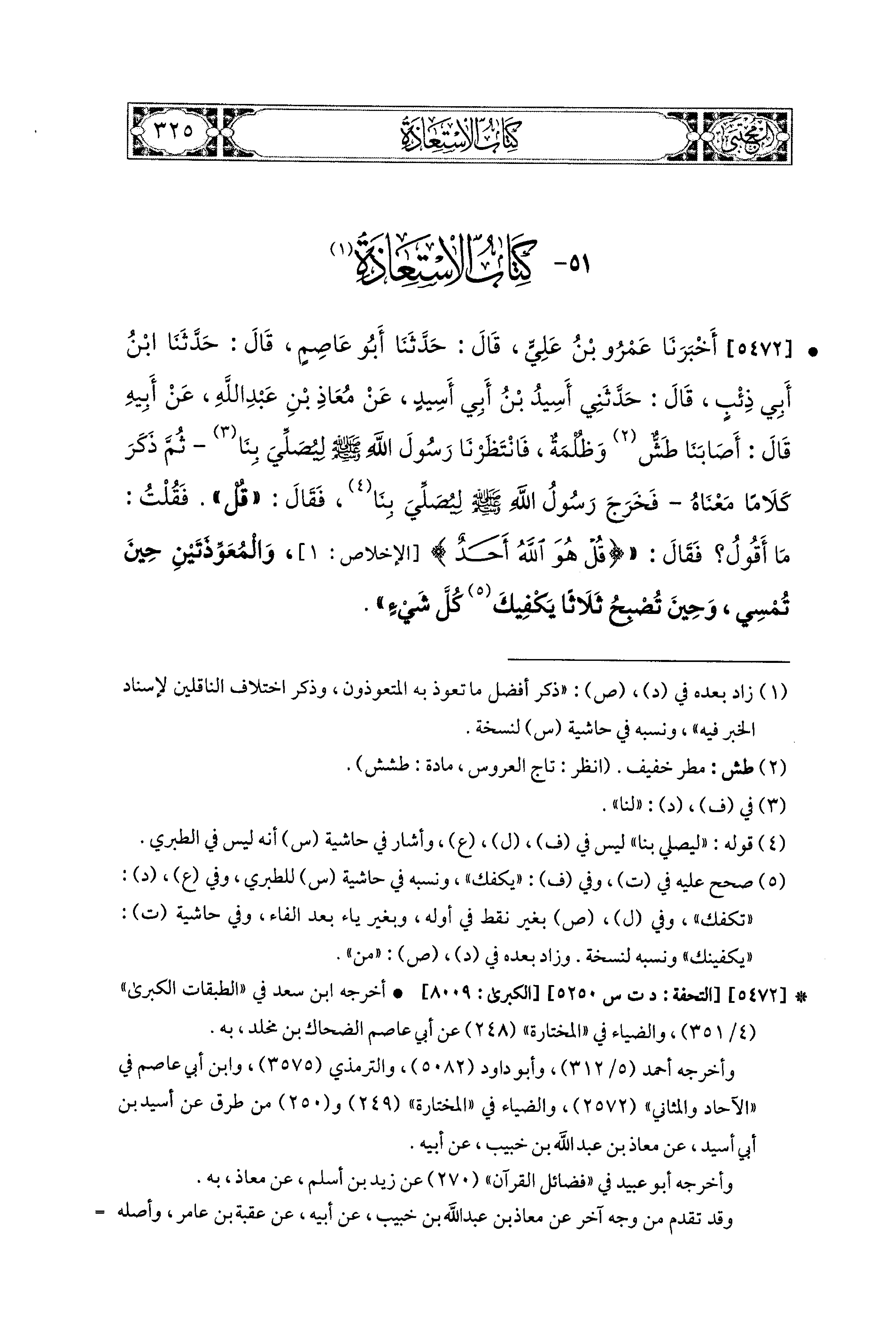 5472 - أَخبرنا عَمْرُو بنُ عَلِيٍّ، قال: حَدَّثنا أَبو عَاصِمٍ، قال: حَدَّثنا ابنُ أَبي ذِئْبٍ، قَالَ: حَدَّثني أَسِيدُ بنُ أَبي أَسِيدٍ، عَن مُعَاذِ بْنِ عَبدِ اللهِ، عَن أَبيهِ، قَالَ: أَصَابَنَا طَشٌّ وَظُلْمَةٌ، فَانْتَظَرْنَا رَسُولَ اللهِ صَلى الله عَليه وسَلم لِيُصَلِّيَ بِنَا، ثُمَّ ذَكَرَ كَلاَمًا مَعْنَاهُ، فَخَرَجَ رَسُولُ اللهِ صَلى الله عَليه وسَلم لِيُصَلِّيَ بِنَا، فَقَالَ: قُلْ: فَقُلْتُ: مَا أَقُولُ؟ فَقَالَ: {قُلْ هُوَ اللهُ أَحَدٌ}، وَالمُعَوِّذَتَيْنِ حِينَ تُمْسِي، وَحِينَ تُصْبِحُ، ثَلاَثًا يَكْفِيكَ كُلَّ شَيْءٍ.