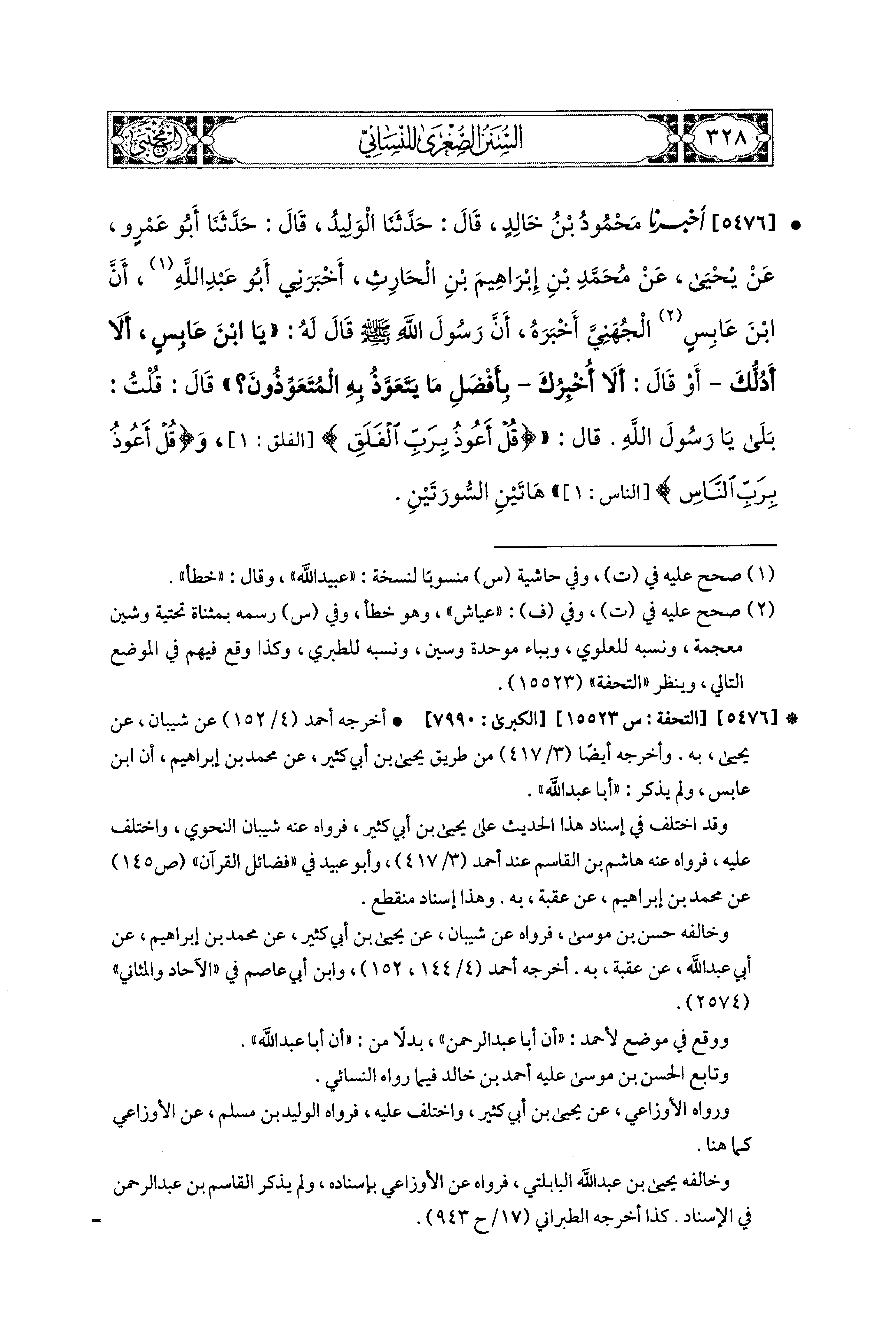 5476- أَخبَرَنا مَحْمُودُ بنُ خَالِدٍ، قال: حَدَّثنا الوَلِيدُ، قال: حَدَّثنا أَبو عَمْرٍو، عَن يَحيَى، عَن مُحَمدِ بْنِ إِبراهِيمَ بْنِ الحَارِثِ، أَخْبَرَنِي أَبو عَبدِ اللهِ، أَنَّ ابنَ عَابِسٍ الجُهَنِيَّ أَخْبَرَه، أَنَّ رَسُولَ اللهِ صَلى الله عَليه وسَلم قَالَ لَهُ: يَا ابنَ عَابِسٍ أَلاَ أَدُلُّكَ، أَوْ قَالَ: أَلاَ أُخْبِرُكَ بِأَفْضَلِ مَا يَتَعَوَّذُ بِهِ المُتَعَوِّذُونَ؟ قَالَ: قلت: بَلَى يَا رَسُولَ اللهِ، قَالَ: {قُلْ أَعُوذُ بِرَبِّ الفَلَقِ}، وَ {قُلْ أَعُوذُ بِرَبِّ النَّاسِ} هَاتَيْنِ السُّورَتَيْنِ.