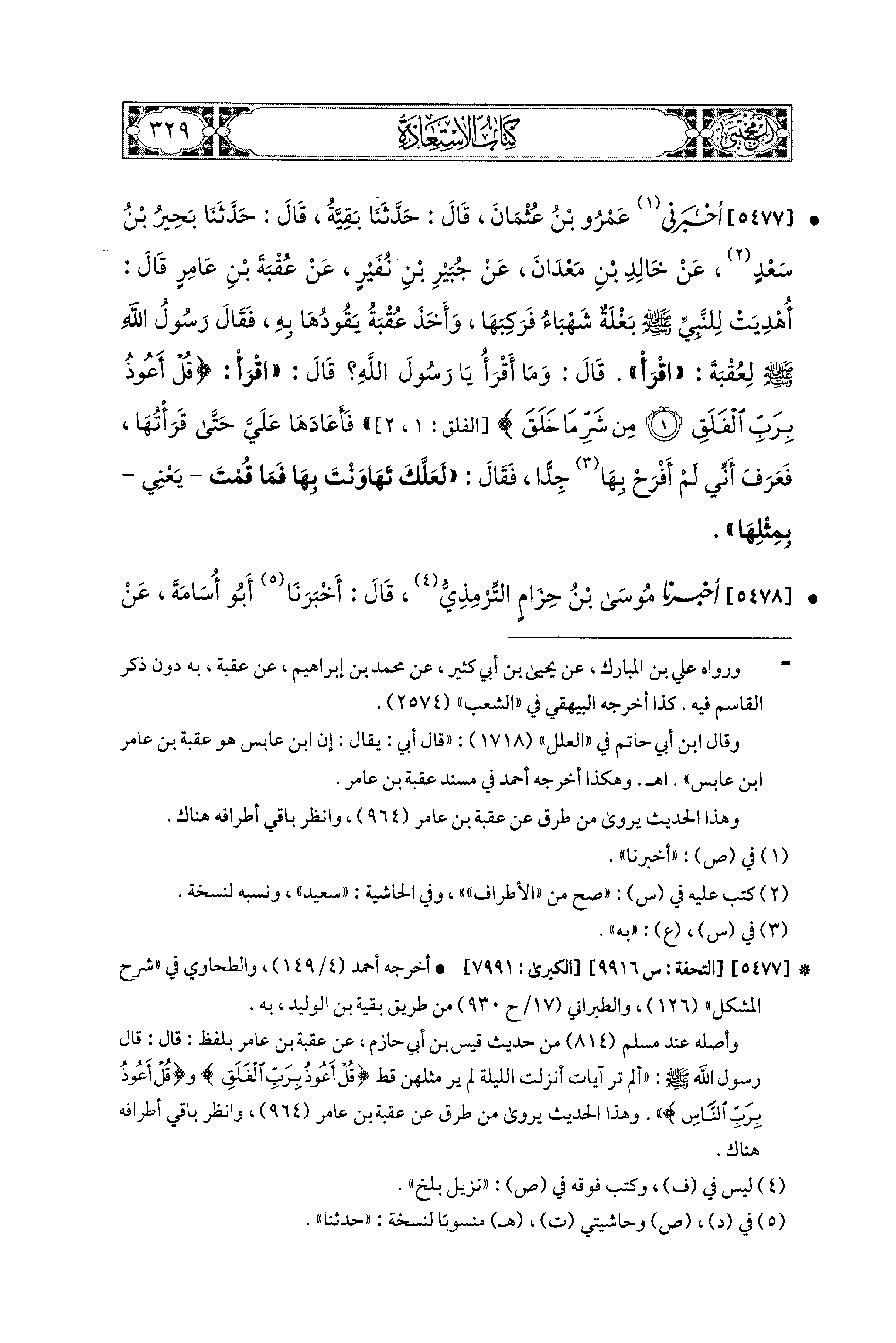 5477- أَخْبَرَنِي عَمْرُو بنُ عُثْمَانَ، قال: حَدَّثنا بَقِيَّةُ، قال: حَدَّثنا بَحِيرُ بنُ سَعْدٍ، عَن خَالِدِ بْنِ مَعْدَانَ، عَن جُبَيْرِ بْنِ نُفَيْرٍ، عَن عُقْبَةَ بْنِ عَامِرٍ قَالَ: أُهْدِيَتْ لِلنَّبِيِّ صَلى الله عَليه وسَلم بَغْلَةٌ شَهْبَاءُ فَرَكِبَهَا، وَأَخَذَ عُقْبَةُ يَقُودُهَا بِهِ، فَقَالَ رَسُولُ اللهِ صَلى الله عَليه وسَلم لِعُقْبَةَ: اقْرَأْ، قَالَ: وَمَا أَقْرَأُ يَا رَسُولَ اللهِ؟ قَالَ: اقْرَأْ {قُلْ أَعُوذُ بِرَبِّ الفَلَقِ مِنْ شَرِّ مَا خَلَقَ} فَأَعَادَهَا عَلَيَّ حَتَّى قَرَأْتُهَا، فَعَرَفَ أَنِّي لَمْ أَفْرَحْ بِهَا جِدًّا، فَقَالَ: لَعَلَّكَ تَهَاوَنْتَ بِهَا، فَمَا قُمْتَ، يَعْنِي بِمِثْلِهَا.