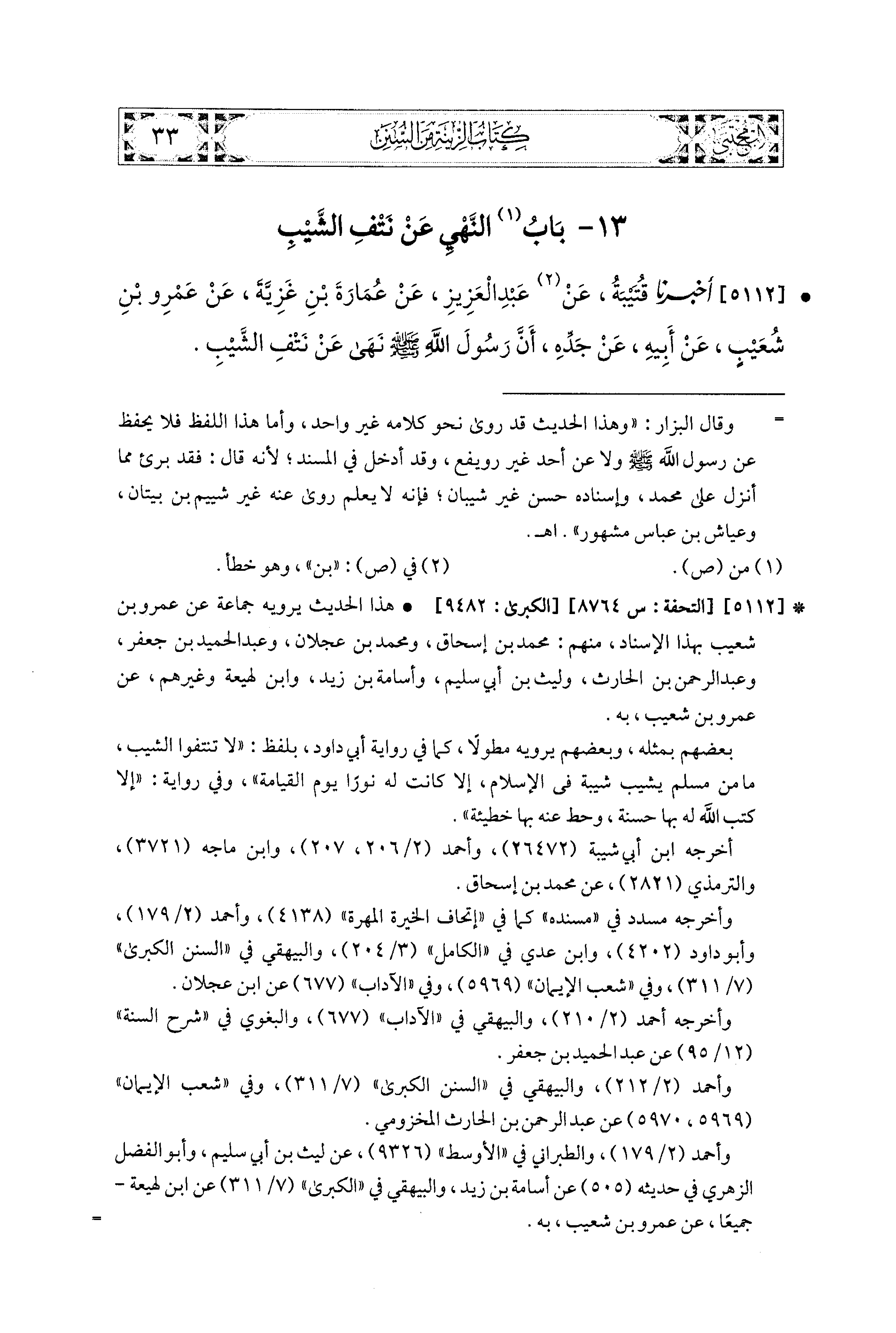 5112- أَخبَرَنا قُتَيبَةُ، عَن عَبدِ العَزِيزِ، عَن عُمَارَةَ بْنِ غَزِيَّةَ، عَن عَمْرِو بْنِ شُعَيبٍ، عَن أَبيهِ، عَن جَدِّهِ، أَنَّ رَسُولَ اللهِ صَلى الله عَليه وسَلم نَهَى عَن نَتْفِ الشَّيْبِ.