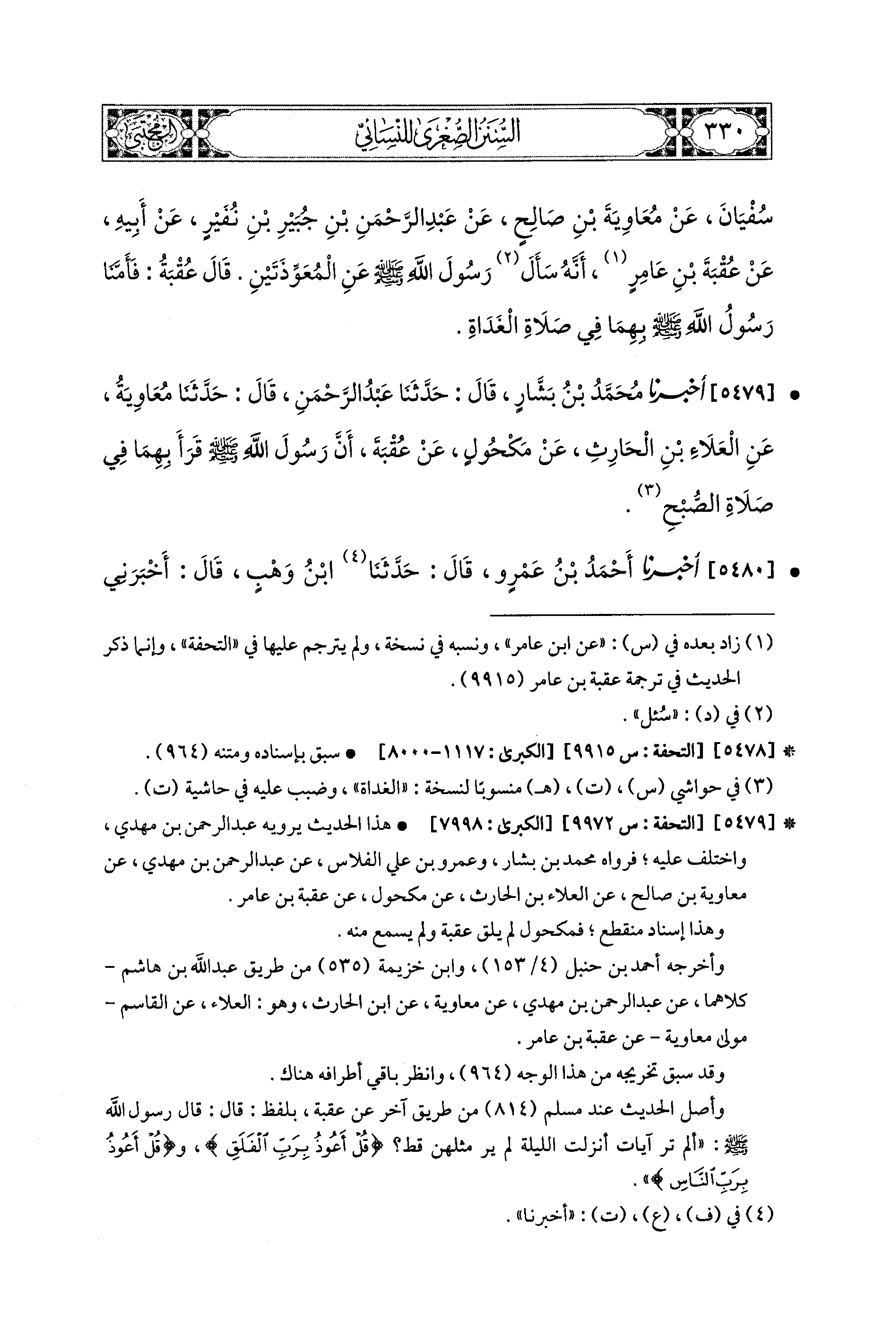 5479- أَخبَرَنا مُحَمد بنُ بَشَّارٍ، قال: حَدَّثنا عَبدُ الرَّحْمَنِ، قال: حَدَّثنا مُعَاوِيَةُ، عَنِ العَلاَءِ بْنِ الحَارِثِ، عَن مَكْحُولٍ، عَن عُقْبَةَ؛ أَنَّ رَسُولَ اللهِ صَلى الله عَليه وسَلم قَرَأَ بِهِمَا فِي صَلاَةِ الصُّبْحِ.