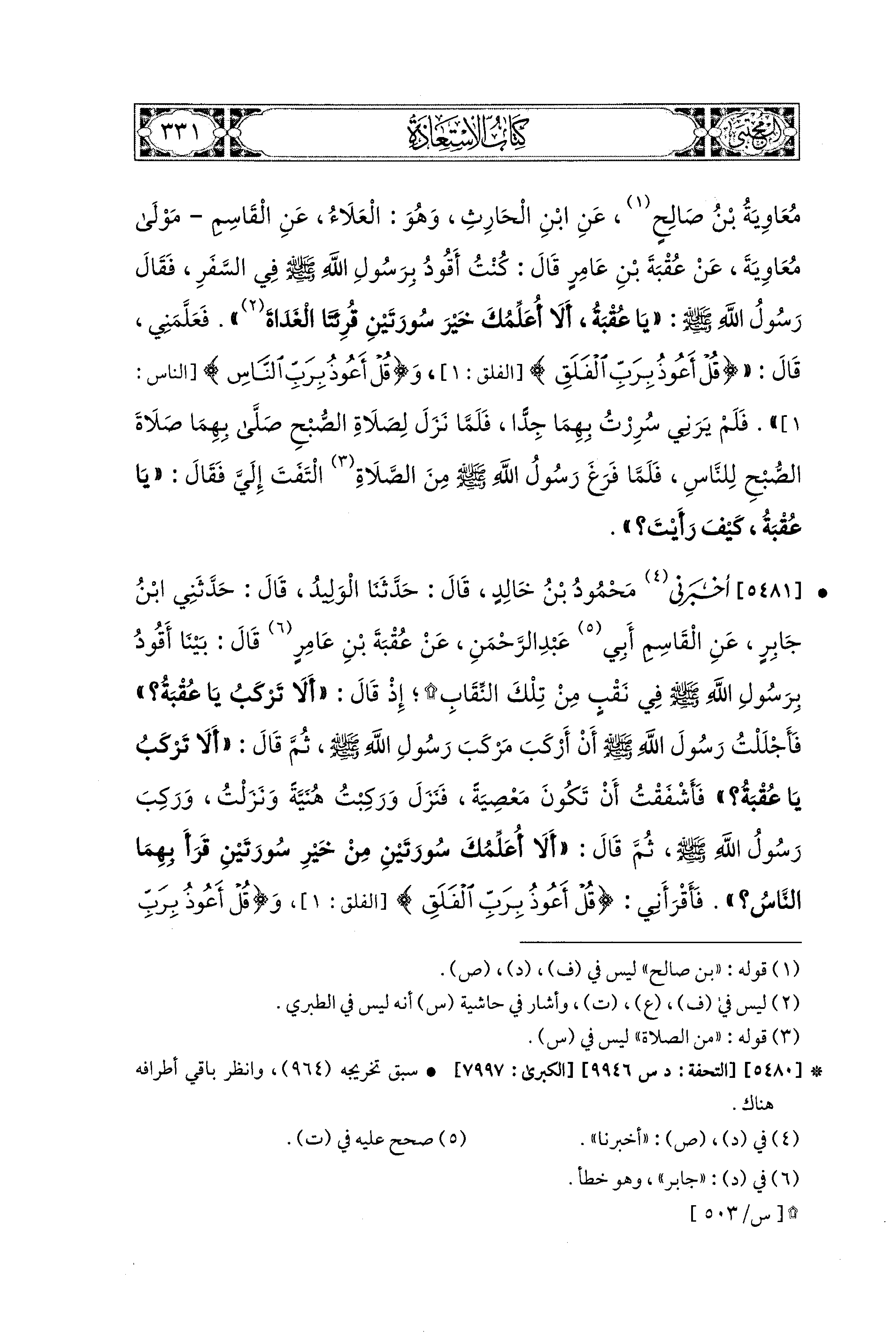 5481- أَخْبَرَنِي مَحْمُودُ بنُ خَالِدٍ، قال: حَدَّثنا الوَلِيدُ، قَالَ: حَدَّثني ابنُ جَابِرٍ، عَنِ القَاسِمِ أَبي عَبدِ الرَّحْمَنِ، عَن عُقْبَةَ بْنِ عَامِرٍ، قَالَ: بَيْنَا أَقُودُ بِرَسُولِ اللهِ صَلى الله عَليه وسَلم فِي نَقَبٍ مِنْ تِلْكَ النِّقَابِ، إِذْ قَالَ: أَلاَ تَرْكَبُ يَا عُقْبَةُ؟ فَأَجْلَلْتُ رَسُولَ اللهِ صَلى الله عَليه وسَلم أَنْ أَرْكَبْ مَرْكَبَ رَسُولِ اللهِ صَلى الله عَليه وسَلم، ثُمَّ قَالَ: أَلاَ تَرْكَبُ يَا عُقْبَةُ؟ فَأَشْفَقْتُ أَنْ يَكُونَ مَعْصِيَةً، فَنَزَلَ وَرَكِبْتُ هُنَيْهَةً، وَنَزَلْتُ، وَرَكِبَ رَسُولُ اللهِ صَلى الله عَليه وسَلم، ثُمَّ قَالَ: أَلاَ أُعَلِّمُكَ سُورَتَيْنِ مِنْ خَيْرِ سُورَتَيْنِ قَرَأَ بِهِمَا النَّاسُ؟ فَأَقْرَأَنِي: {قُلْ أَعُوذُ بِرَبِّ الفَلَقِ} وَ {قُلْ أَعُوذُ بِرَبِّ النَّاسِ} فَأُقِيمَتِ الصَّلاَةُ، فَتَقَدَّمَ فَقَرَأَ بِهِمَا، ثُمَّ مَرَّ بِي، فَقَالَ: كَيْفَ رَأَيْتَ يَا عُقْبَةَ؟ اقْرَأْ بِهِمَا كُلَّمَا نِمْتَ وَقُمْتَ.