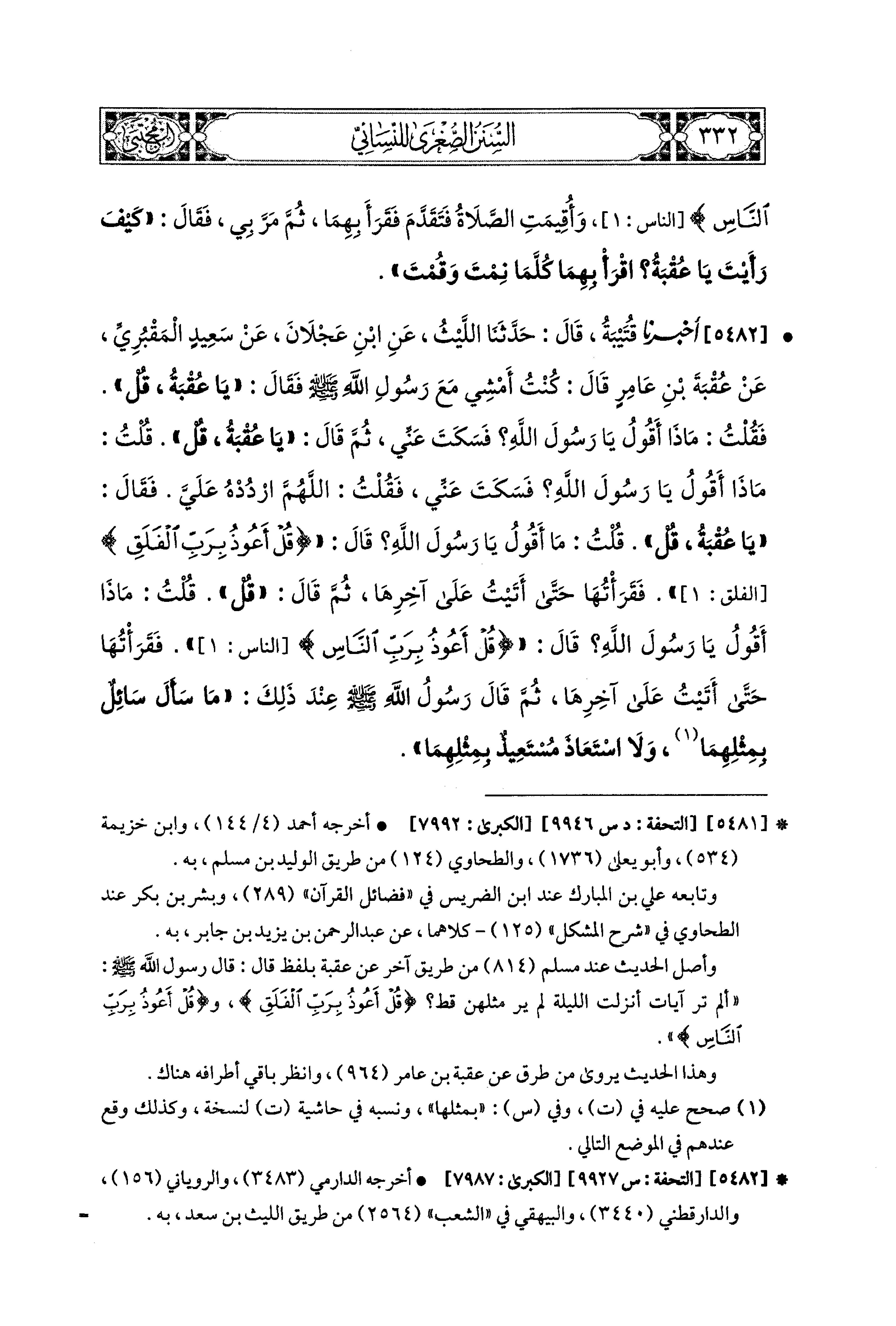 5482- أَخبَرَنا قُتَيبَةُ، قال: حَدَّثنا اللَّيْثُ، عَنِ ابنِ عَجْلاَنَ، عَن سَعيدٍ المَقْبُرِيِّ، عَن عُقْبَةَ بْنِ عَامِرٍ، قَالَ: كُنْتُ أَمْشِي مَعَ رَسُولِ اللهِ صَلى الله عَليه وسَلم، فَقَالَ: يَا عُقْبَةُ، قُلْ: فَقُلْتُ: مَاذَا أَقُولُ يَا رَسُولَ اللهِ؟ فَسَكَتَ عَنِّي، ثُمَّ قَالَ: يَا عُقْبَةُ، قُلْ: قُلْتُ: مَاذَا أَقُولُ يَا رَسُولَ اللهِ؟ فَسَكَتَ عَنِّي، فَقُلْتُ: اللهُمَّ ارْدُدْهُ عَلَيَّ، فَقَالَ: يَا عُقْبَةُ، قُلْ: قُلْتُ: مَاذَا أَقُولُ يَا رَسُولَ اللهِ؟ قَالَ: {قُلْ أَعُوذُ بِرَبِّ الفَلَقِ}، فَقَرَأْتُهَا حَتَّى أَتَيْتُ عَلَى آخِرِهَا، ثُمَّ قَالَ: قُلْ: قُلْتُ: مَاذَا أَقُولُ يَا رَسُولَ اللهِ؟ قَالَ: {قُلْ أَعُوذُ بِرَبِّ النَّاسِ} فَقَرَأْتُهَا حَتَّى أَتَيْتُ عَلَى آخِرِهَا، ثُمَّ قَالَ رَسُولُ اللهِ صَلى الله عَليه وسَلم عِنْدَ ذَلِكَ: مَا سَأَلَ سَائِلٌ بِمِثْلِهِمَا، وَلاَ اسْتَعَاذَ مُسْتَعِيذٌ بِمِثْلِهِمَا.