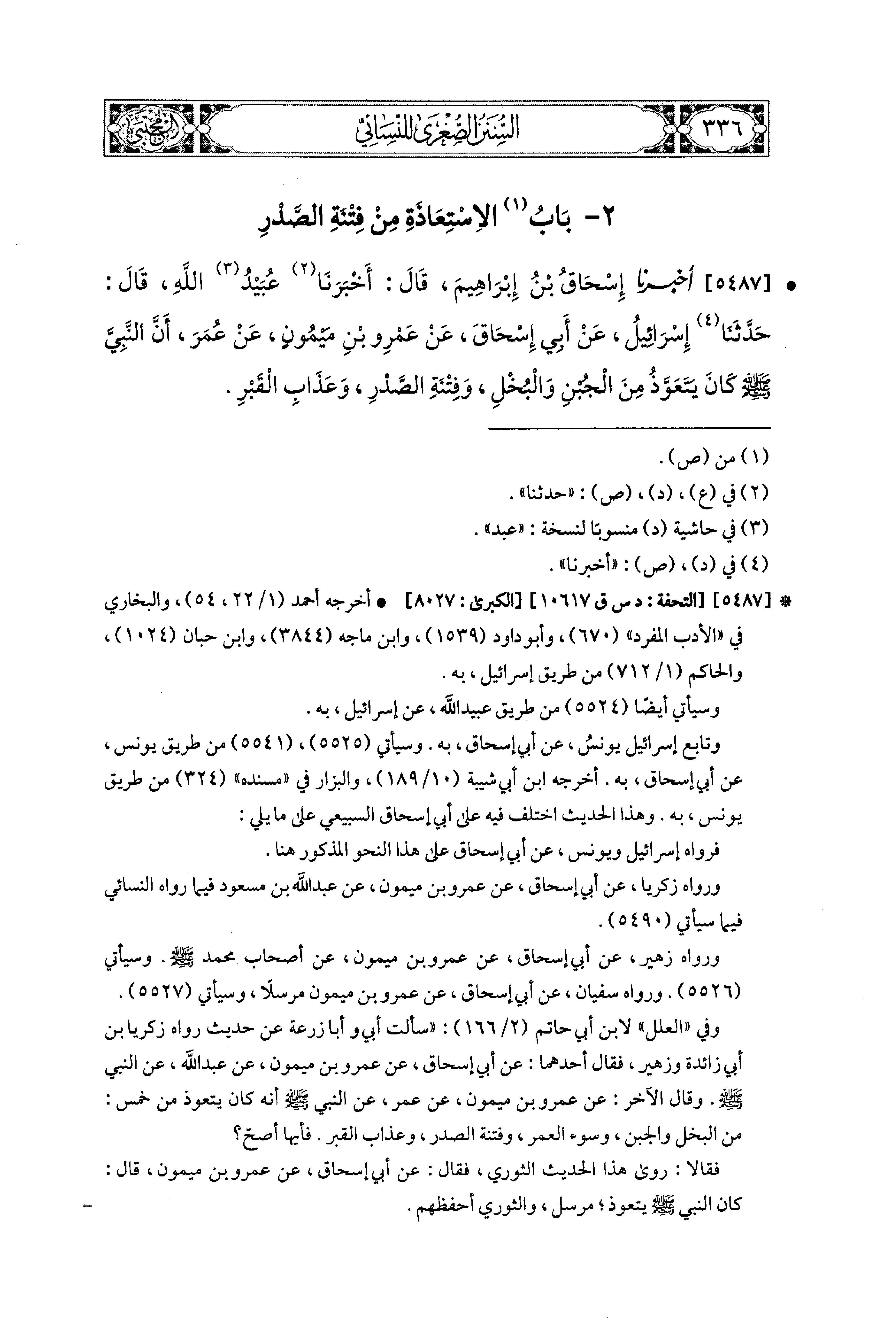 5487- أَخبَرَنا إِسحَاقُ بنُ إِبراهِيمَ، قَالَ: أَخبرنا عُبَيدُ اللهِ، قال: حَدَّثنا إِسْرَائِيلُ، عَن أَبي إِسحَاقَ، عَن عَمْرِو بْنِ مَيْمُونٍ، عَن عُمَرَ، أَنَّ النَّبيَّ صَلى الله عَليه وسَلم كَانَ يَتَعَوَّذُ مِنَ الجُبْنِ، وَالبُخْلِ، وَفِتْنَةِ الصَّدْرِ، وَعَذَابِ القَبْرِ.