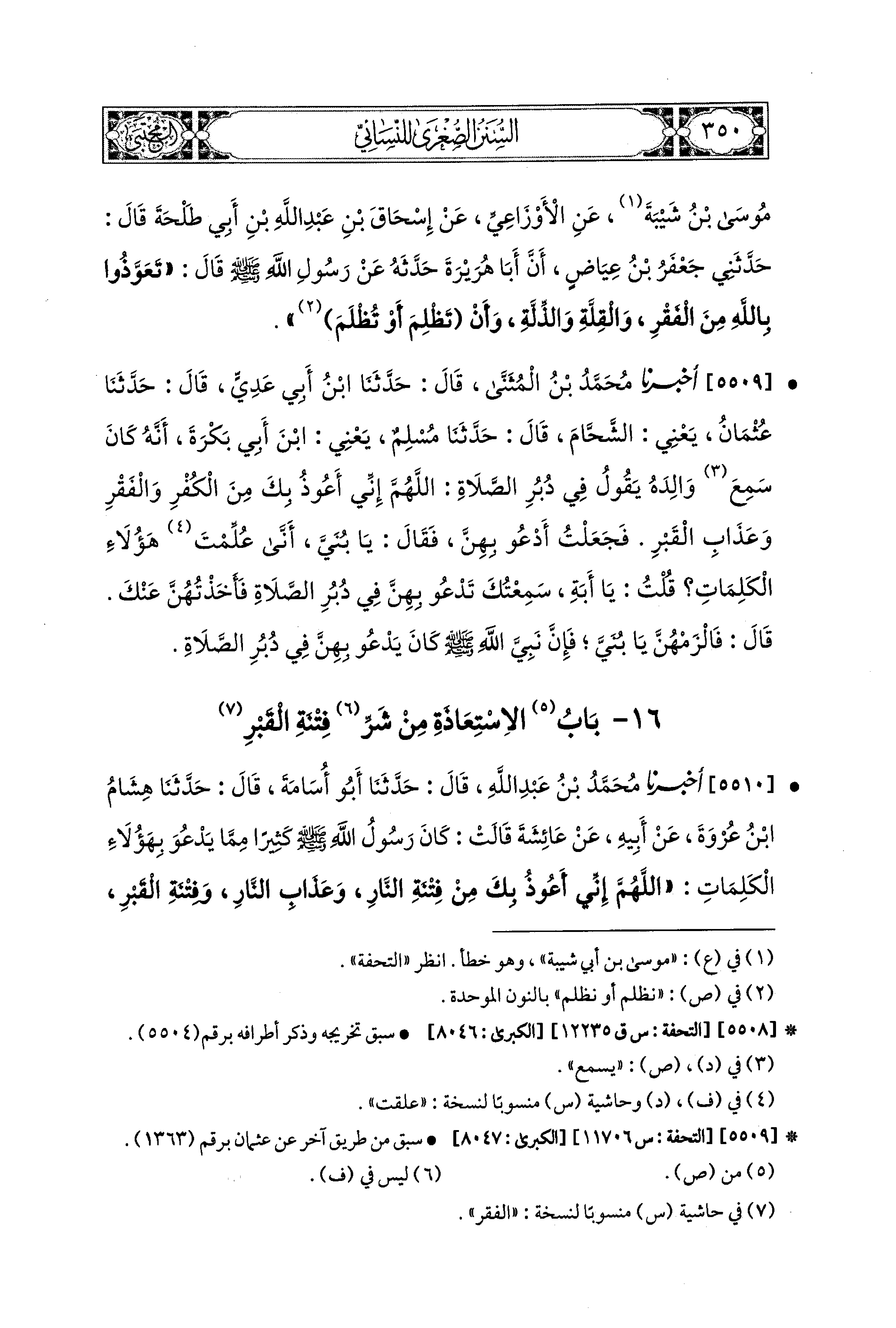 5509- أَخبَرَنا مُحَمد بنُ المُثَنَّى، قال: حَدَّثنا ابنُ أَبي عَدِيٍّ، قال: حَدَّثنا عُثْمَانُ، يَعْنِي الشَّحَّامَ، قال: حَدَّثنا مُسْلِمٌ، يَعْنِي ابنَ أَبي بَكْرَةَ، أَنَّهُ كَانَ سَمِعَ وَالِدَهُ يَقُولُ فِي دُبُرِ الصَّلاَةِ: اللهُمَّ إِنِّي أَعُوذُ بِكَ مِنَ الكُفْرِ وَالفَقْرِ، وَعَذَابِ القَبْرِ، فَجَعَلْتُ أَدْعُو بِهِنَّ، فَقَالَ: يَا بُنَيَّ، أَنَّى عُلِّمْتَ هَؤُلاَءِ الكَلِمَاتِ؟ قُلْتُ: يَا أَبَتِ سَمِعْتُكَ تَدْعُو بِهِنَّ فِي دُبُرِ الصَّلاَةِ، فَأَخَذْتُهُنَّ عَنكَ، قَالَ: فَالزَمْهُنَّ يَا بُنَيَّ، فَإِنَّ نَبِيَّ اللهِ صَلى الله عَليه وسَلم كَانَ يَدْعُو بِهِنَّ فِي دُبُرِ الصَّلاَةِ.
